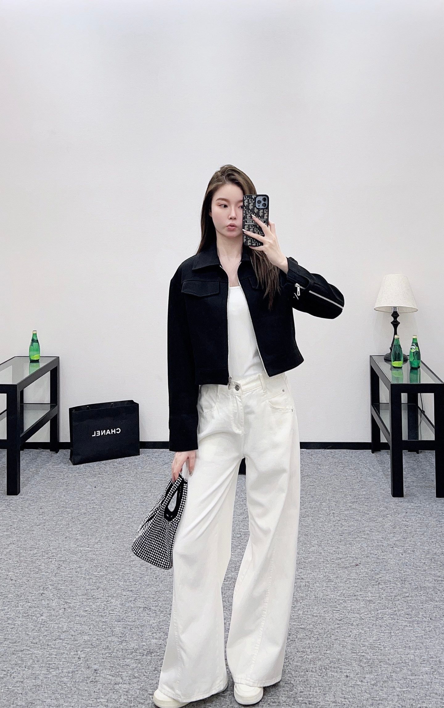 Made of high-quality silk and wool material, comfortable to wear, with a lapel zipper jacket and a chest flap pocket decorated with contour lines, enriching the visual experience. The short jacket cut highlights the overall line. Two sleeve back zipper adjustment, making the outfit more trendy and versatile, fashionable and stylish