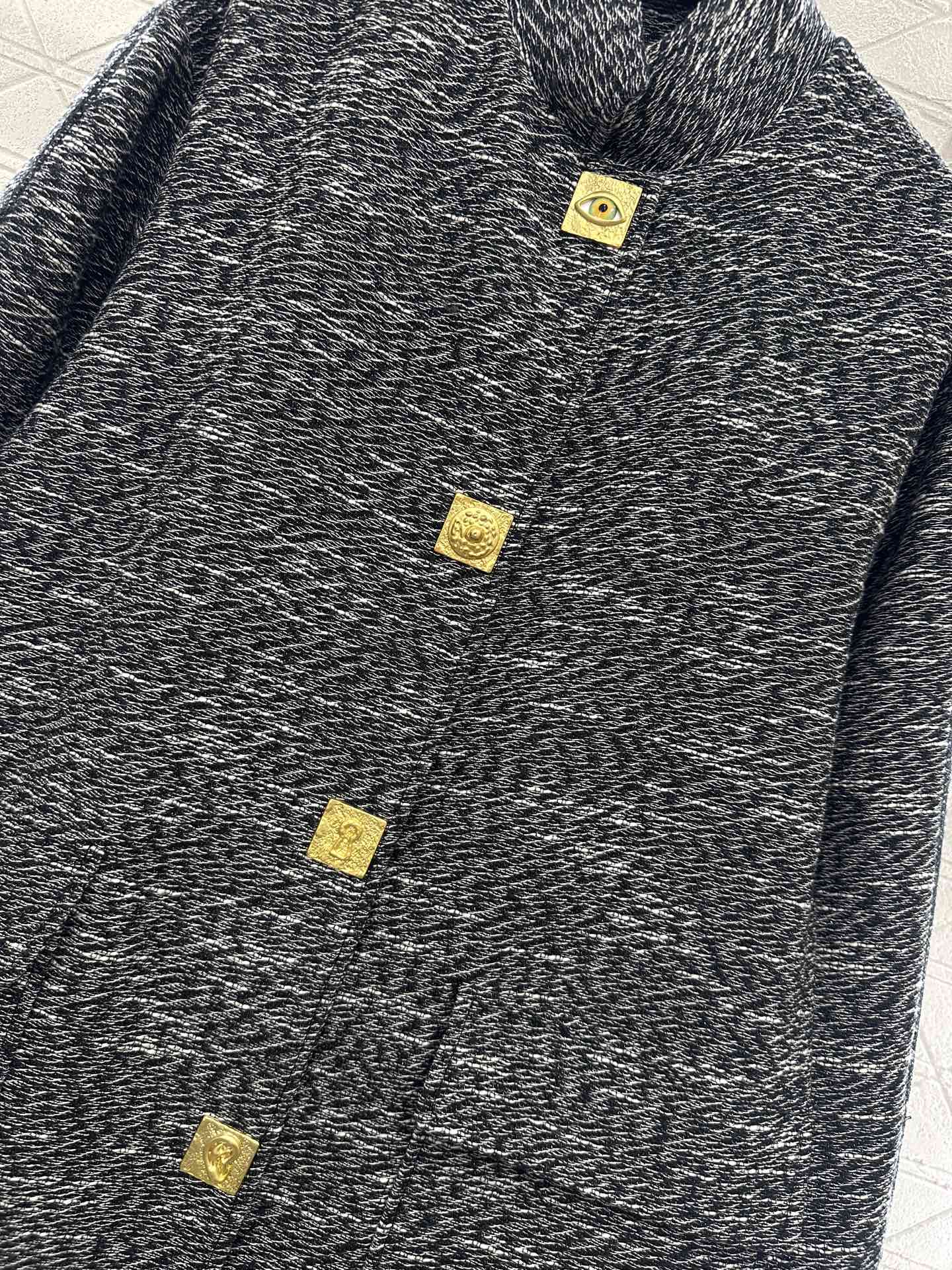 Made of imitation wool material, with excellent texture and appearance, this long collared woolen coat features a timeless and minimalist style, adorned with single row multi style molded and engraved large round buttons, creating a fashionable and luxurious atmosphere. The flip pocket is rich in layers, and the floral gray color scheme highlights the brand's style. It is stable and versatile, with no restrictions on style. The loose cocoon shaped silhouette complements and accommodates the body, creating a luxurious and relaxed atmosphere for autumn and winter