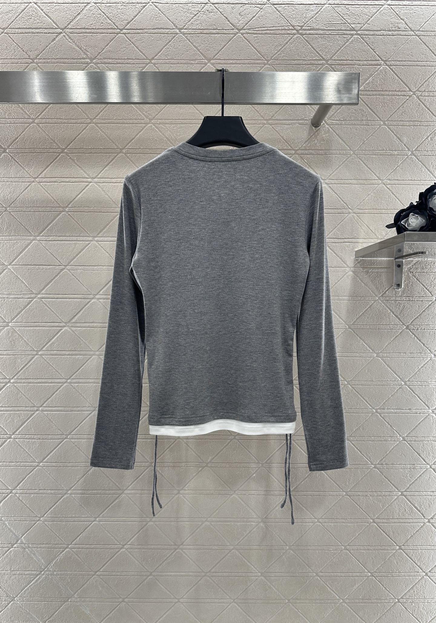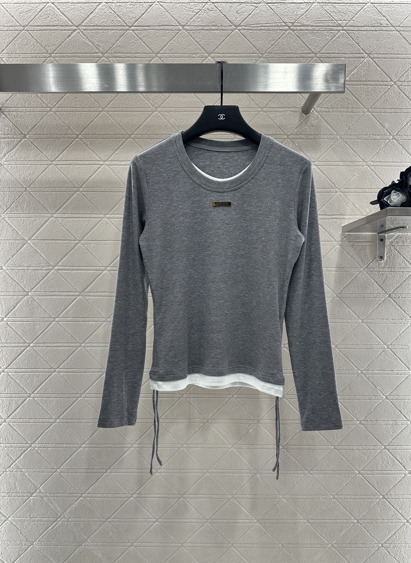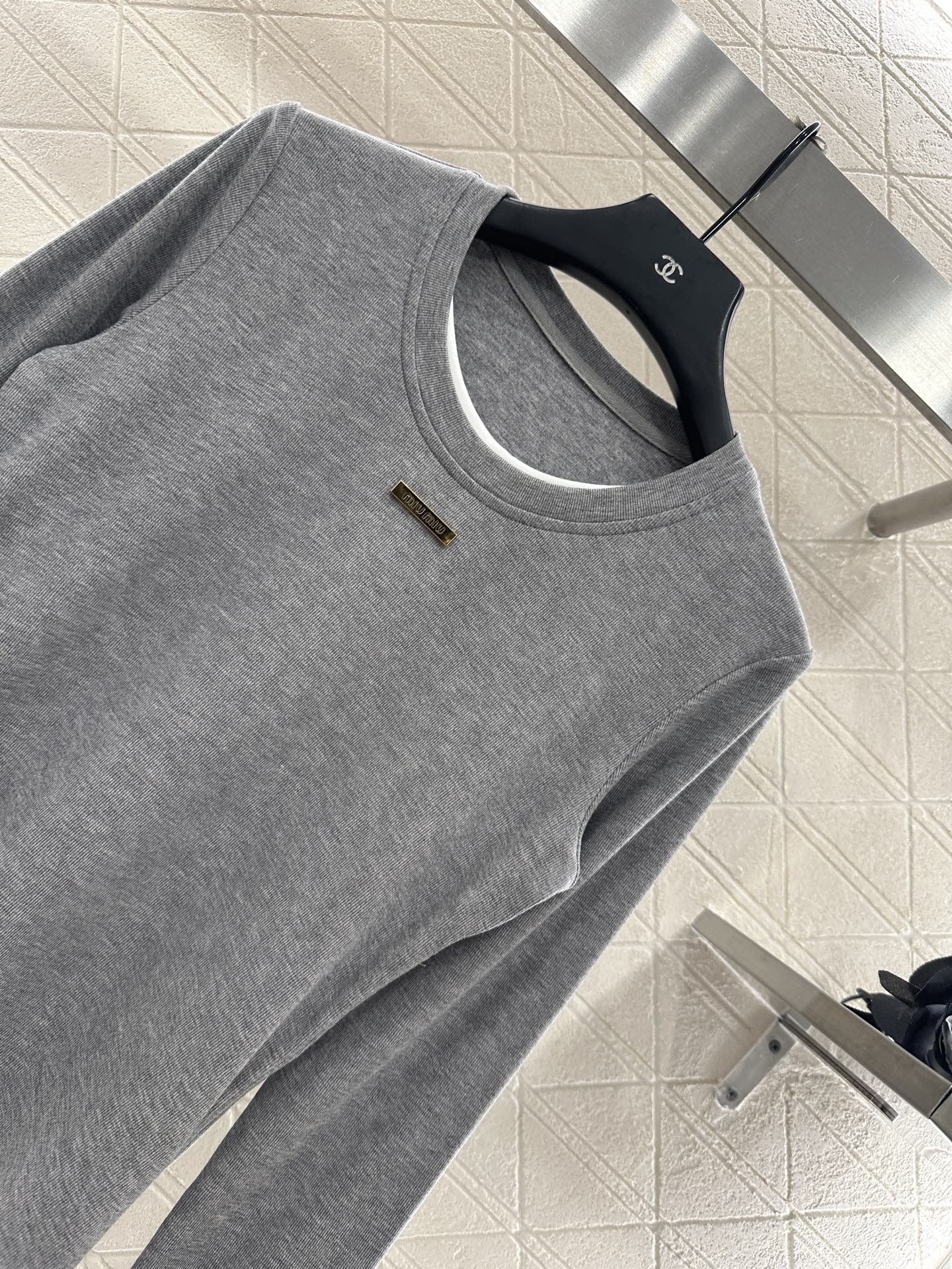 Cotton and wool material, skin friendly and breathable, full of elasticity, round neck fake two-piece contrasting splicing, collar hem revealing added layering, transforming into a Korean drama female lead, with tight waist drawstrings on both sides, highlighting the waistline curve, stylish and western-style. Adorned with a letter square logo on the chest, showcasing the brand's tone, paired with a mid to long half skirt from the same series, with a slit skirt to get rid of bulkiness. It is fashionable to wear it alone or layered in autumn and winter, making it easy to drive for daily commuting