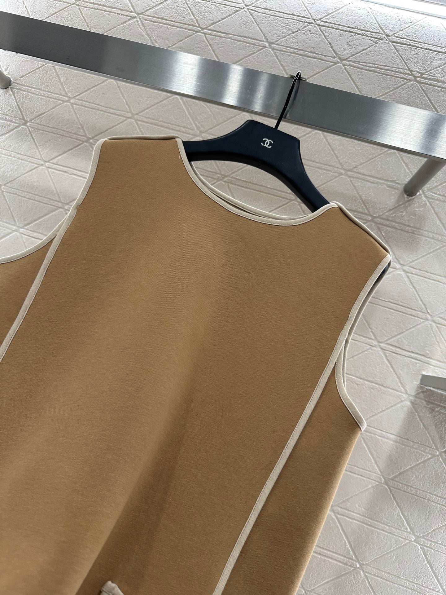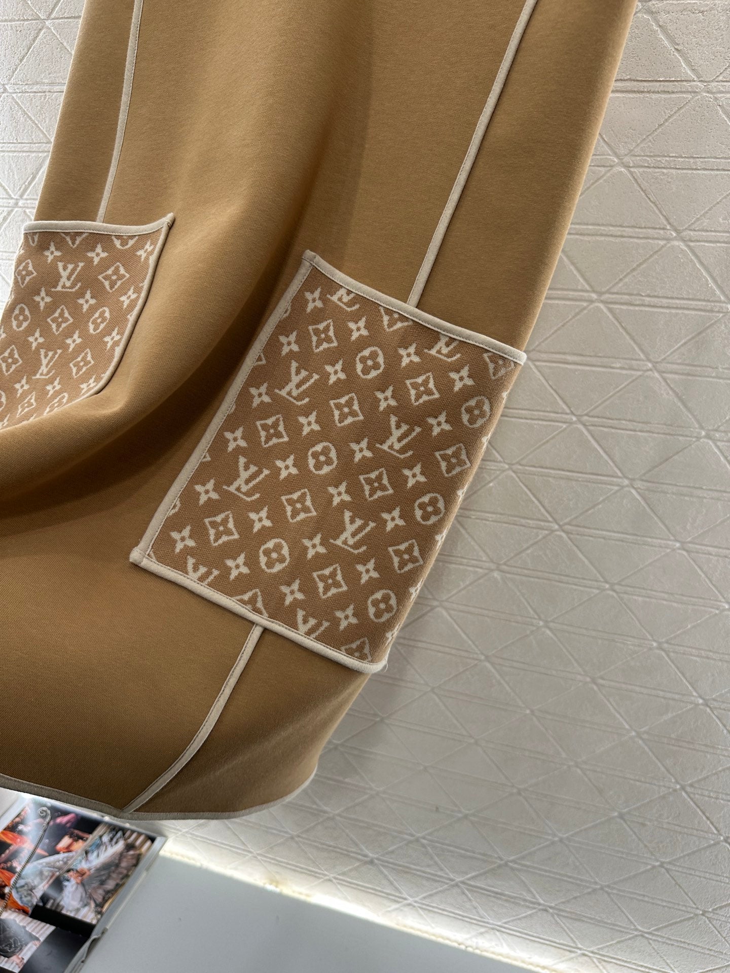 Cotton polyester blend material, processed with composite technology, with a glossy texture and comfortable thickness. The vest skirt is cut, and the overall solid color is highlighted by the tied edge contour line, which enhances the delicacy with details. The pocket collides with the four leaf clover letter jacquard design, and the three-dimensional cutting adds a neat feeling. The loose straight tube skirt is exquisite and charming