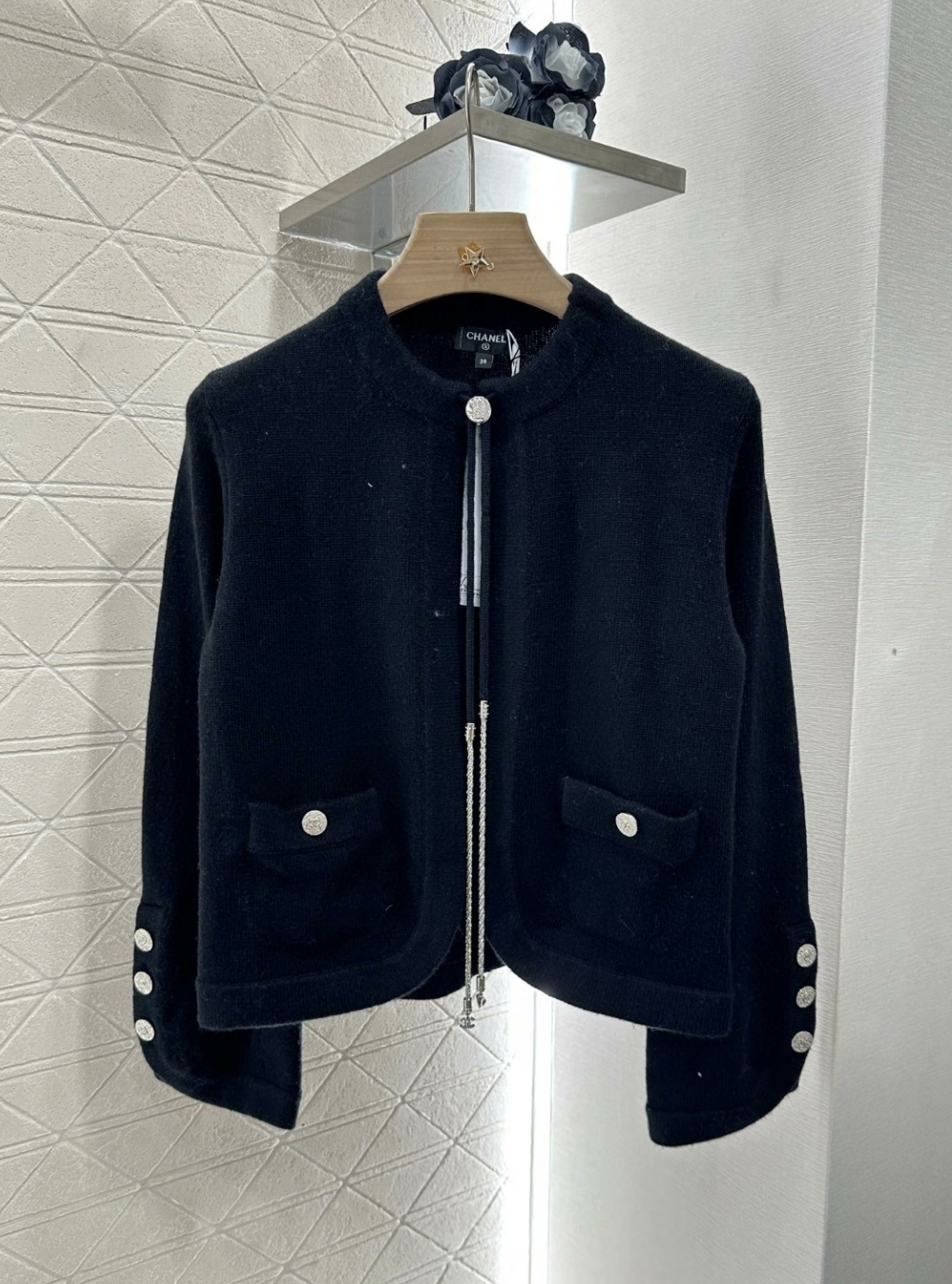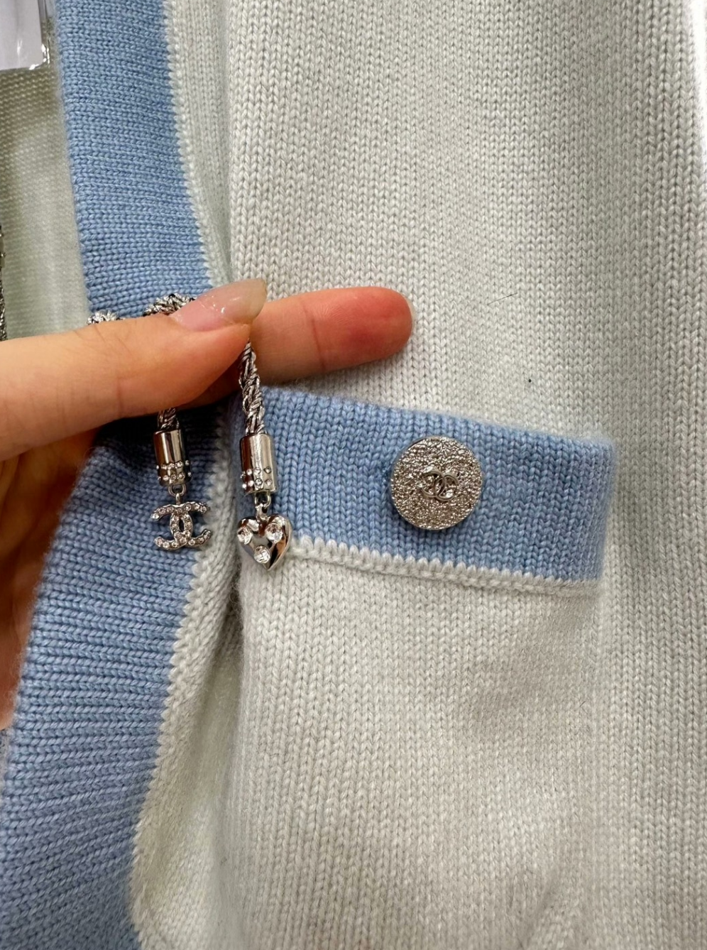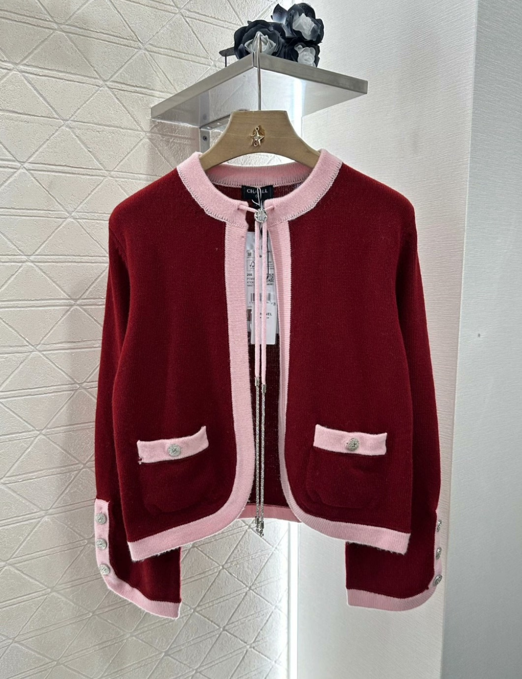 Cashmere yarn weaving, high-quality texture, comfortable and soft, round-neck knitted cardigan, fine crochet texture throughout, large body with contrasting colors, threaded edging, elegant and lazy temperament, rhinestone buckle and bow tie decoration on the chest, lightly highlighting the perfect detail texture, exquisite and stylish, loose version, tolerant and relaxed, making the outfit elegant and literary, versatile style, regular version with straight shoulders, fashionable and casual