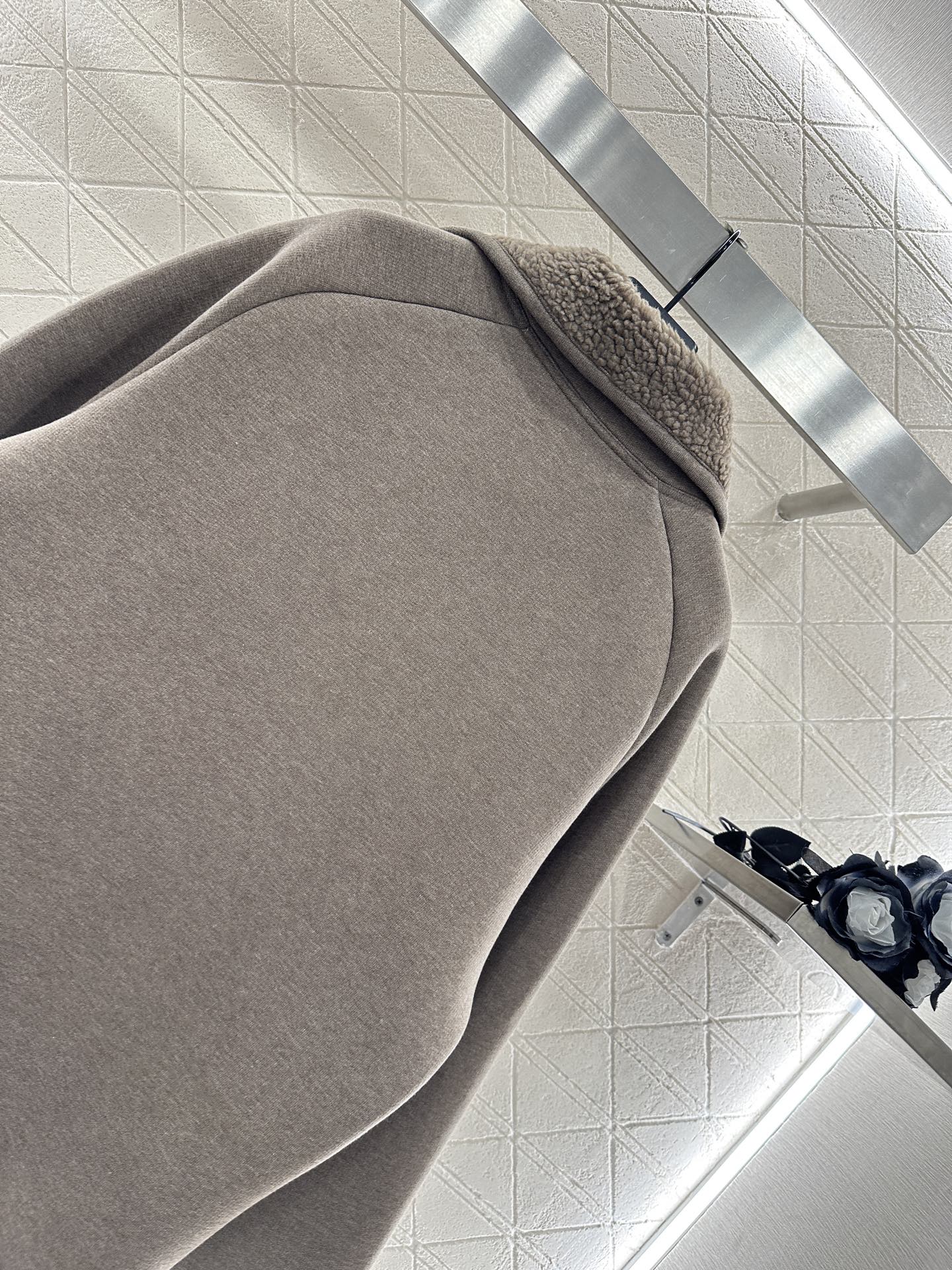 The outer layer is made of virgin wool material, and the inner layer extends to the lapel decoration with teddy plush material. The texture is soft, comfortable, fashionable, and stylish. The lapel jacket is cut with a zipper ➕ The black thread edging on the hem and cuffs, combined with the letter logo at the waist, fully showcases the brand style. The overall silhouette is upright, loose fitting, and has a furry texture