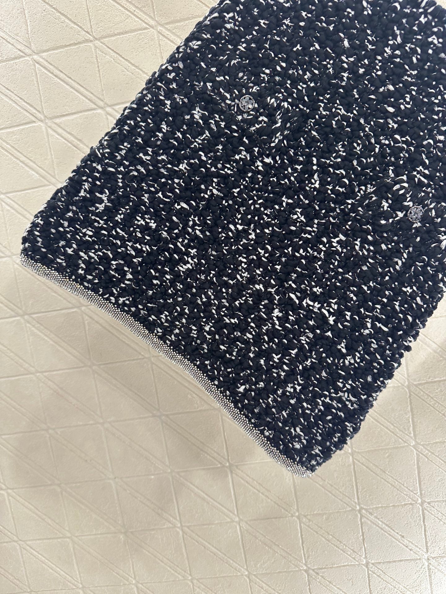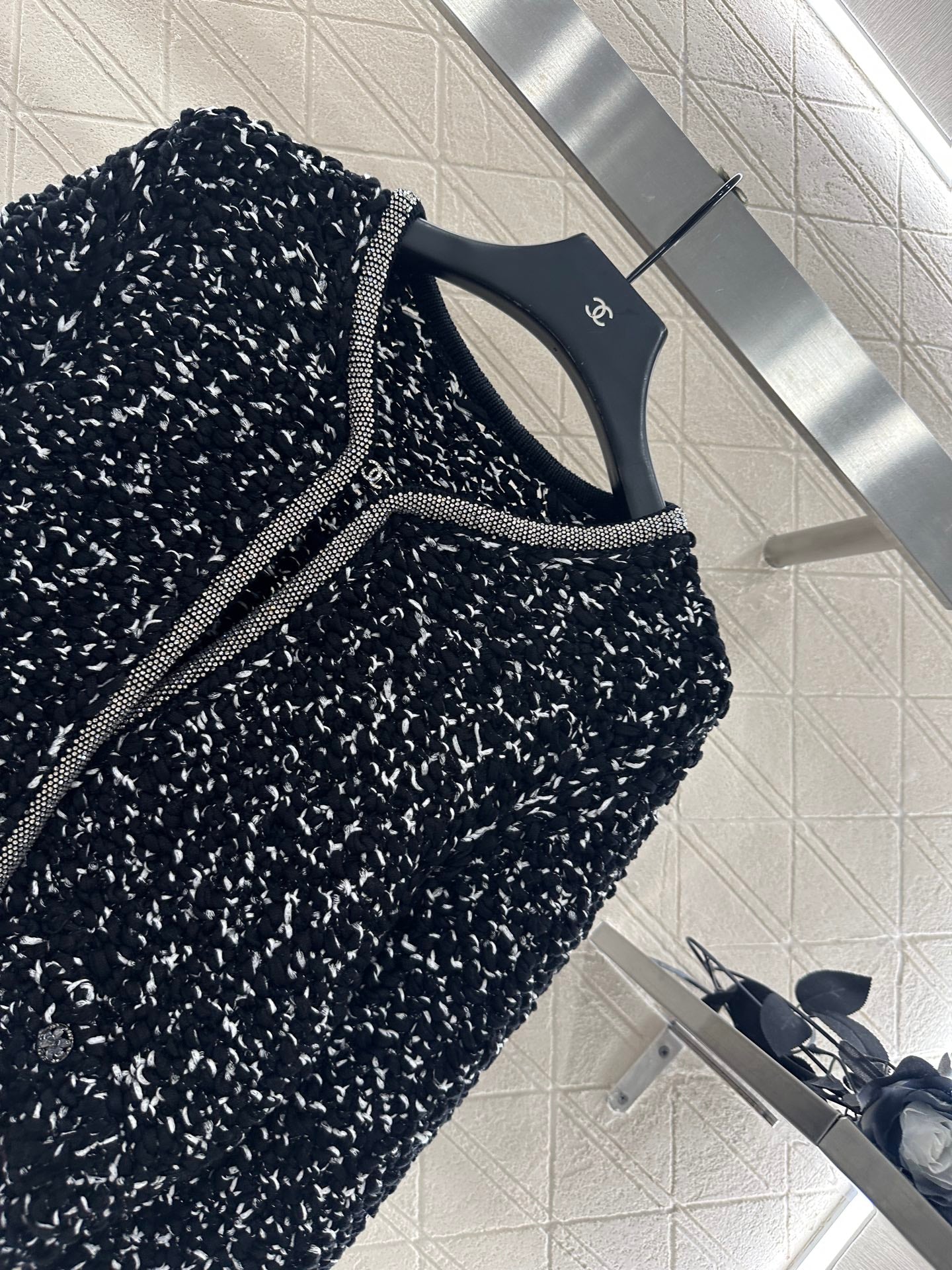 Cotton yarn weaving, comfortable to wear, soft and delicate. Round neck knitted cardigan paired with half skirt set, embellished with rhinestone tied edges ➕ Pocket camellia placket design, double gorgeous to showcase brand tone. The finished garment is woven with a dense texture and crochet, with solid colors combined with wavy hair particles. The black and white contrasting colors are durable and gentle. Paired with a hip hugging straight tube short skirt of the same series, it accommodates the body shape and improves the proportion. The water diamond edge of the skirt echoes, showcasing a retro style temperament and adding an elegant touch to the upper body. The exquisite and stylish feeling is fully displayed, suitable for both dating and commuting