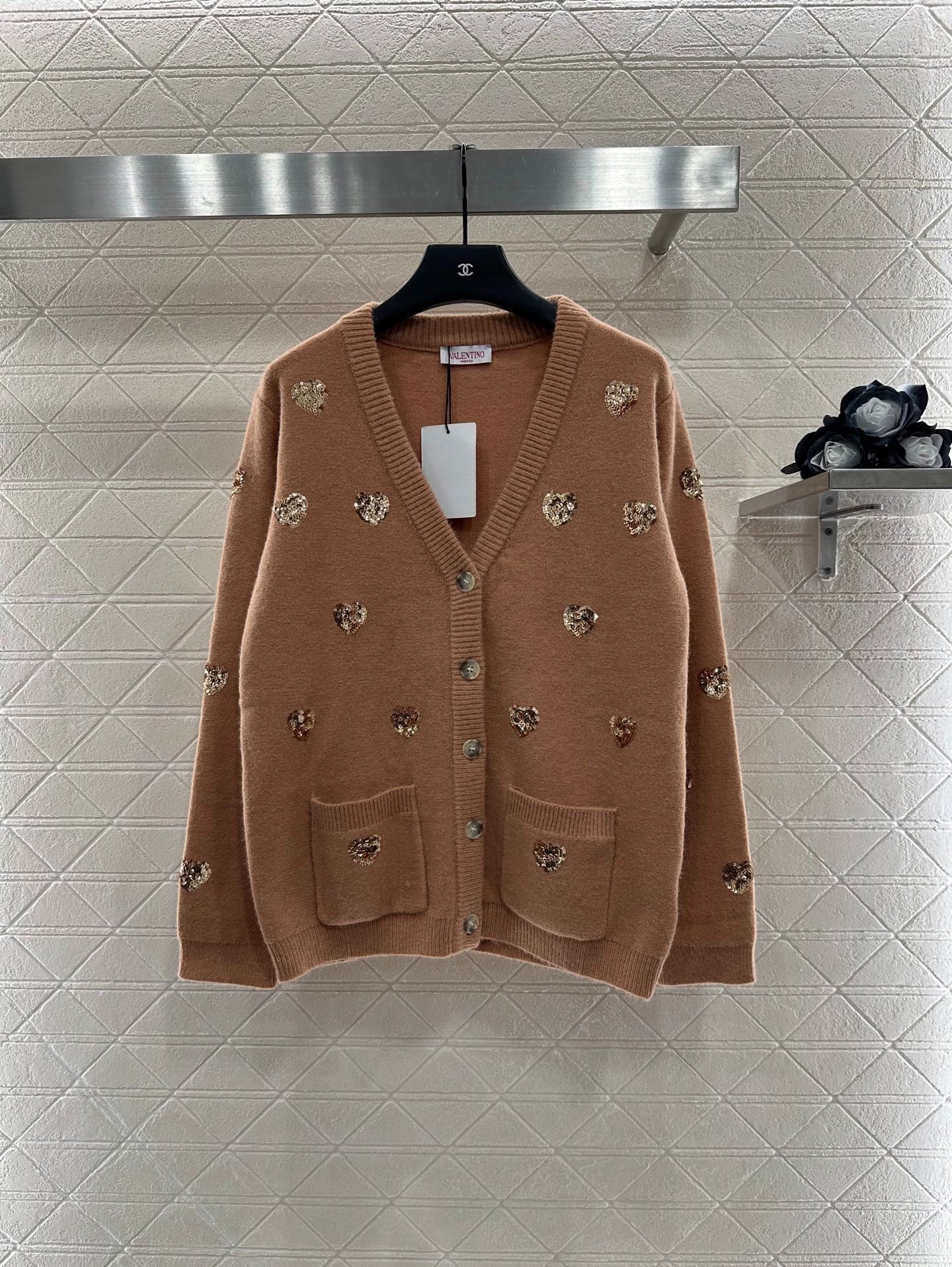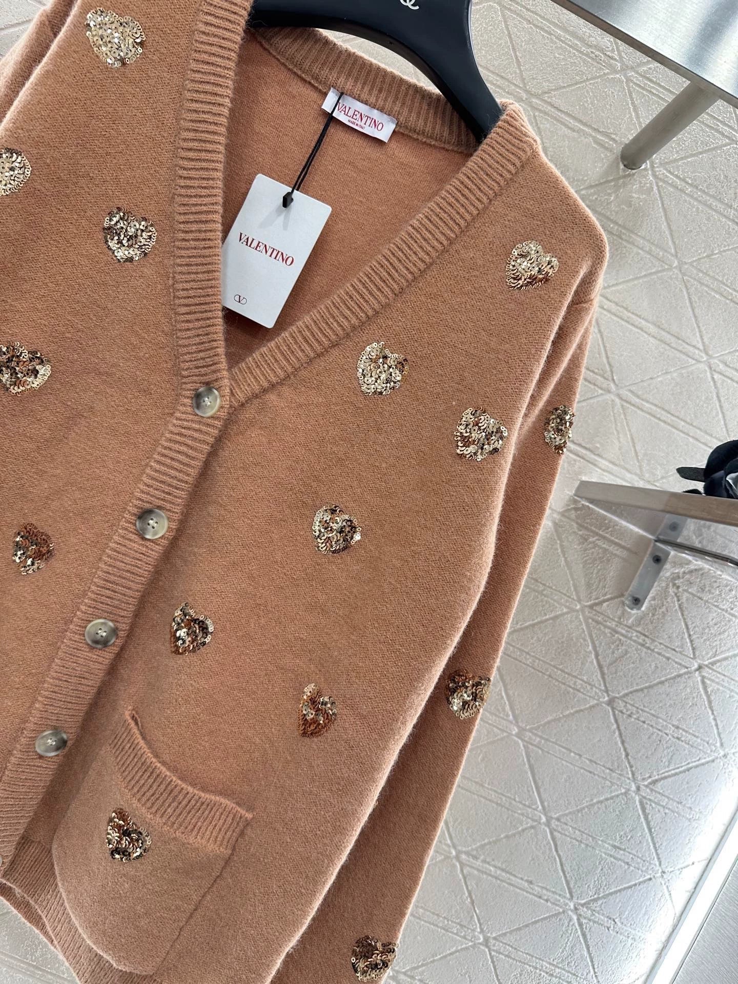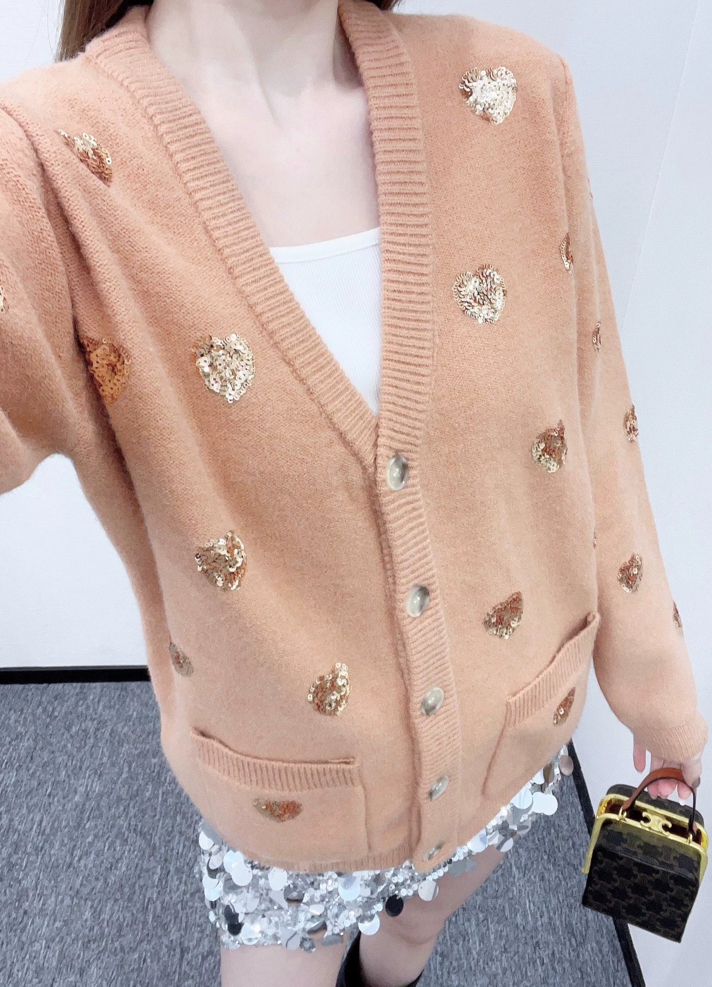 Wool yarn weaving density fine needle weaving clear wool texture comfortable skin friendly V-neck off shoulder cardigan cut irregular distribution heart pattern completed with fine sequin embroidery technology, folded and emitted gorgeous light to create a lazy and relaxed feeling leader's mouth hem thread closure elastic full color matching rich design layering style inclusive of body shape fashionable wearing style