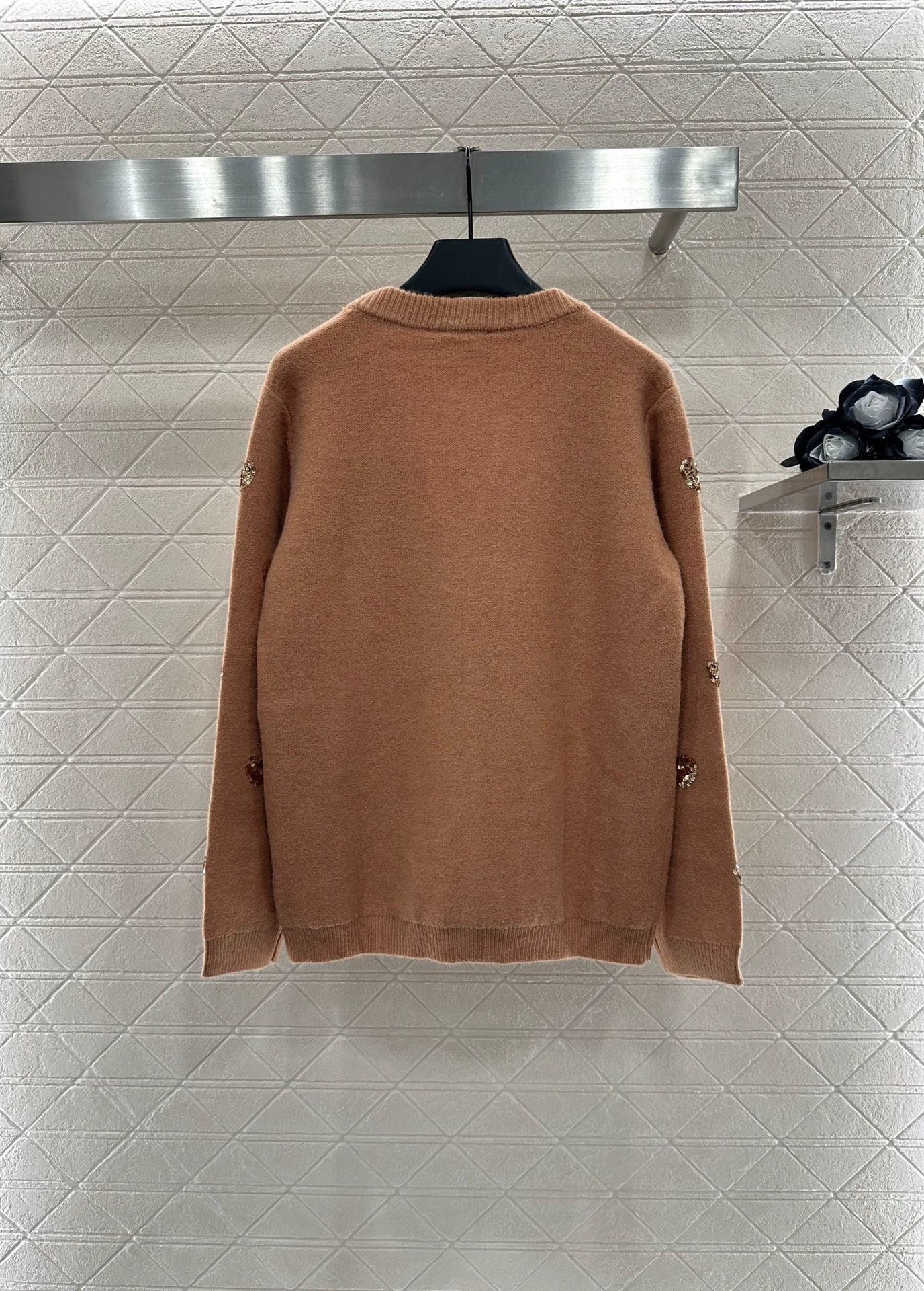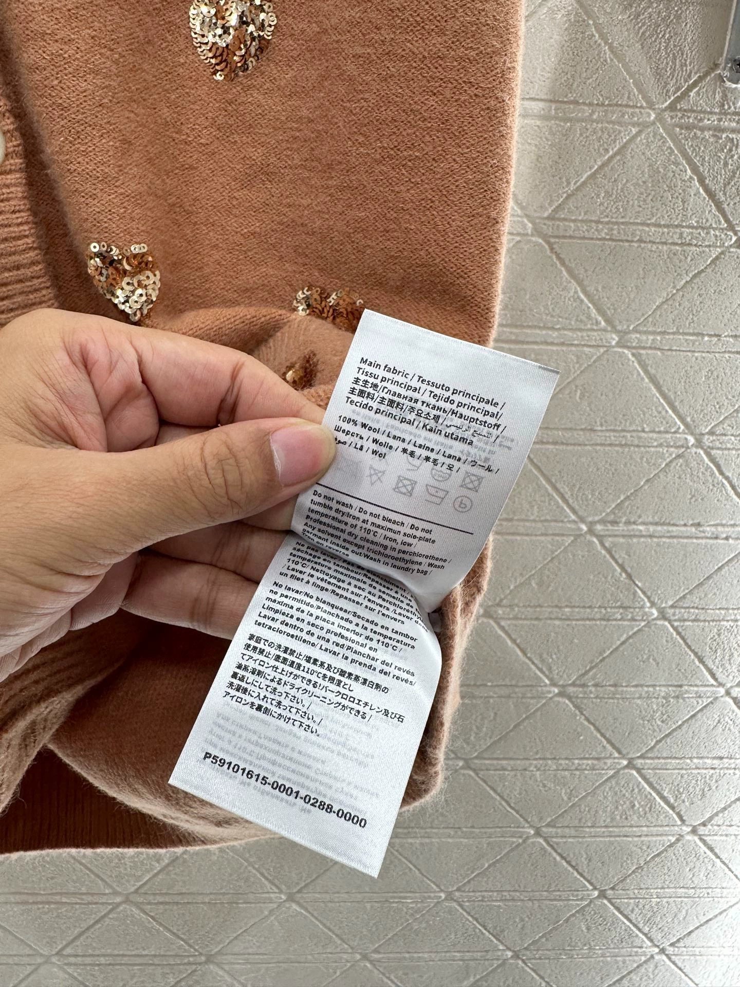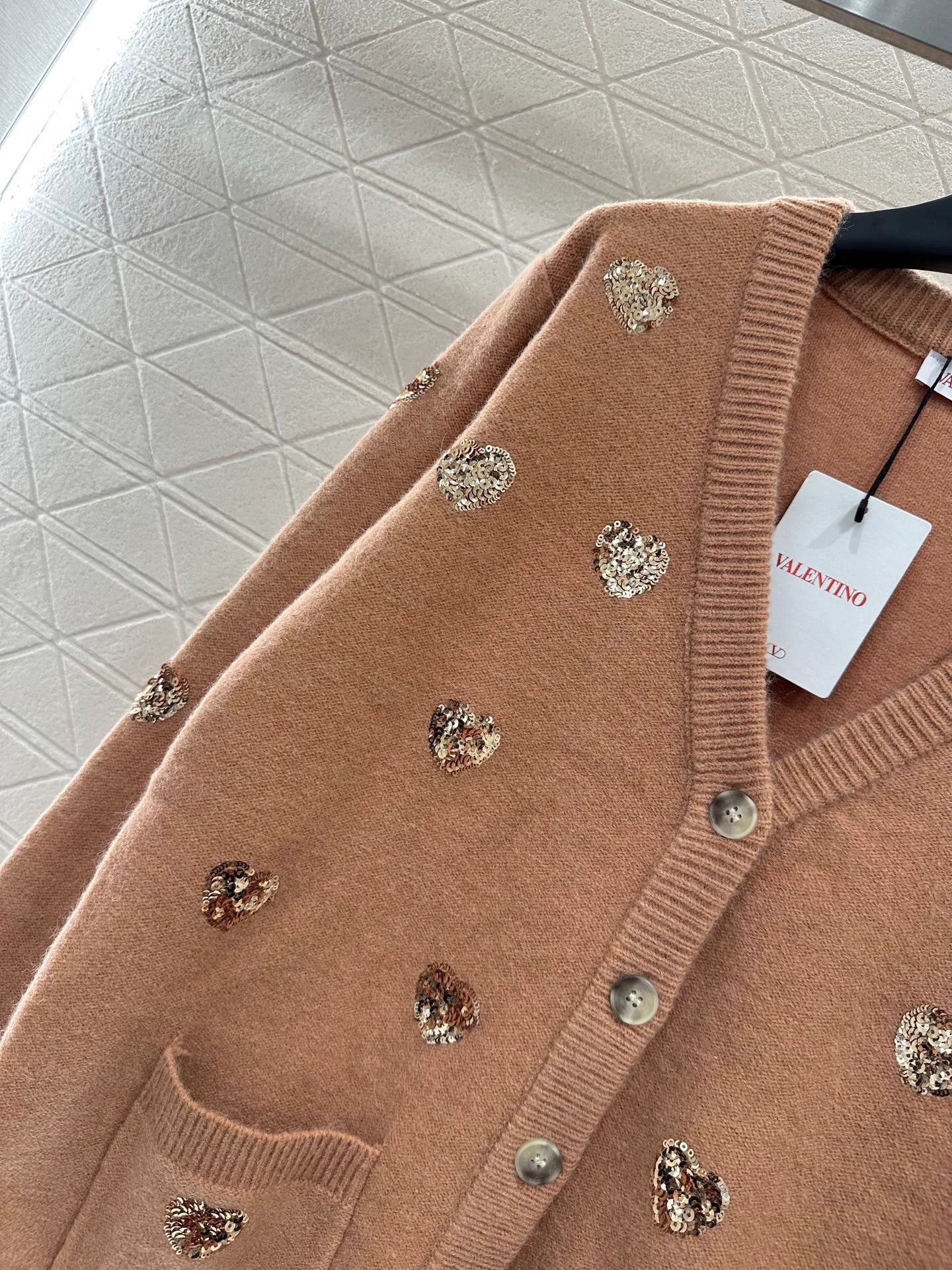 Wool yarn weaving density fine needle weaving clear wool texture comfortable skin friendly V-neck off shoulder cardigan cut irregular distribution heart pattern completed with fine sequin embroidery technology, folded and emitted gorgeous light to create a lazy and relaxed feeling leader's mouth hem thread closure elastic full color matching rich design layering style inclusive of body shape fashionable wearing style