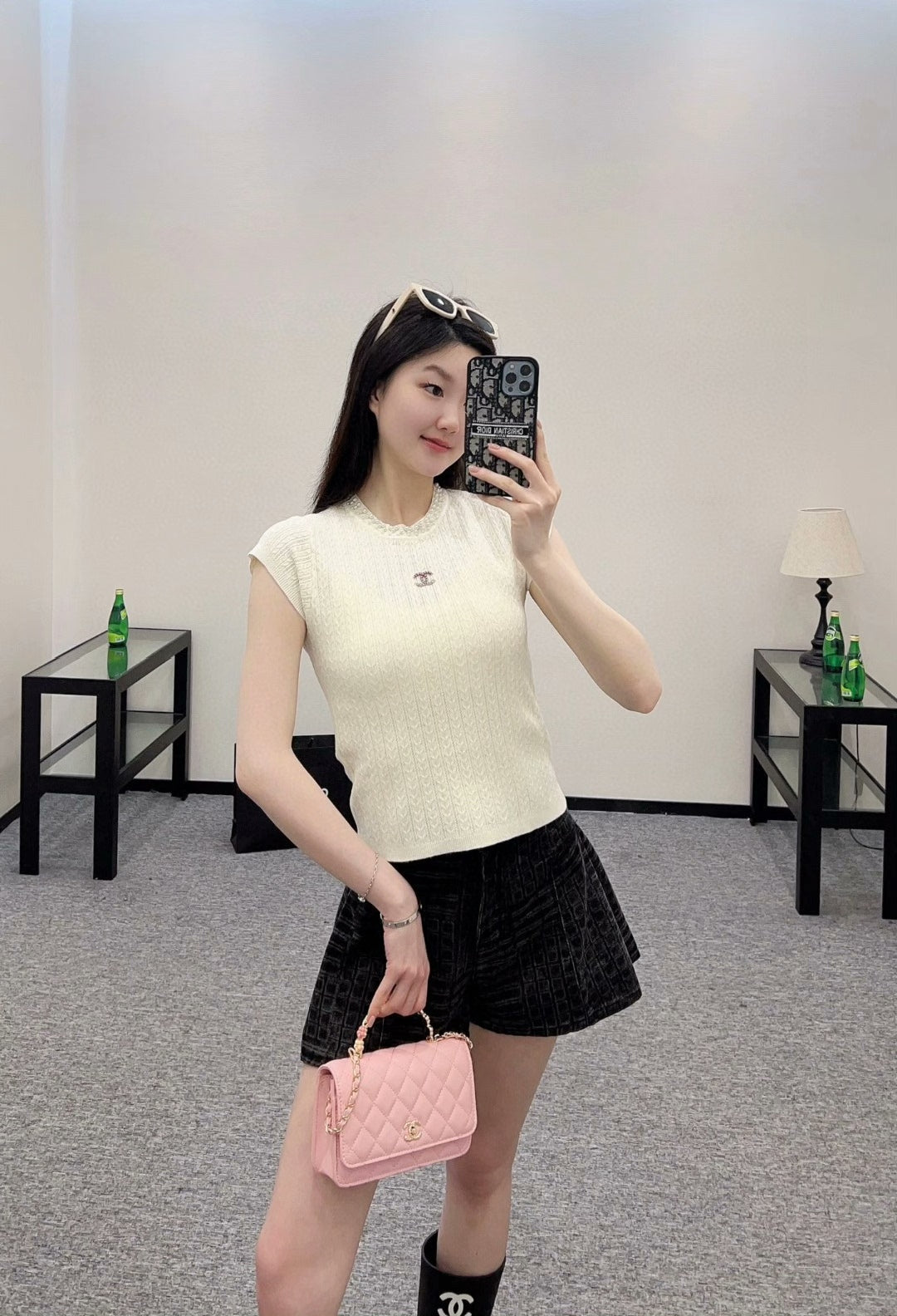 Wool yarn weaving, stretch and comfortable, full of texture. Short-sleeved top cut. Made of wool material with stretch to create a slimming visual effect. Delicate vertical twist texture throughout. The neckline is embellished with pearl sewing and beading. The design highlights turn simple basic styles into fashionable items in seconds. Silver thread is integrated to highlight the high-end style. It is stylish when worn alone or with an inner layer.