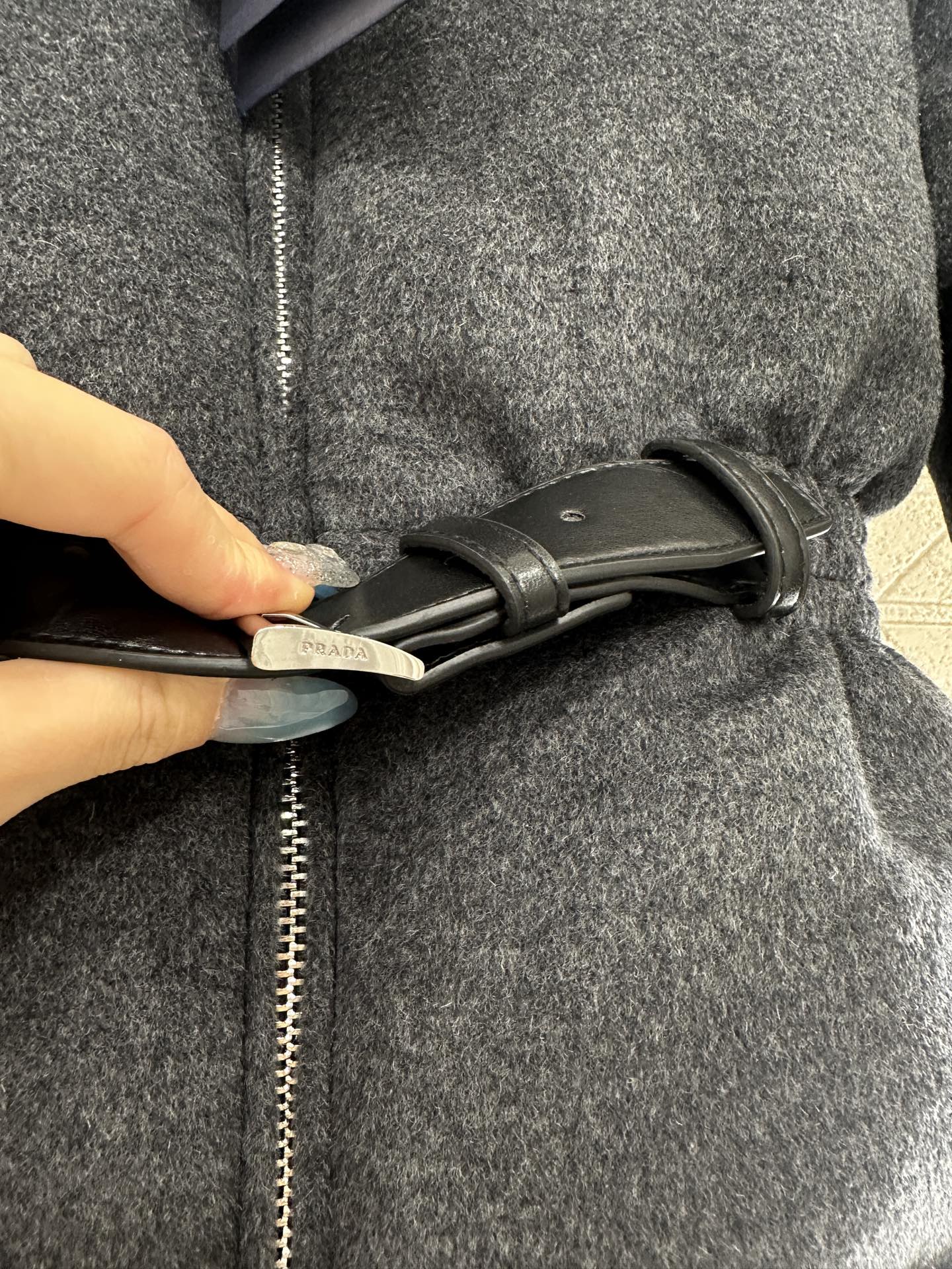 Made of all wool material, with white goose down filling inside, the whole piece is lightweight and warm. The stand up collar and lapel are paired with a slim down jacket, which is warm and not bulky, and has stronger wearability. The classic rectangular grid texture is matched with the classic triangular letter logo, presenting a high-end style and taste. The waist is wrapped with elastic splicing belt design, which is different from the large version, integrating warmth and fashion, getting rid of the traditional down bulky. It is the first choice for autumn and winter layering.