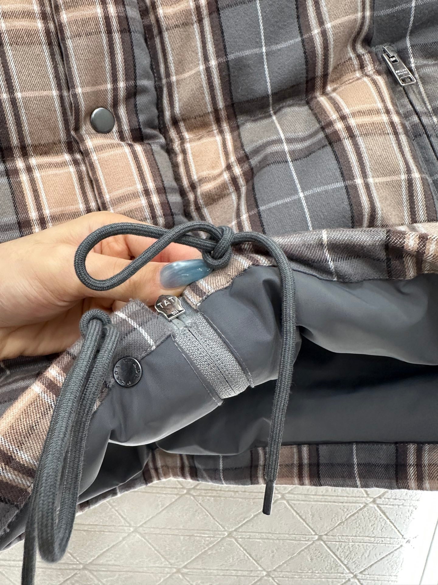 Made of all cotton plaid material and reinforced with nylon material, the insulation performance is directly stretched out. The white goose down filling inside makes the whole piece lightweight and warm. The zipper pocket is in a vest shape, and the elasticity is adjustable. Rectangular grid embossing ➕ Grid contrasting color design, combining warmth and fashion, paired with a drawstring at the hem, breaking away from traditional bulky feeling, preferred for layering in autumn and winter,
