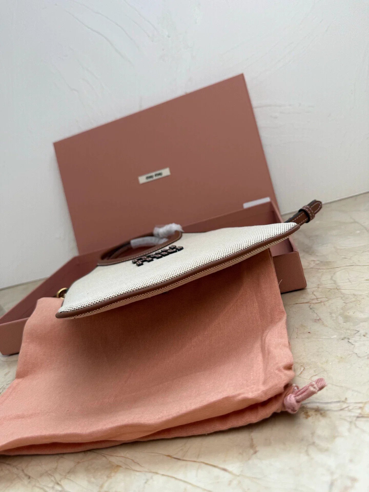 Off-white with brown leather trim, with original dust bag and box. Made of canvas with cowhide trim, with exquisite logo embroidery, can be carried by hand or crossbody, perfect for daily commuting with a cell phone or lipstick.