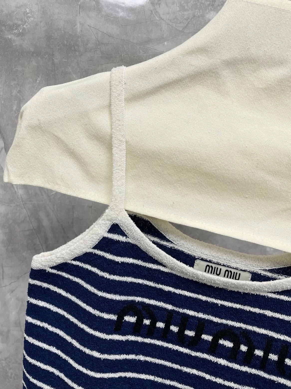 25 Summer new dark blue striped sweater suspender top + skirt set
