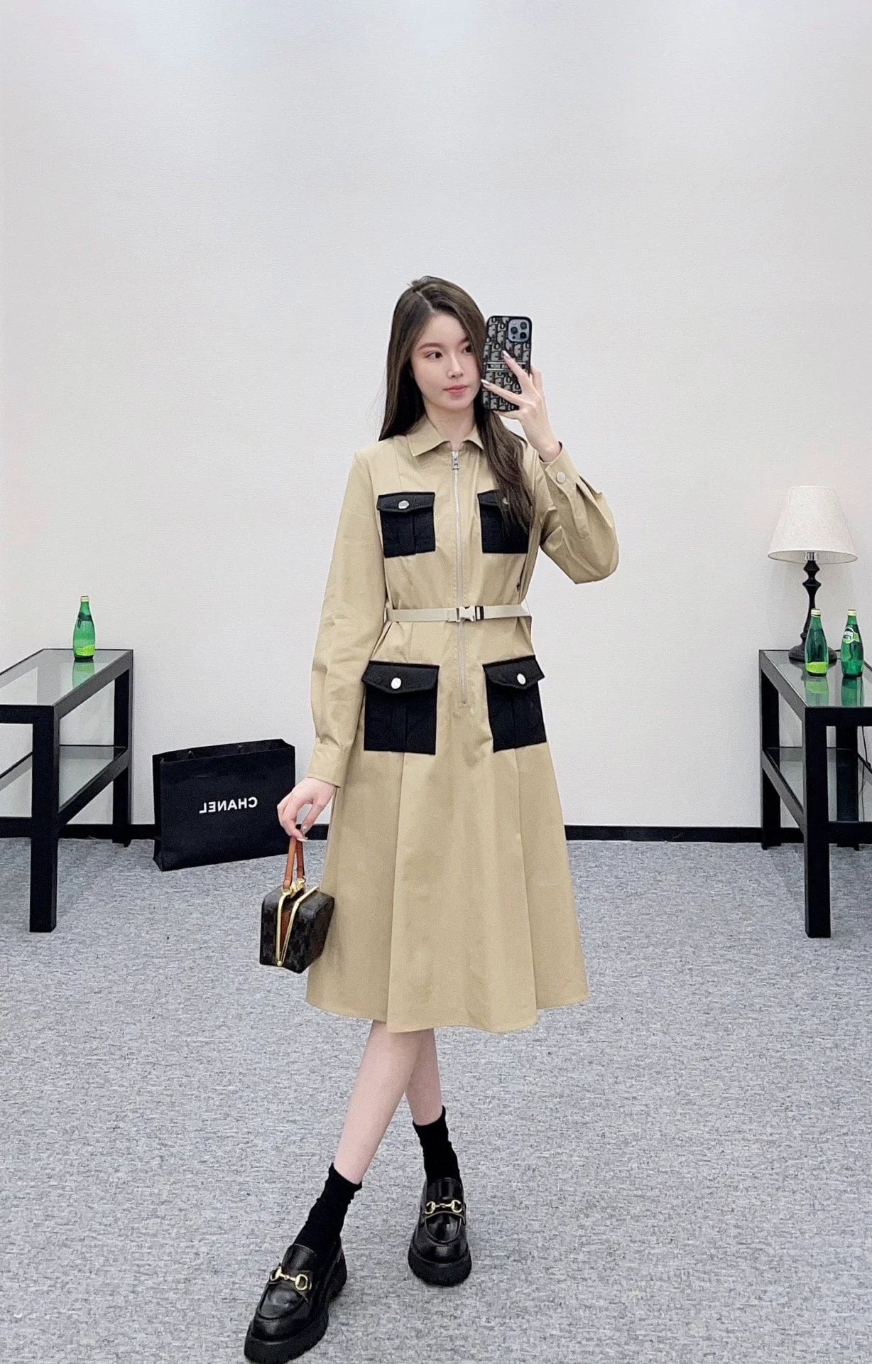 Tencel cotton material, premium texture, comfortable drape, semi open zipper dress design, neat and slim cutting, waist standing cut for a slimming effect, matched with a waistband outline, highlighting the proportion advantage of short top and long bottom, bee logo at the waist highlights the brand's delicacy, multiple symmetrical pockets are decorated with contrasting colors, the skirt is neat and pleated, and the upper body is full of fashionable workwear atmosphere. The dress can be easily worn for daily commuting and vacation, creating a stylish look