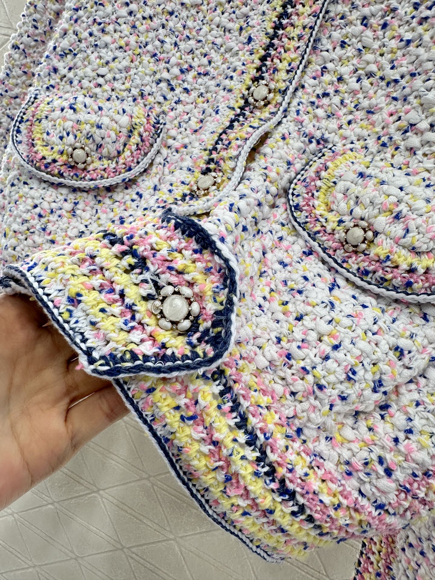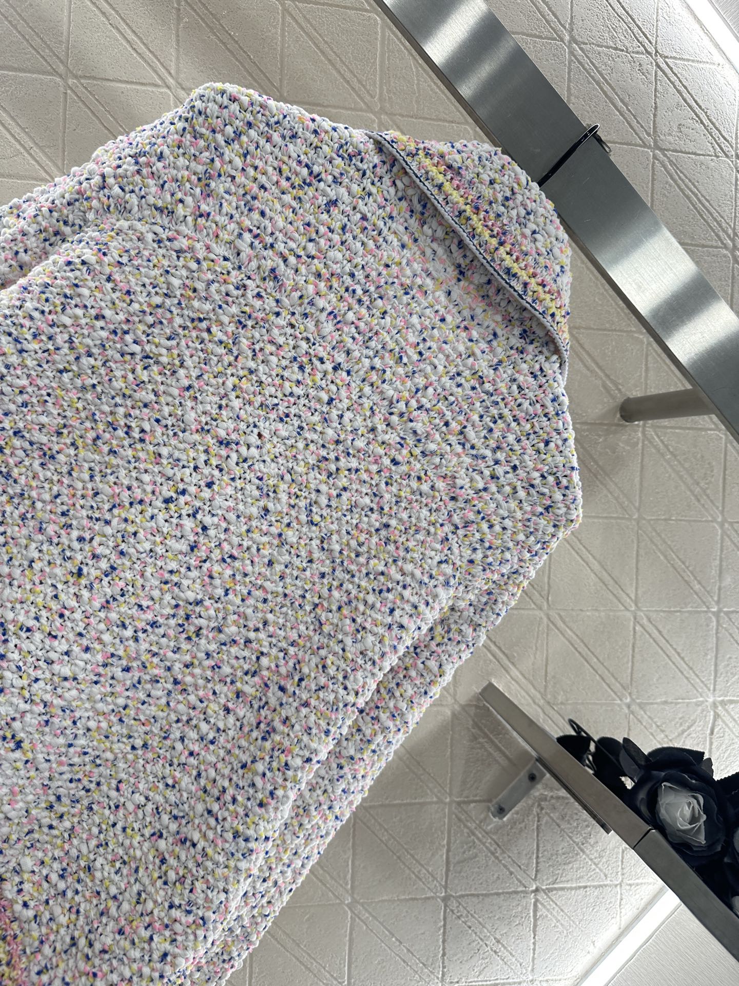 Cotton and wool yarn weaving is soft, sticky, thick, and skin friendly. The regular pattern is matched with a long sleeved lapel cardigan, and the cutting is full of three-dimensional color stripes. The edging color is coordinated with the large body color dot weaving line, and the camellia shaped placket adds a sense of layering. The finely engraved letters enhance the sense of luxury. The single wear interior looks fashionable and stylish