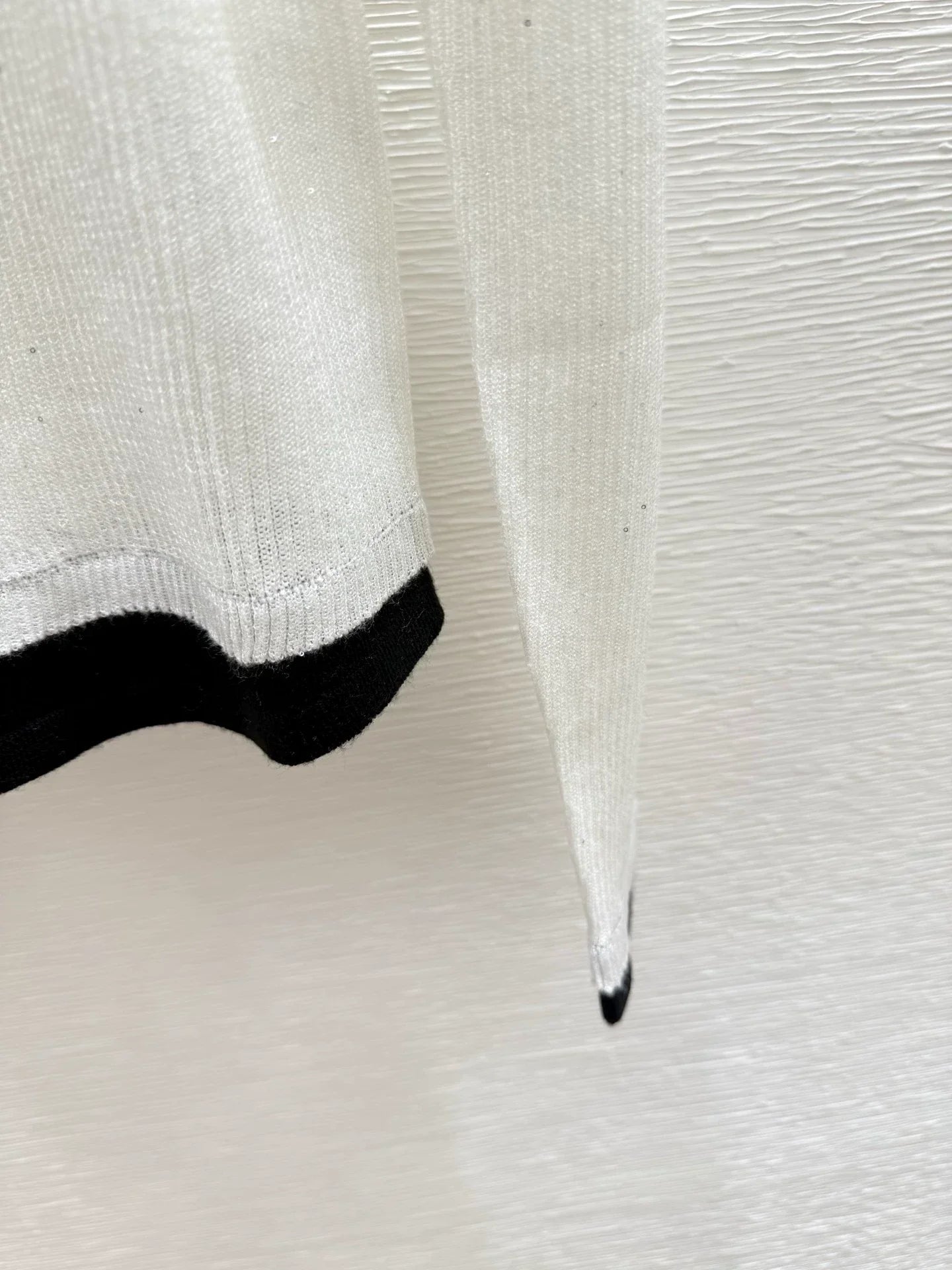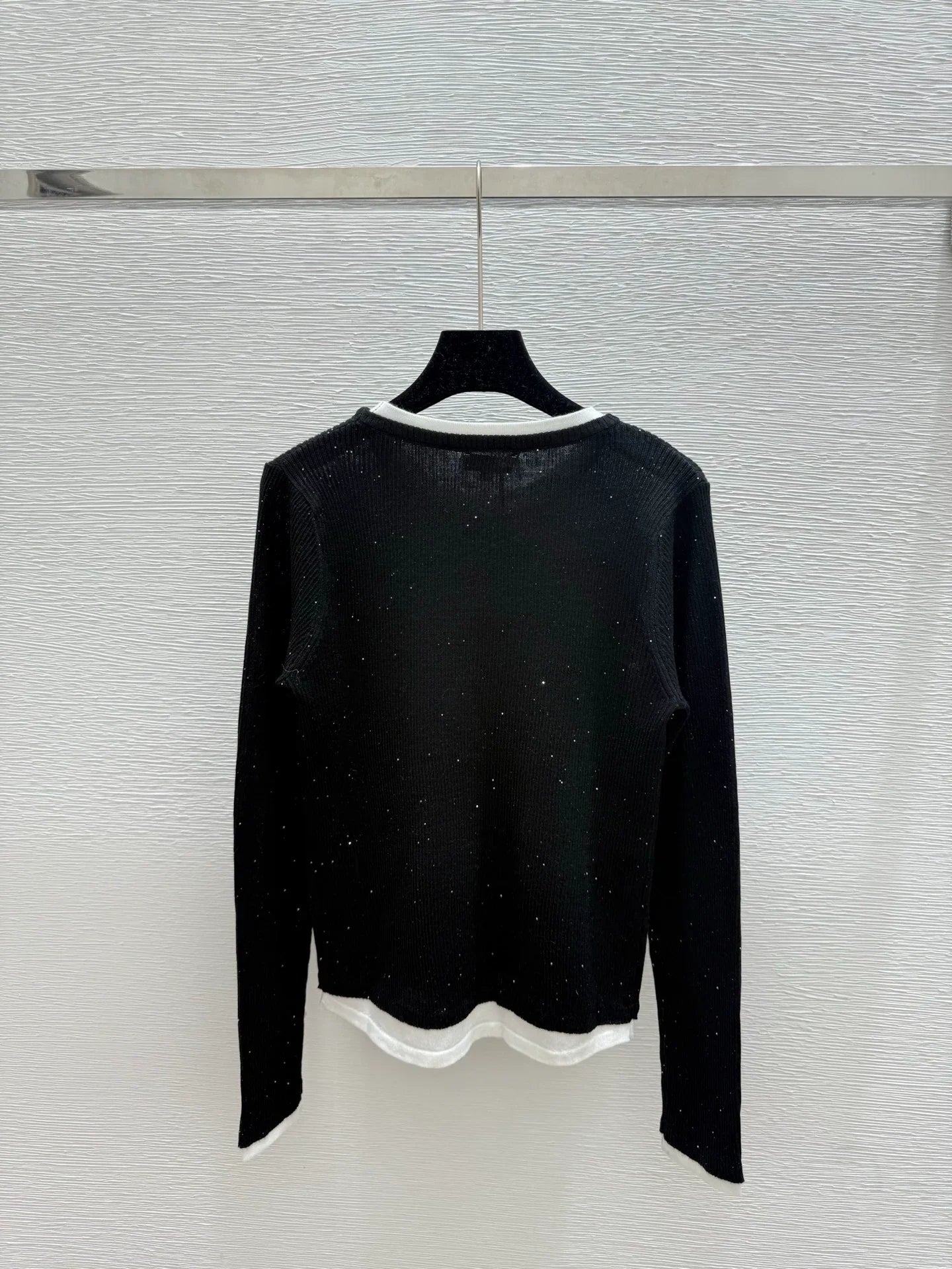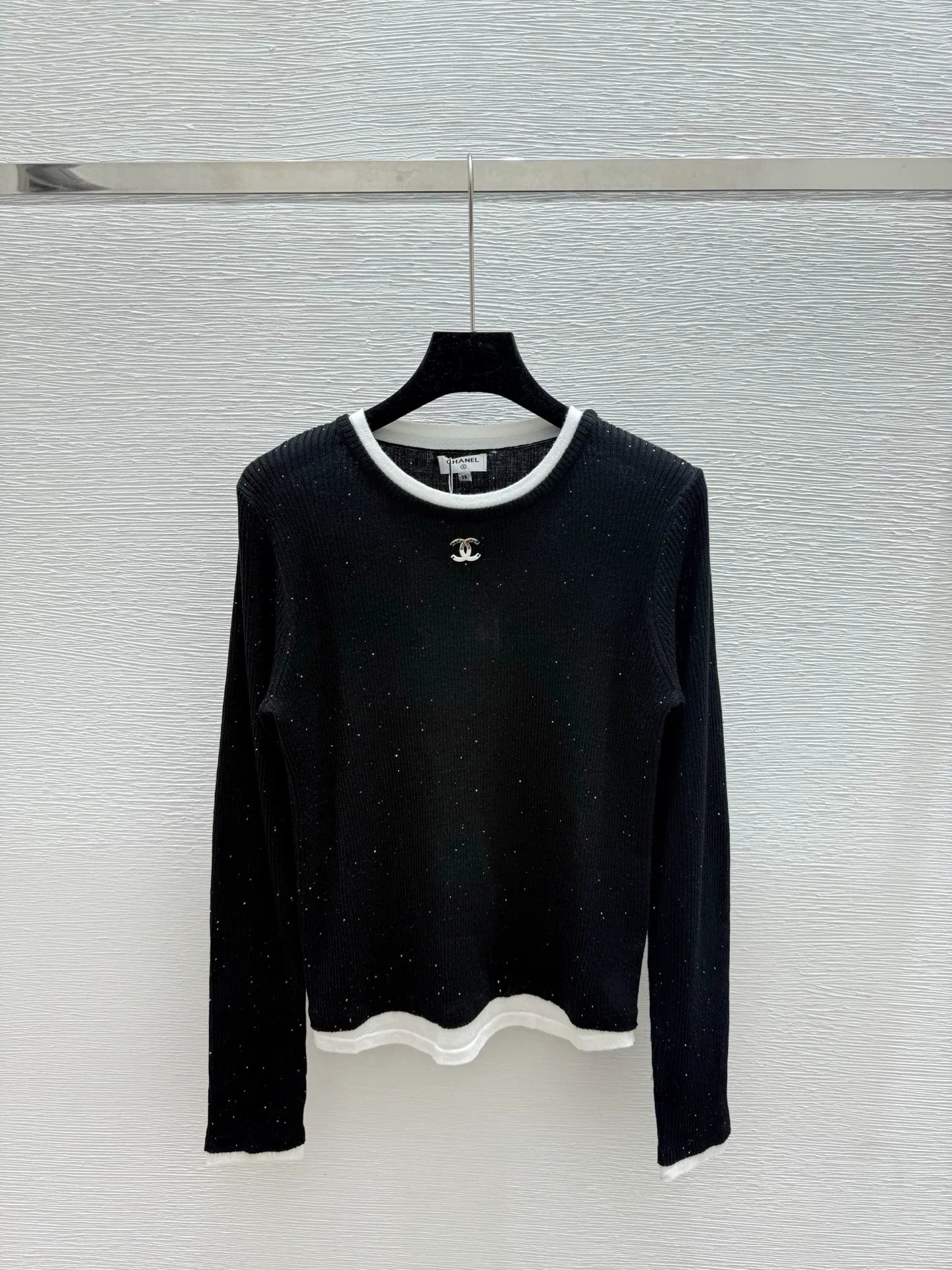 Classic double-C logo embellishment, simple and elegant yet exquisite. Round neck design with black and white stitching, slim fit and slimming silhouette