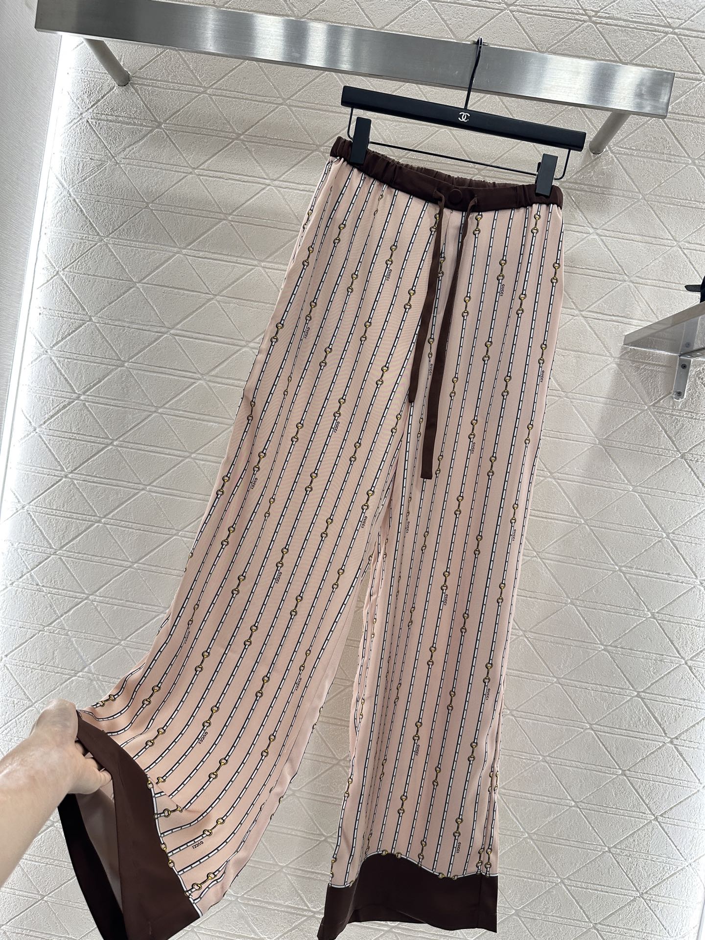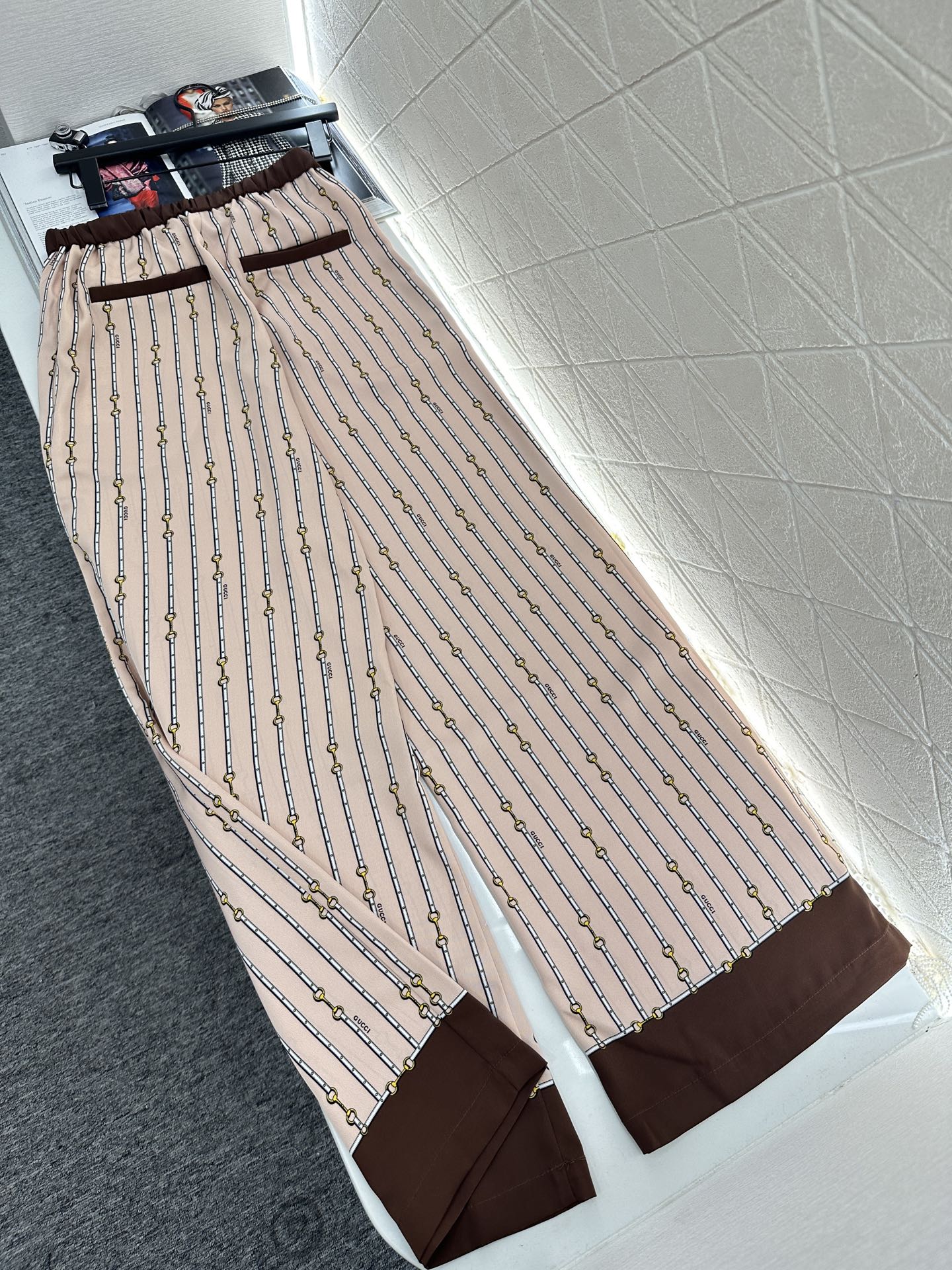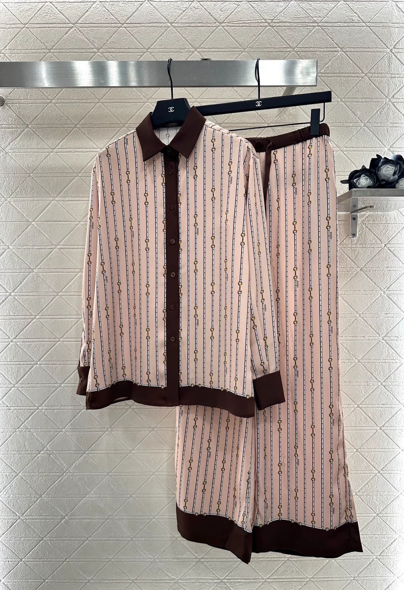 The twill thick material is soft and skin friendly, with a hanging and flowing overall printing process that presents a vertical row of chain buckle patterns ➕ Interspersed with letter logos to showcase the brand's high-end style. Evergreen lapel shirt cut, contrasting colors, and edging decoration break the norm and enrich the visual effect. The upper body temperament is relaxed and elegant. Paired with wide leg straight leg pants of the same series, the details echo the waist and hem of the pants. The contrasting colors are inclusive, slimming, and relaxing. The casual matching presents a style full of money