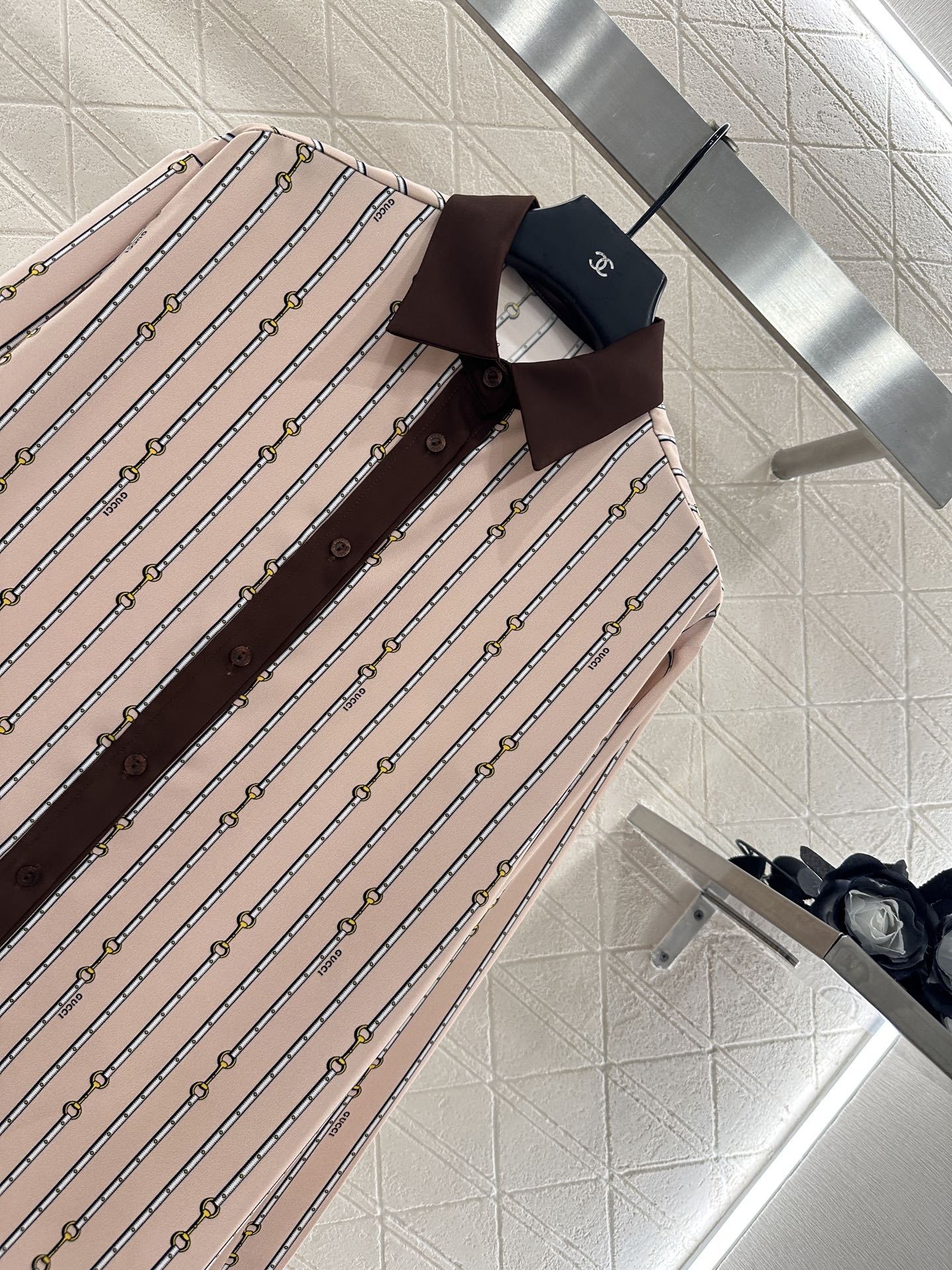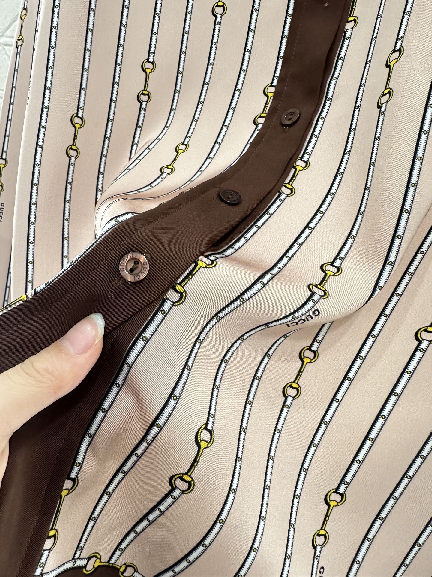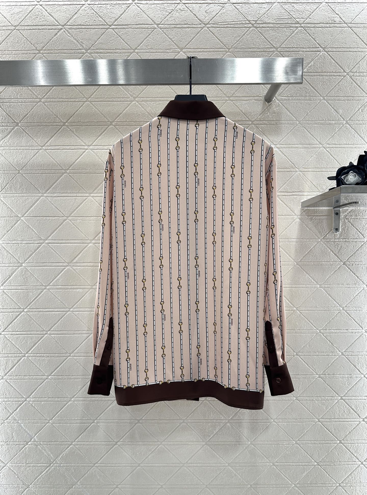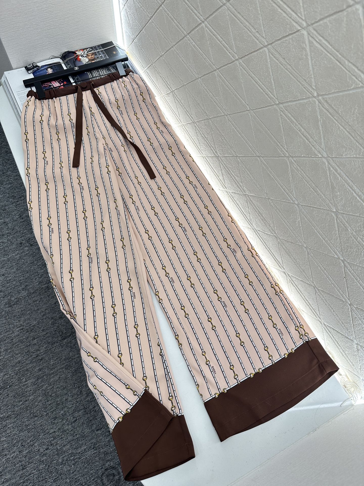 The twill thick material is soft and skin friendly, with a hanging and flowing overall printing process that presents a vertical row of chain buckle patterns ➕ Interspersed with letter logos to showcase the brand's high-end style. Evergreen lapel shirt cut, contrasting colors, and edging decoration break the norm and enrich the visual effect. The upper body temperament is relaxed and elegant. Paired with wide leg straight leg pants of the same series, the details echo the waist and hem of the pants. The contrasting colors are inclusive, slimming, and relaxing. The casual matching presents a style full of money