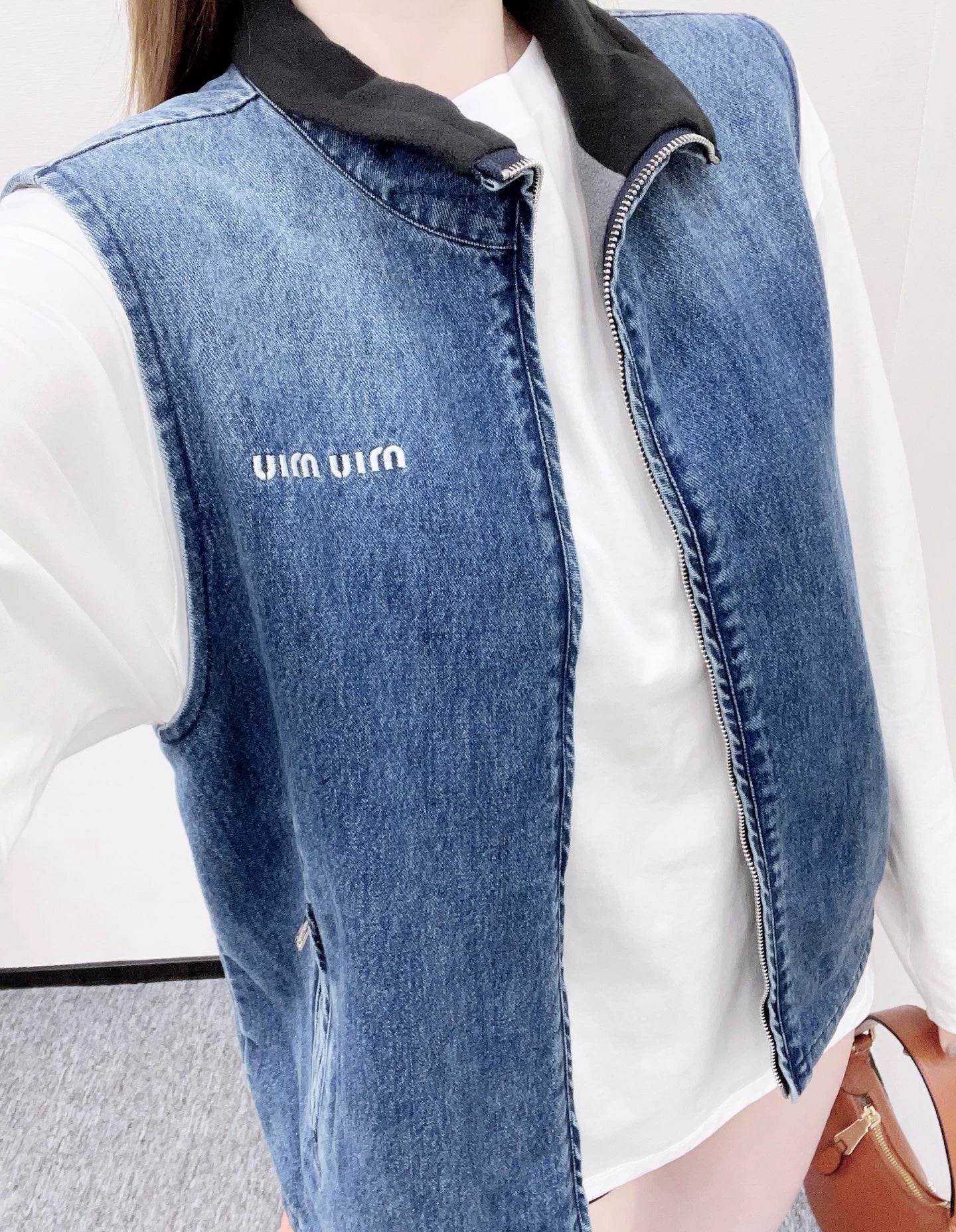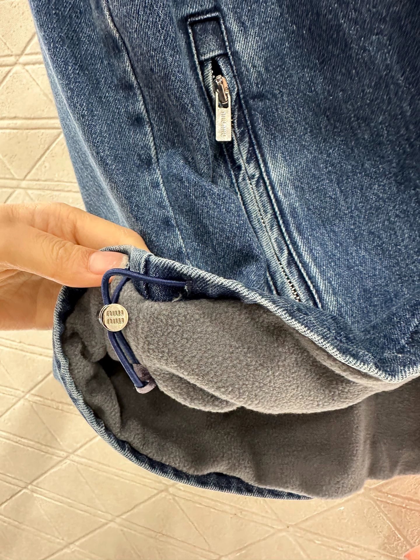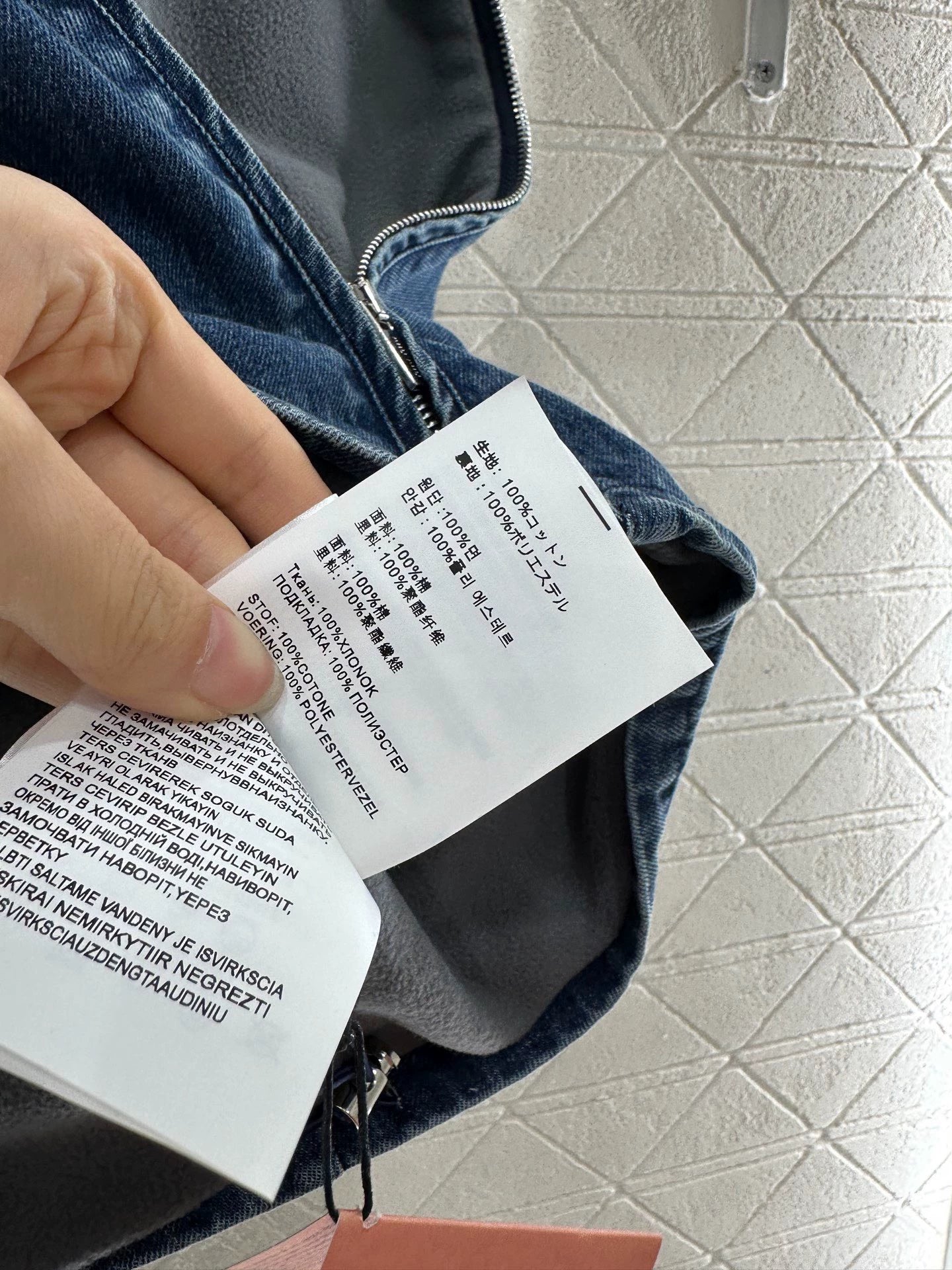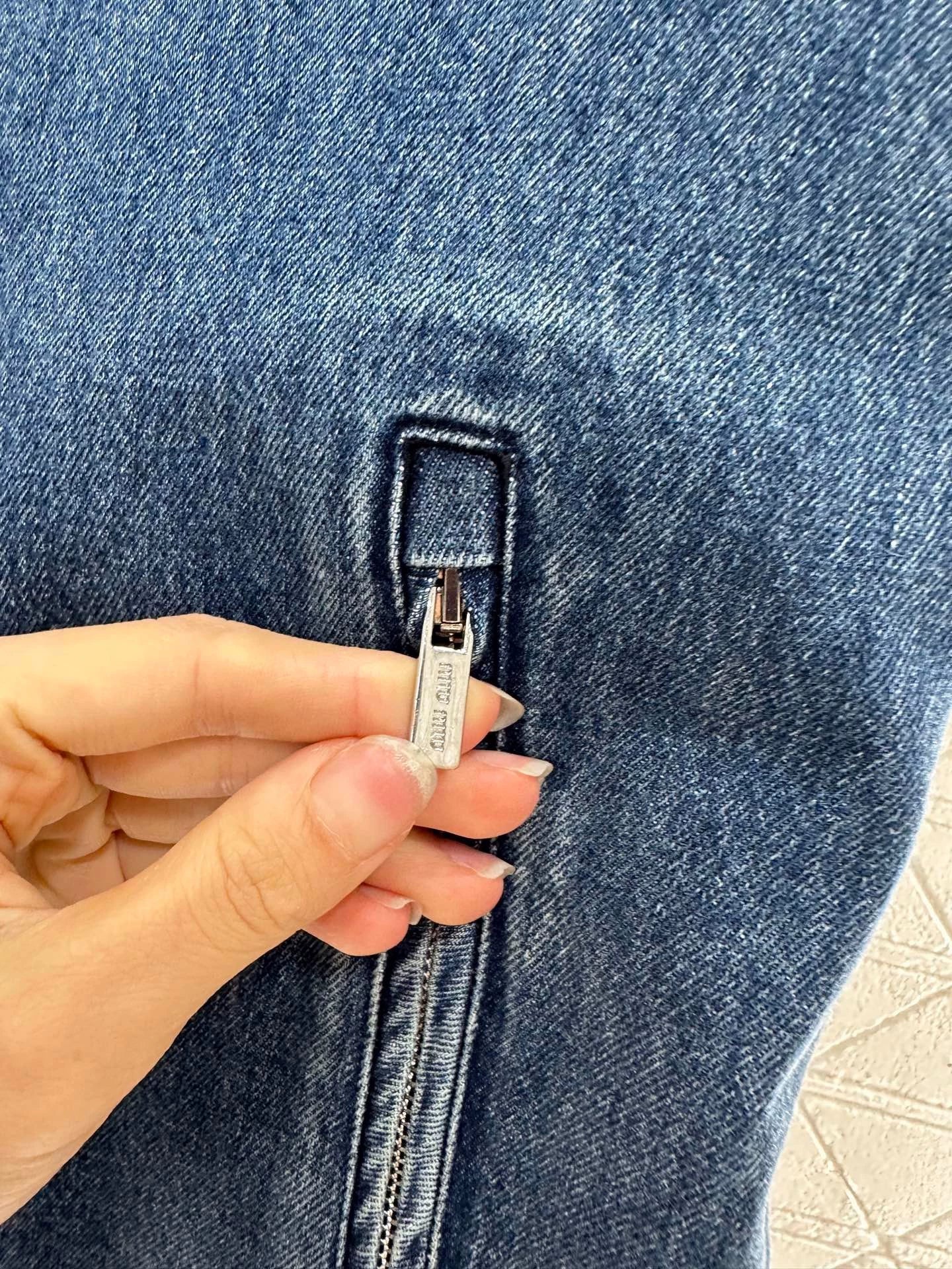 Twill cotton denim material texture, high-end wearing style, stylish lapel vest cut, inner fleece design with obvious particle sensation, significantly improved insulation performance, outer denim enzyme washed retro color pad sets a simple and fashionable tone, while highlighting the brand's high-end style. The chest is embellished with engraved letters, symmetrical zipper pockets, rich details, neat cutting, easy to modify the body shape, highlighting the high-end style, fashionable and casual wearing