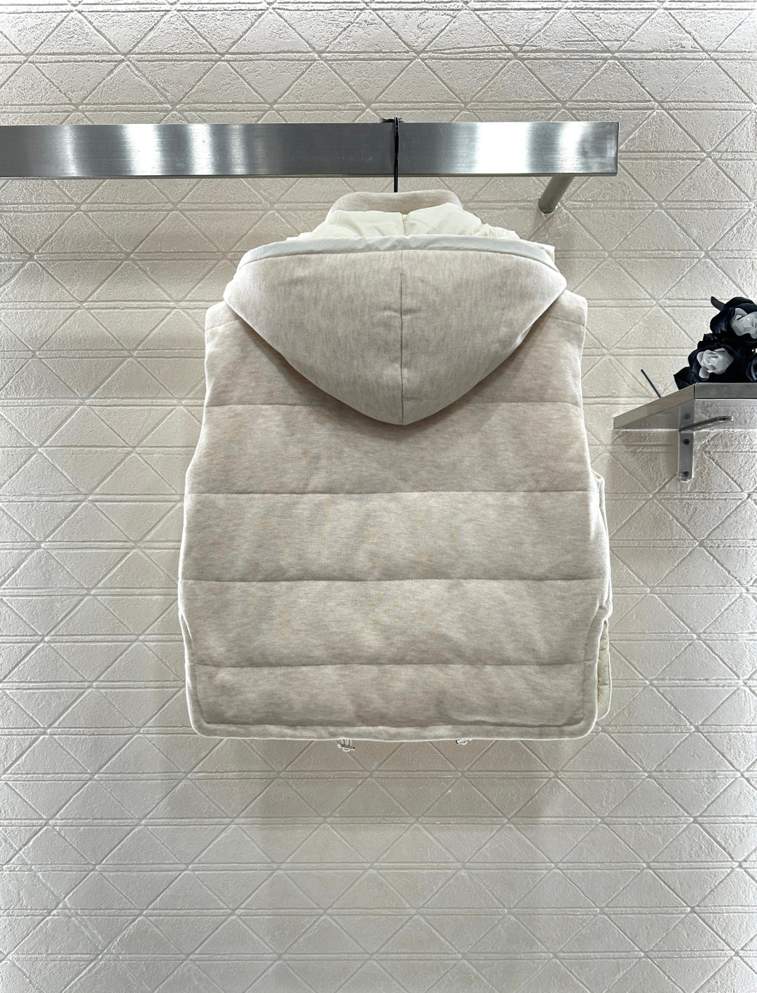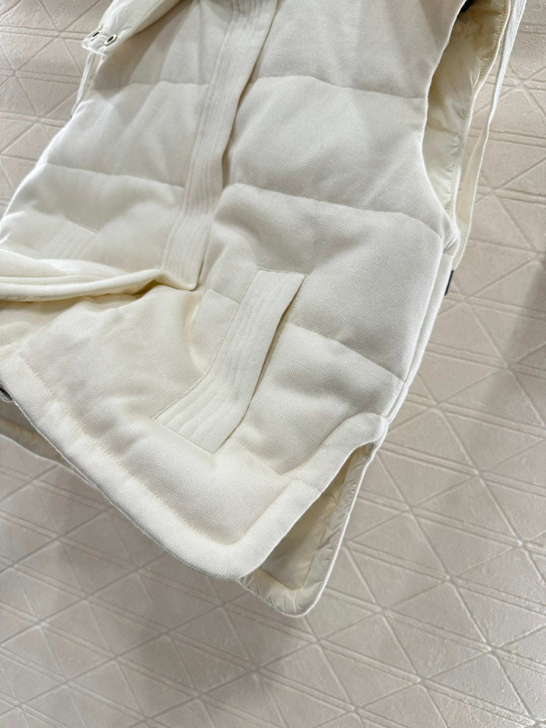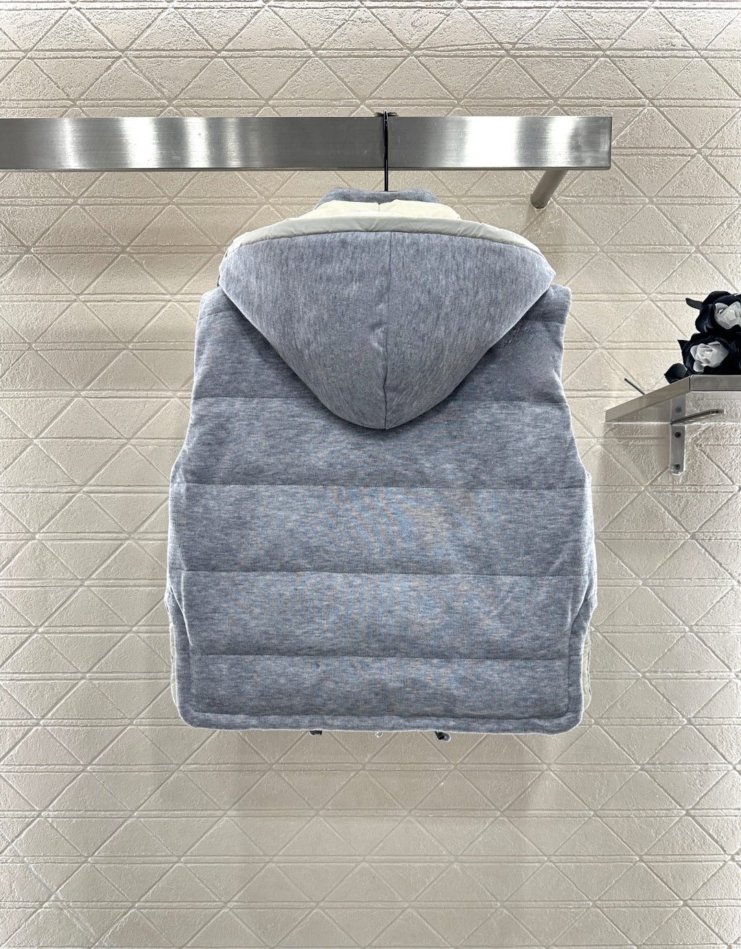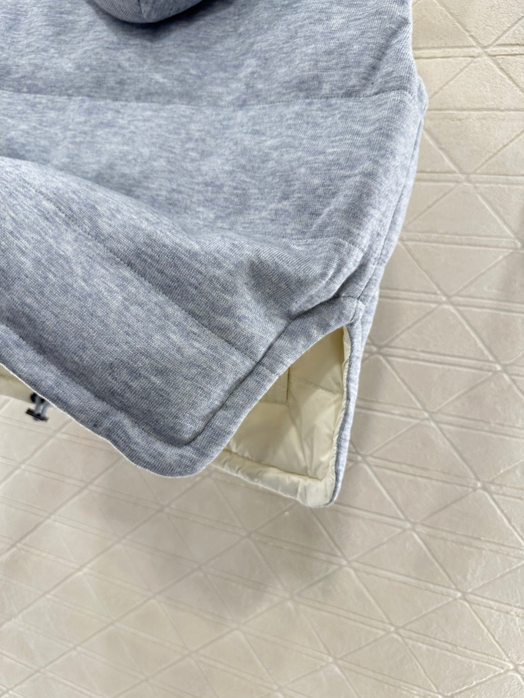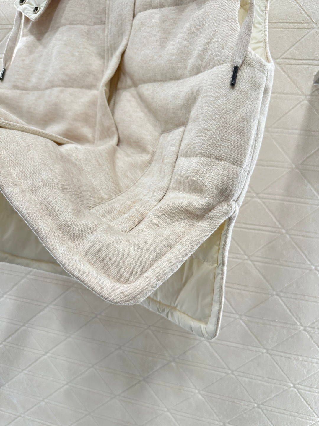 Windproof and waterproof nylon ➕ Made of wool material with white goose down filling inside, the whole piece is lightweight and warm. The slim fitting vest is fashionable and does not look bulky. The detachable hood drawstring design keeps warm and windproof, and the double-sided design concept makes the outfit more diverse. The rectangular grid texture, lining and inner collar complement each other, embellishing with contrasting colors and details to showcase the brand concept. It is the first choice for autumn and winter layering.