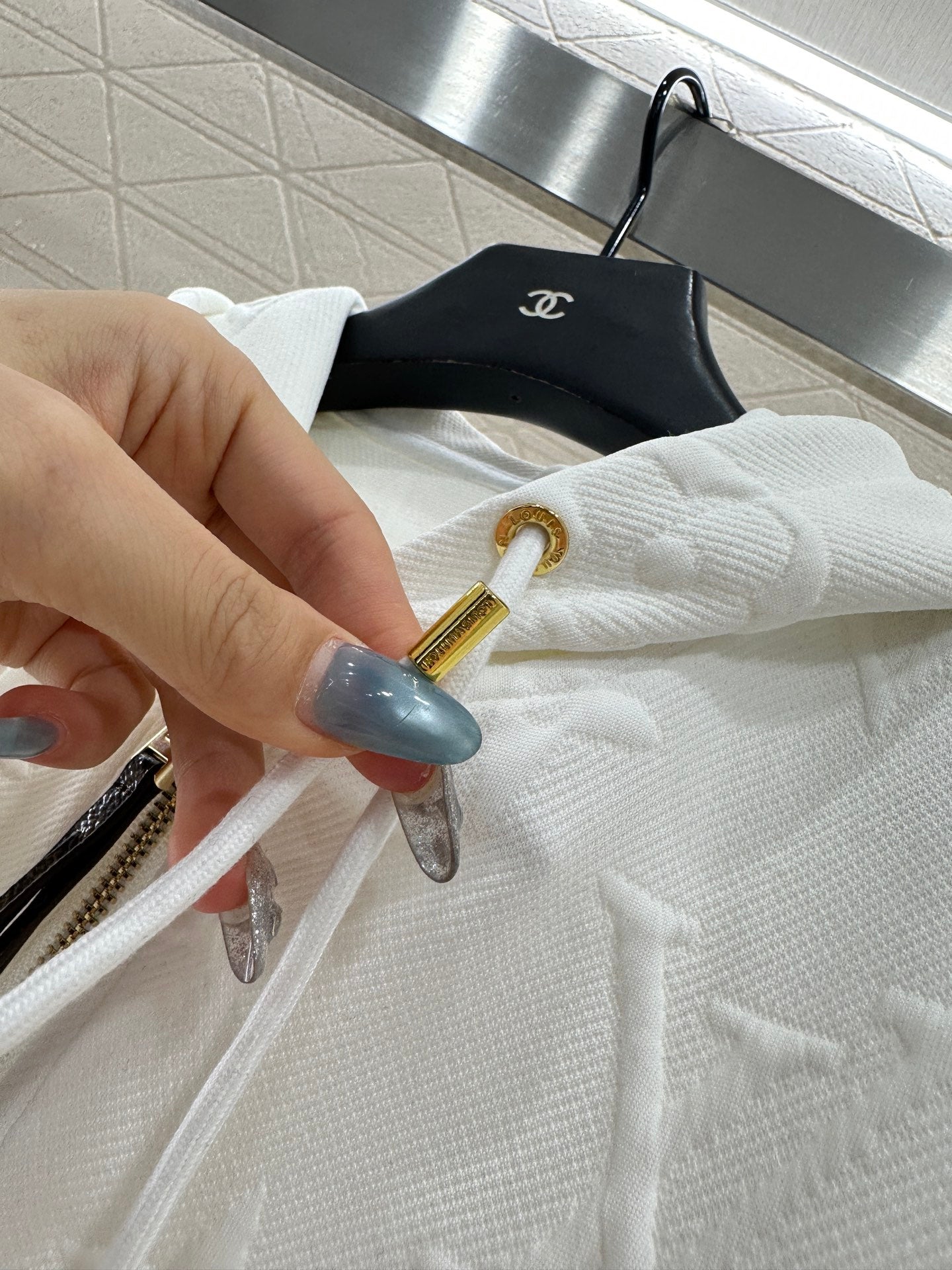 Embossed material, glossy texture, comfortable drape, hooded jacket cut, fashionable and casual, adorned with iconic embossed letter logos throughout the body, instantly enhancing the brand's style, enriching the visual effect and making it more fashionable, durable and versatile in plain colors, slimming and adding vitality. Paired with straight leg pants of the same series, it echoes the style up and down, and the drawstring makes it more personalized and casual, increasing the sense of styling. The complete set is simple and high-end, essential for daily outfits, a guide for casual wear, relaxed and fashionable.
