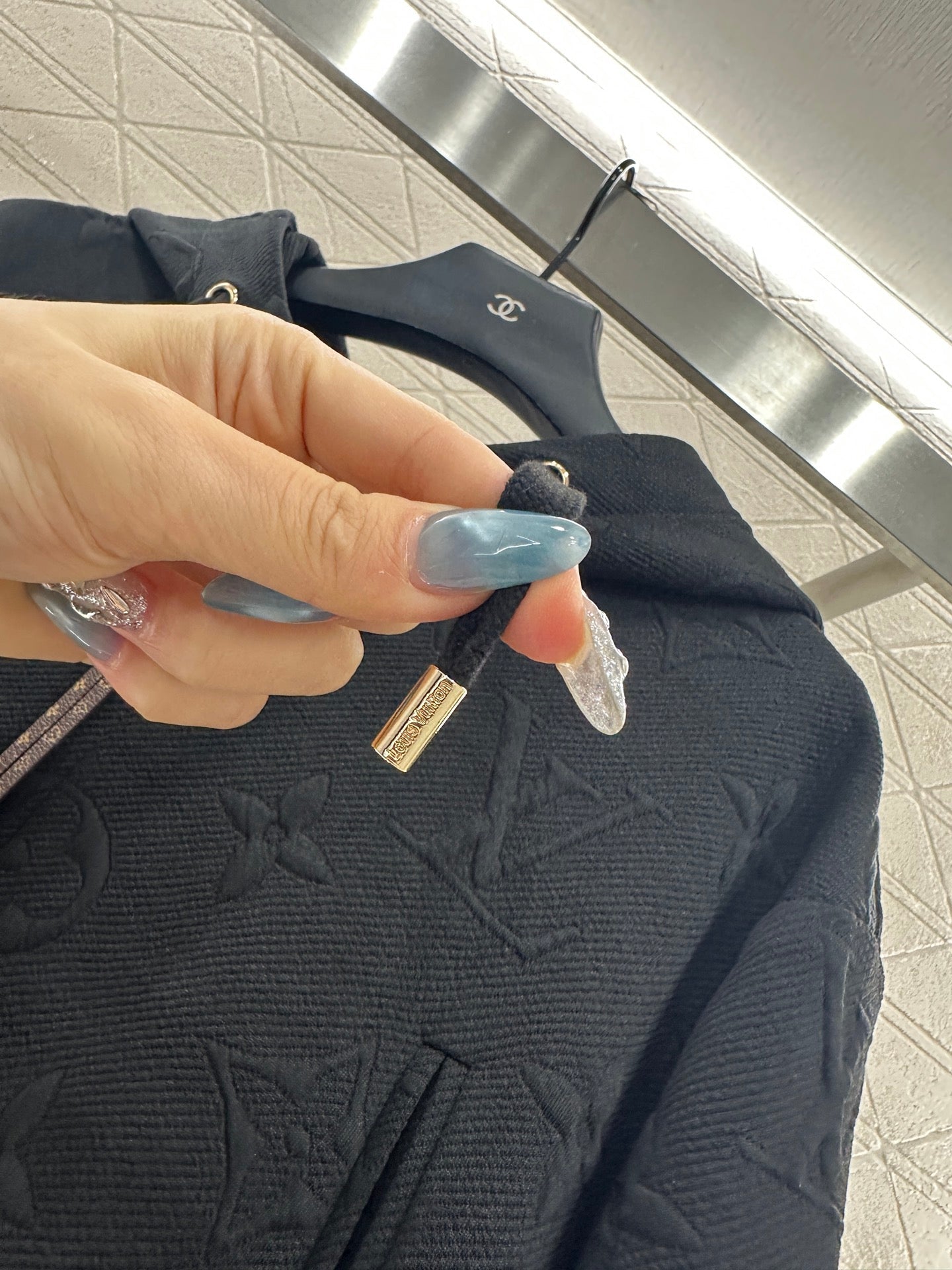 Embossed material, comfortable and skin friendly, fashionable to wear, hooded drawstring jacket cut, fashionable and casual, chest zipper open collar ➕ The waistline is designed with elastic tightening, giving off a slimming and stylish look. The leather buckle and embossed three-dimensional four leaf clover letters throughout the body complement each other, giving off a strong sense of old money. The brand's style is instantly enhanced, adding vitality. When worn together with straight leg pants of the same series, the details are unified and coordinated, and the loose silhouette is more casual. Wearing a simple and high-end outfit is essential for autumn and winter sets, and a fashionable dressing guide is provided