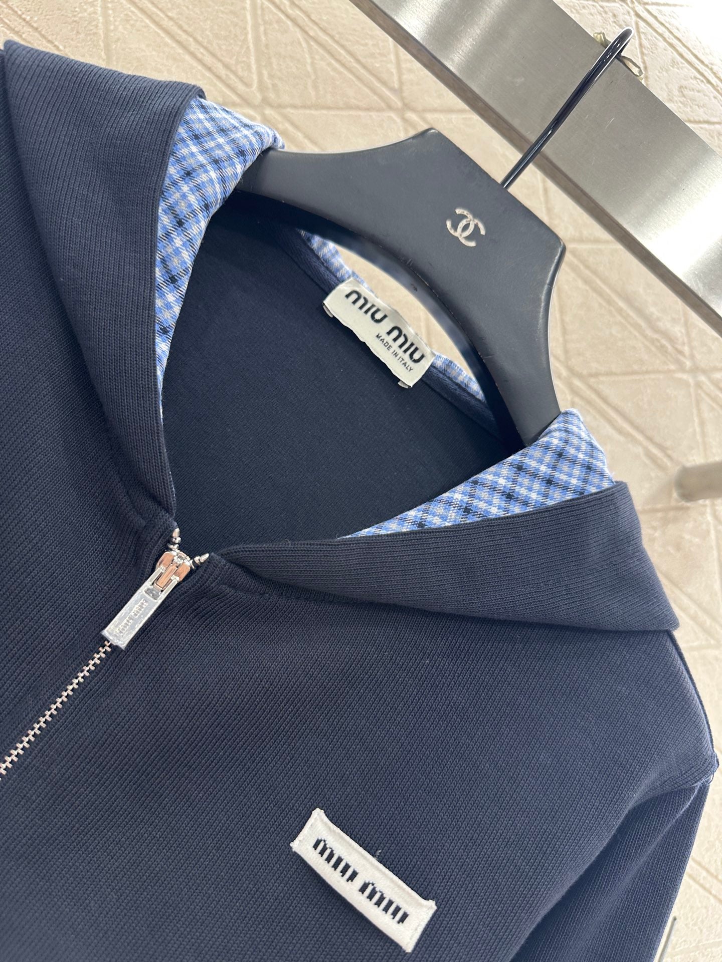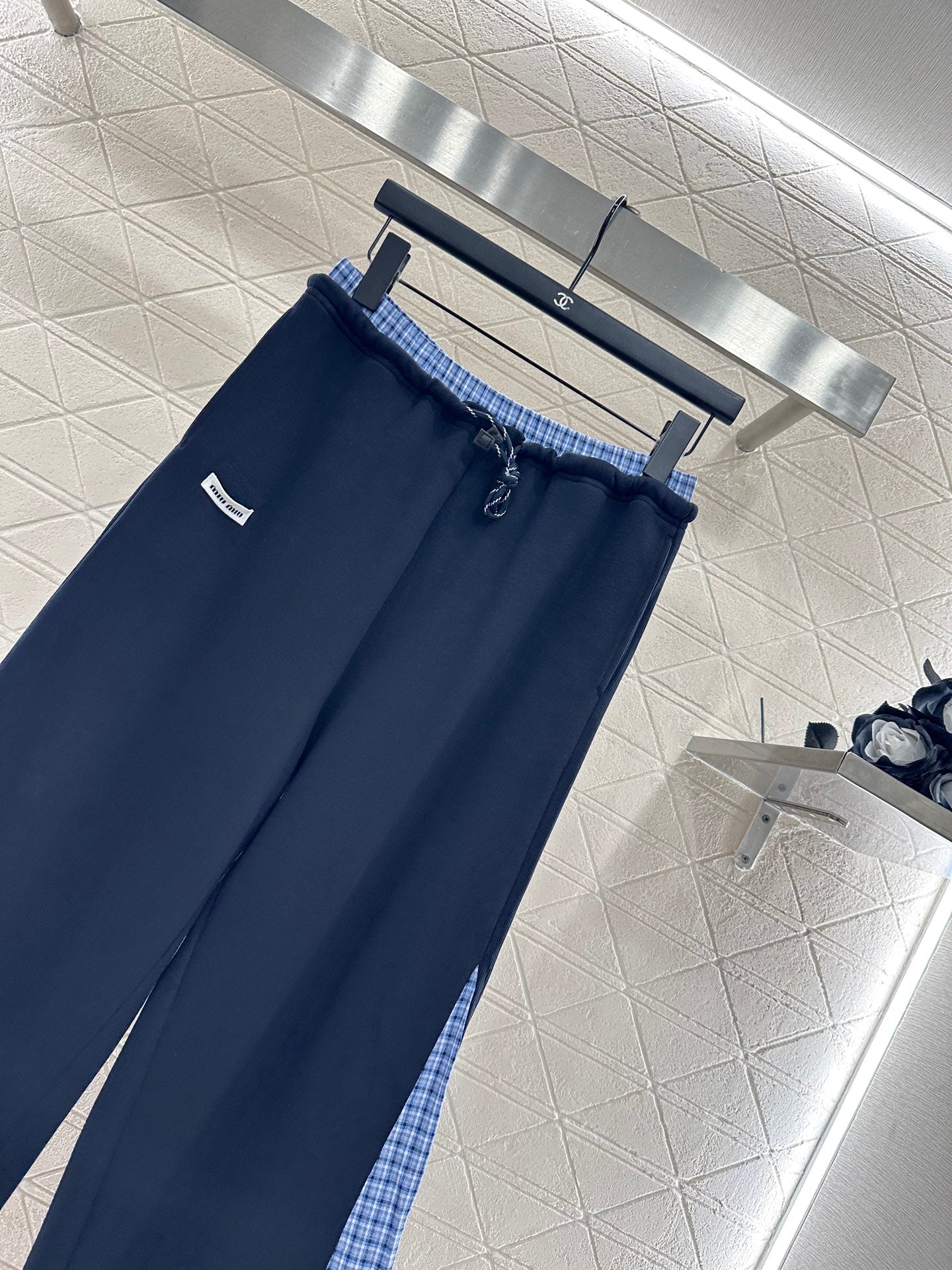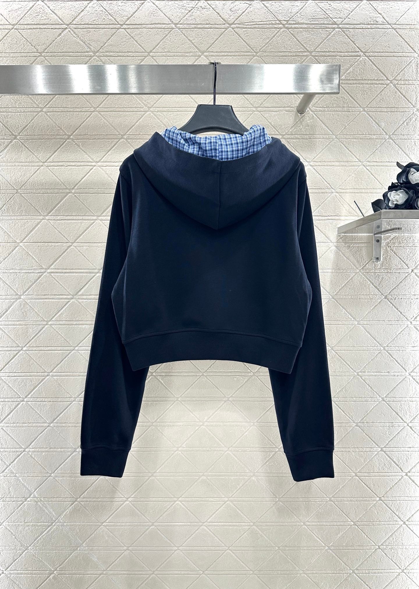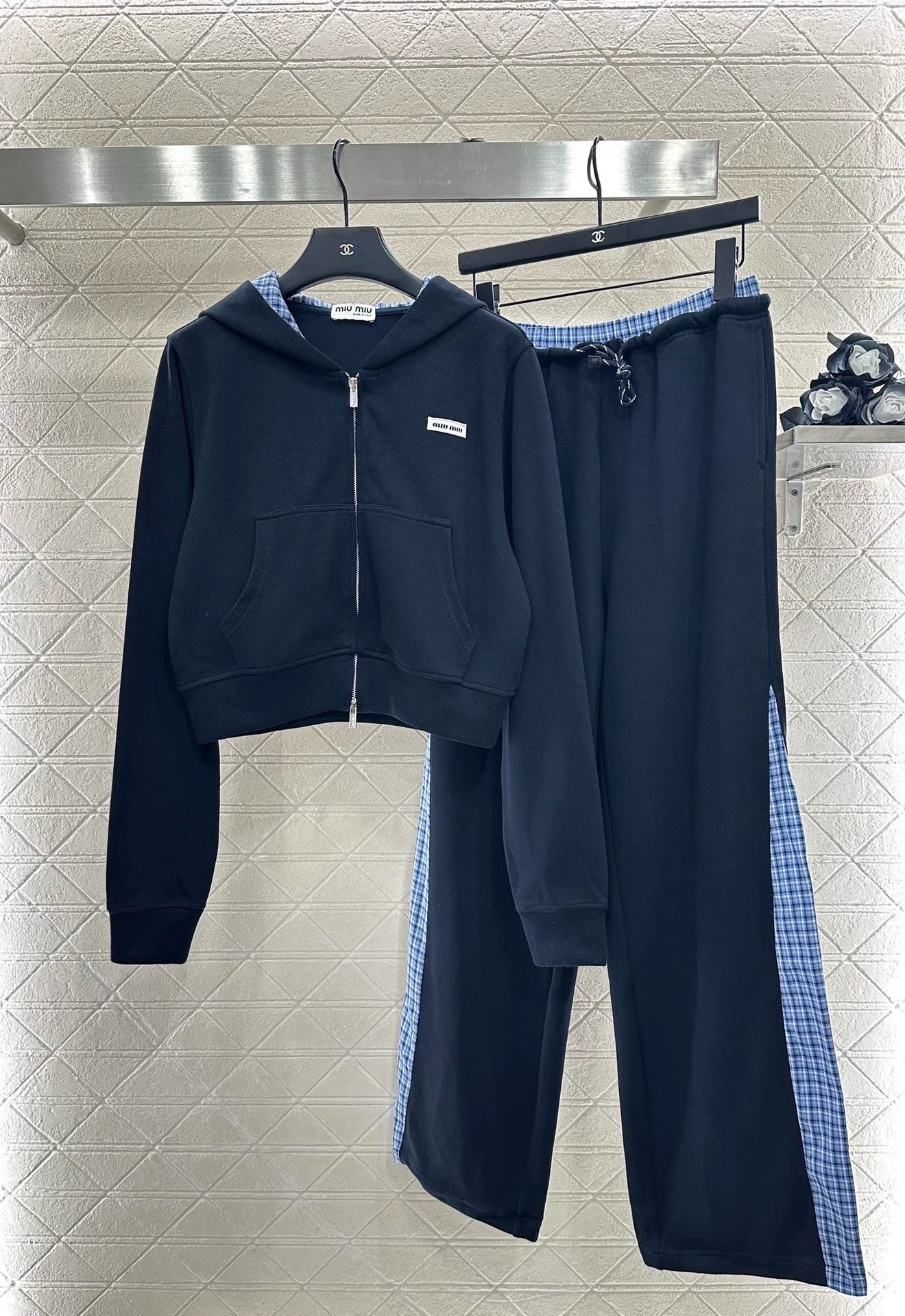 Made of all cotton material, with a glossy texture and a high-end appearance, this loose short hooded jacket features a zipper opening adjustment and a hat collar with a grid pattern that exudes a casual feel. The chest is adorned with a letter logo, highlighting the brand's tone. Paired with wide leg straight leg pants of the same series, the waist has a twisted floral drawstring that is elastic and stylish, and the waist and side pants have grid patterns that complement each other. It is simple yet stylish, making it easy to handle for daily commuting