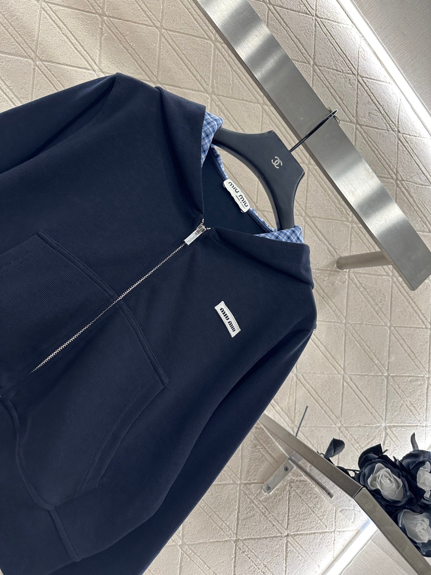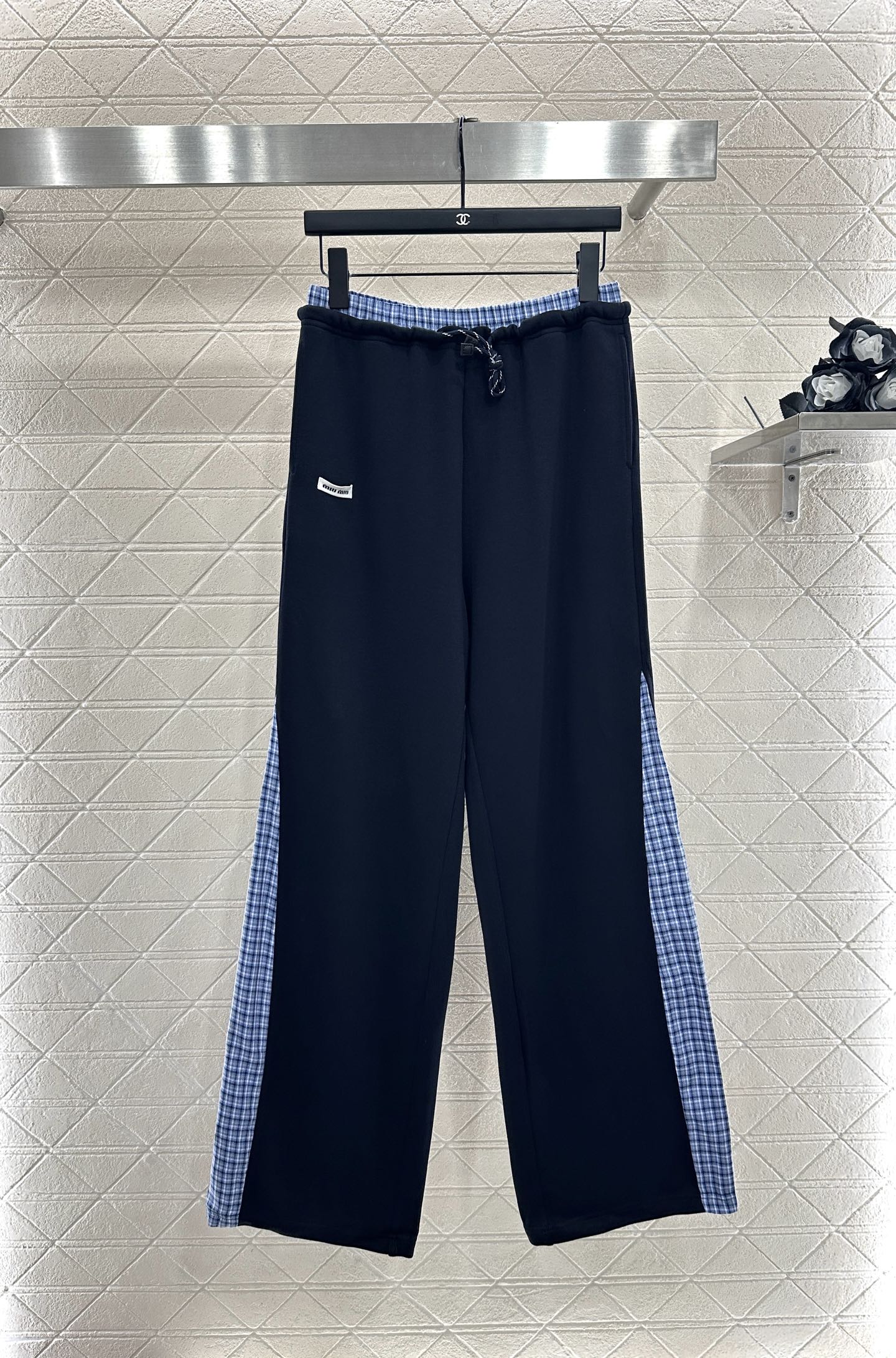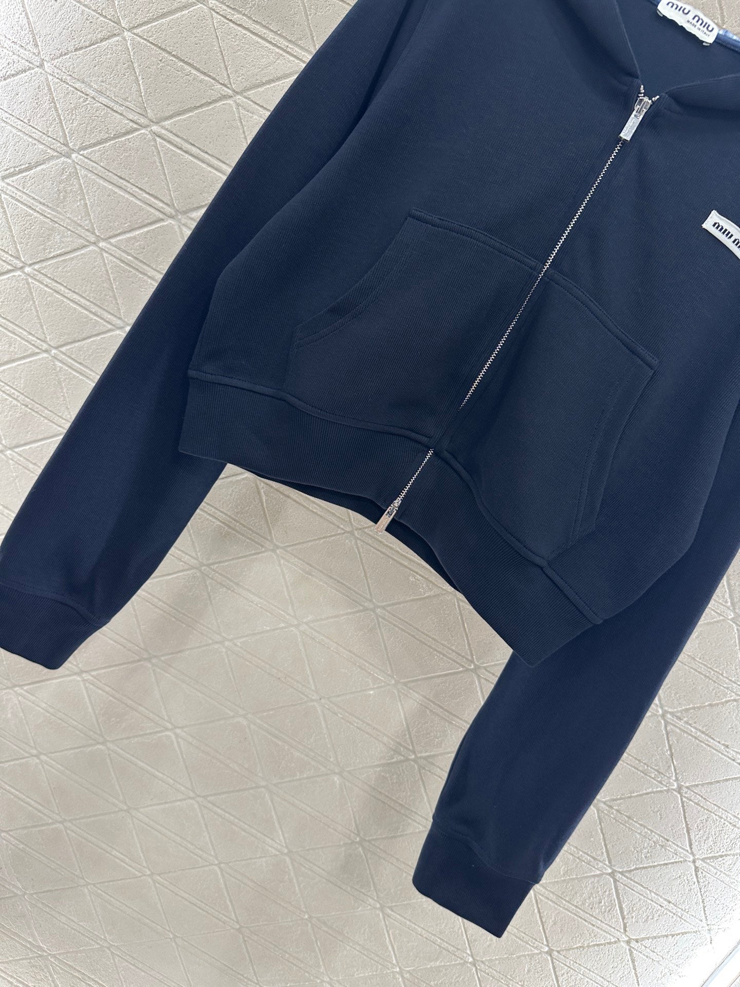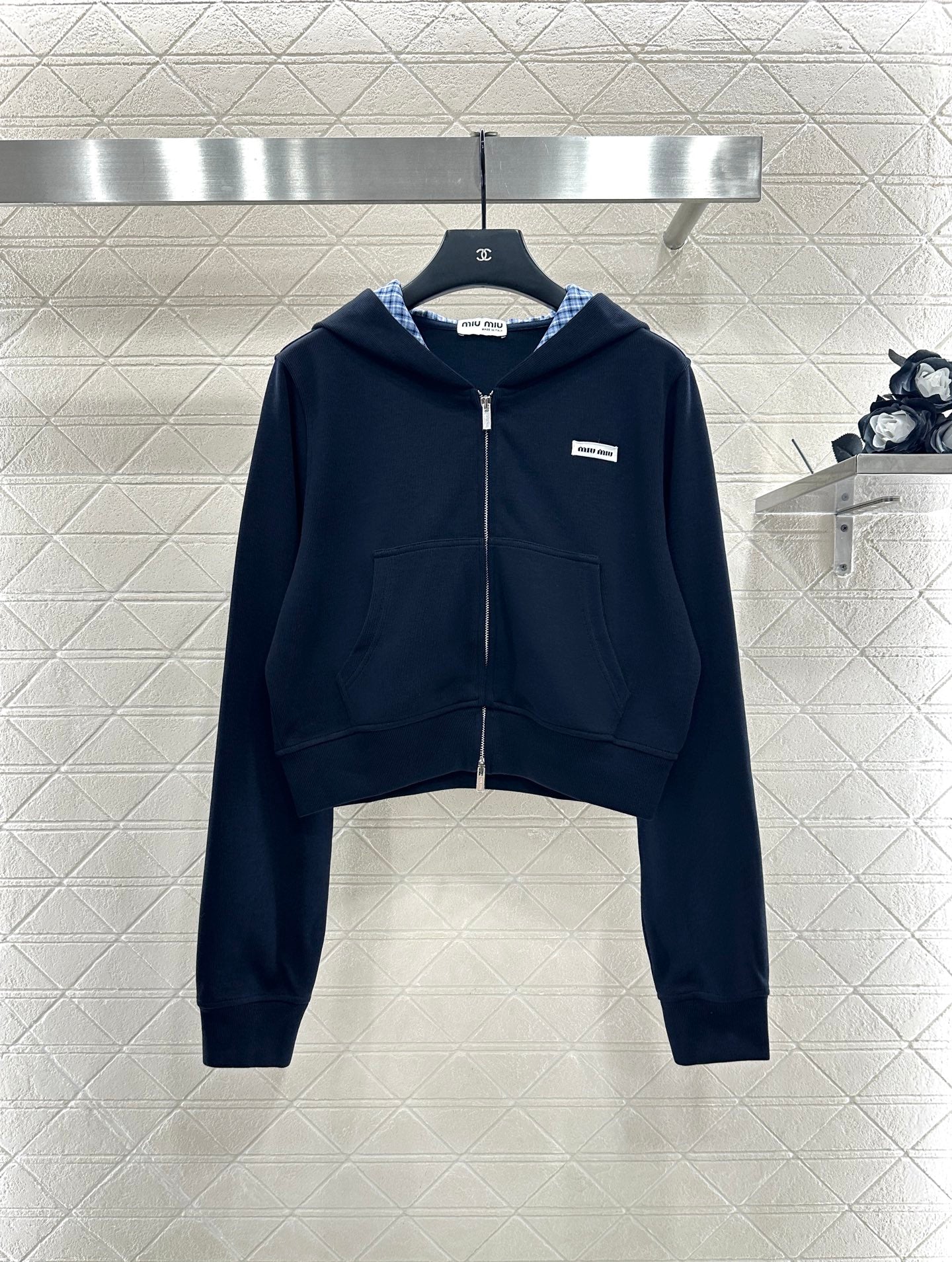 Made of all cotton material, with a glossy texture and a high-end appearance, this loose short hooded jacket features a zipper opening adjustment and a hat collar with a grid pattern that exudes a casual feel. The chest is adorned with a letter logo, highlighting the brand's tone. Paired with wide leg straight leg pants of the same series, the waist has a twisted floral drawstring that is elastic and stylish, and the waist and side pants have grid patterns that complement each other. It is simple yet stylish, making it easy to handle for daily commuting