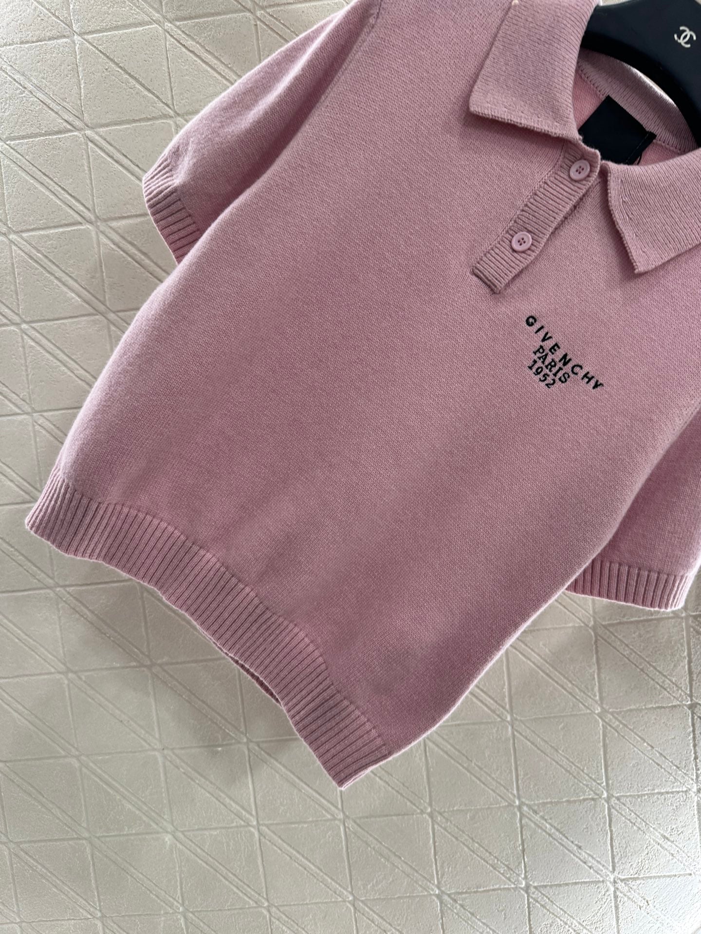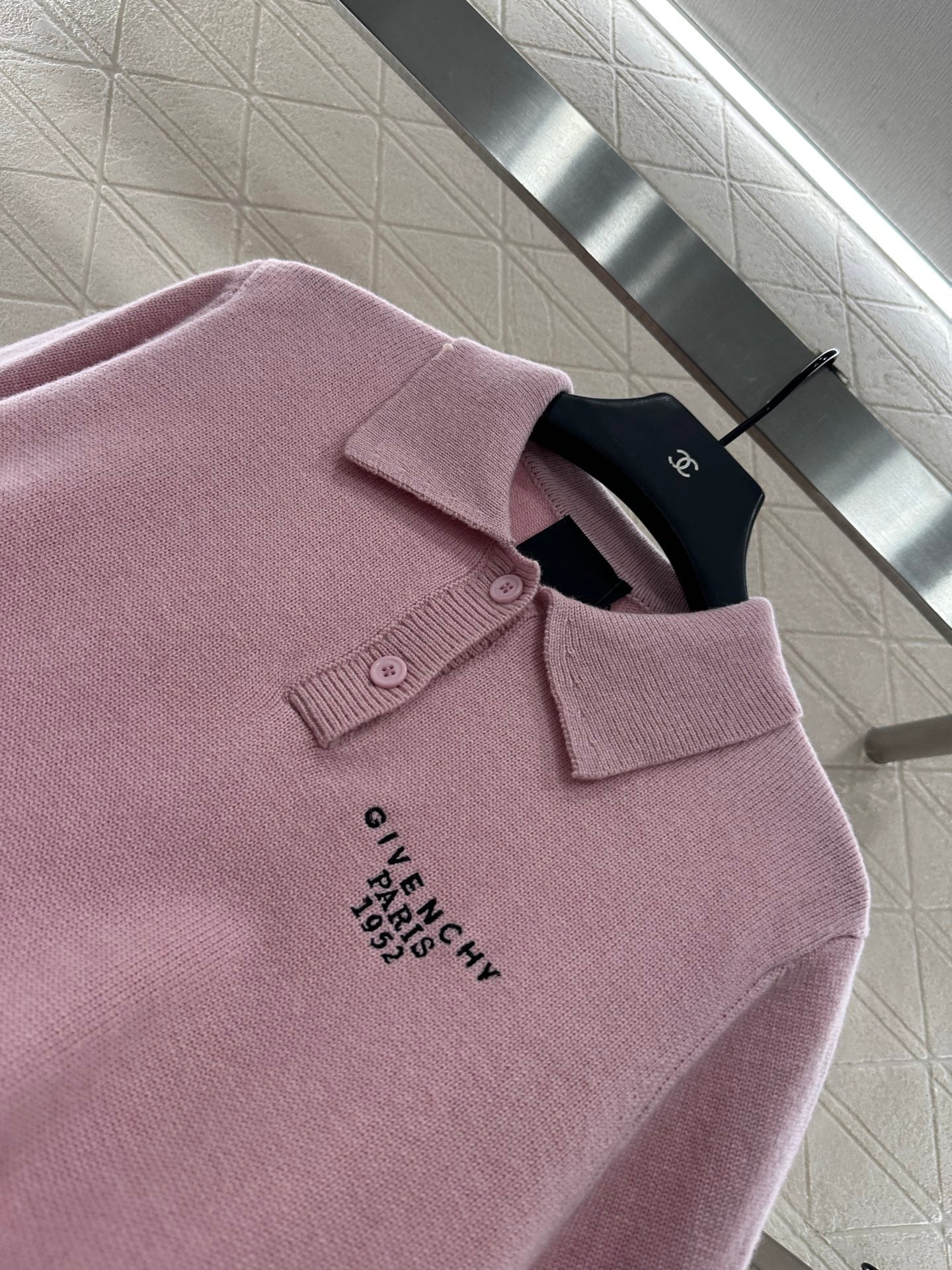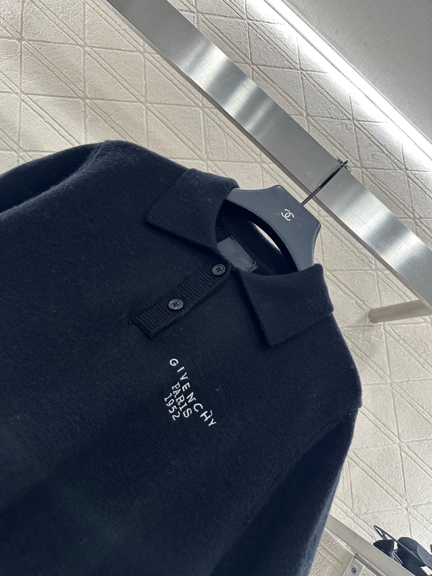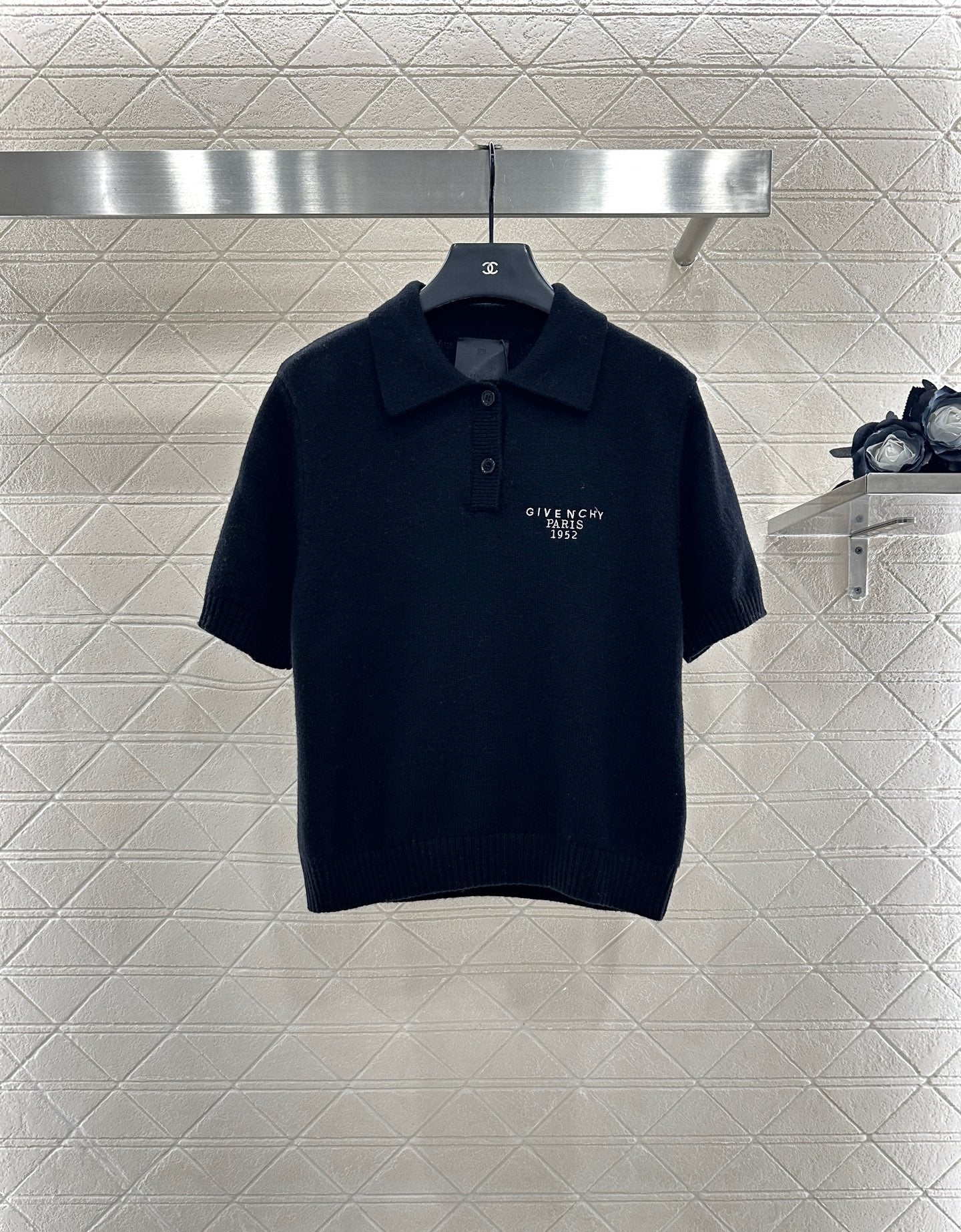 Cashmere yarn weaving texture is high-end, comfortable, soft, with a lapel collar and shoulder length short sleeved sweater. The half open button design is matched with delicate and dense texture. The edging is tightened with threaded strips and full of elasticity. The chest letter logo decoration highlights the high-end tone. The regular version is not picky about body shape, age, four seasons, daily life, simple and versatile