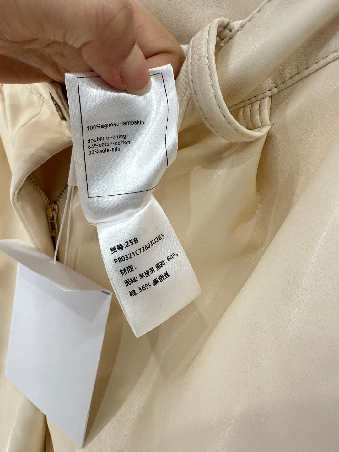 Sheepskin leather material texture, delicate luster, stylish straight leg pants cut, symmetrical pockets with durable basic contour lines, high-end front printed placket buckle with double C letter logo, highlighting brand style. Paired with the same series of jackets, it is fashionable and elegant whether worn as a set or alone