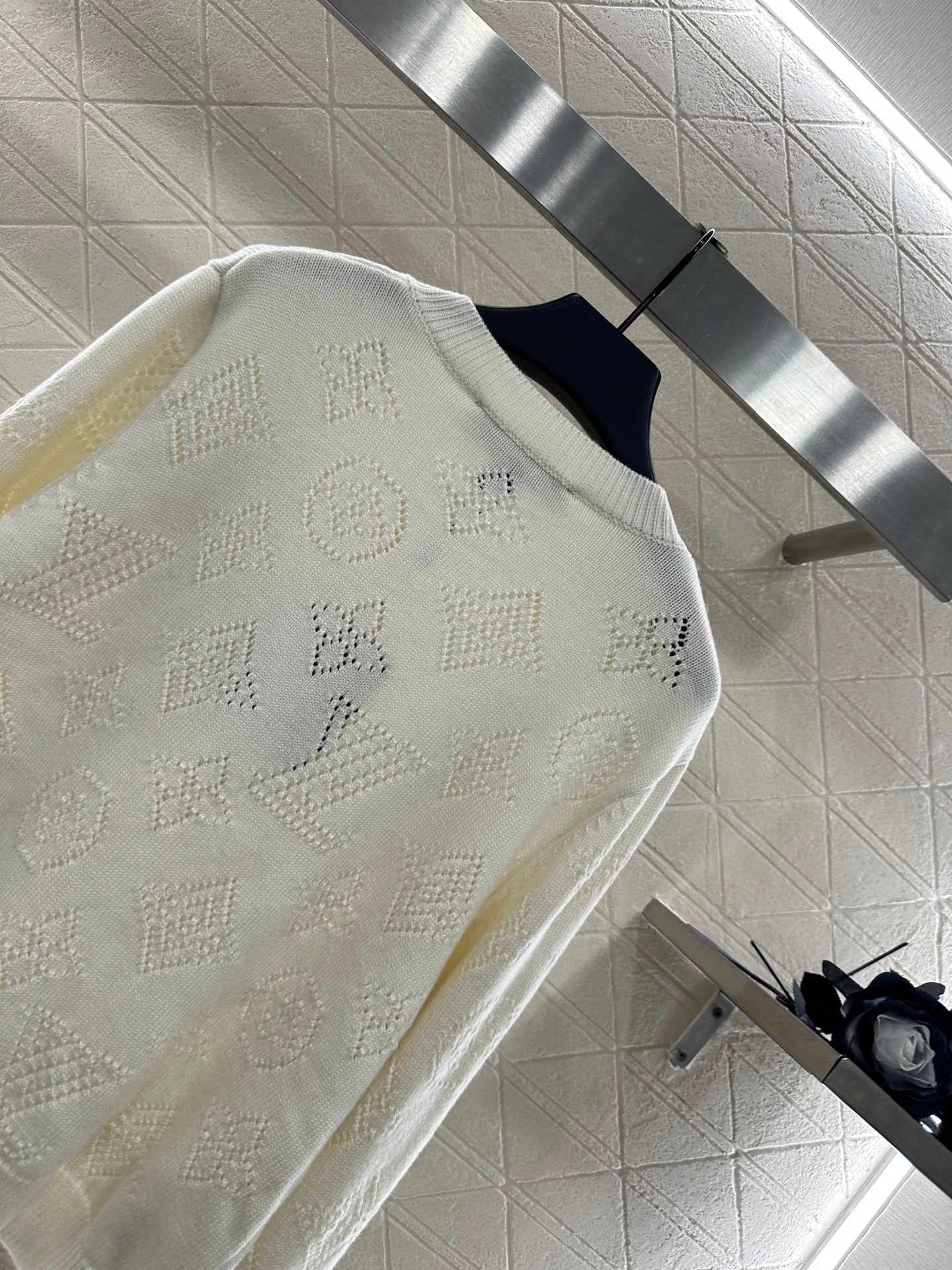 Crafted from cashmere and wool yarn, this high-quality, comfortable and soft knit cardigan features a round neck, shoulder length, and long sleeved design. The hollowed out texture outlines the letter logo and four leaf clover elements, complementing each other in a fashionable and charming way, highlighting a gentle temperament. The edging is tightened with elasticity, highlighting a high-end tone. The regular shape decorates the body, creating a youthful and energetic look. It is a simple and versatile design for all seasons.