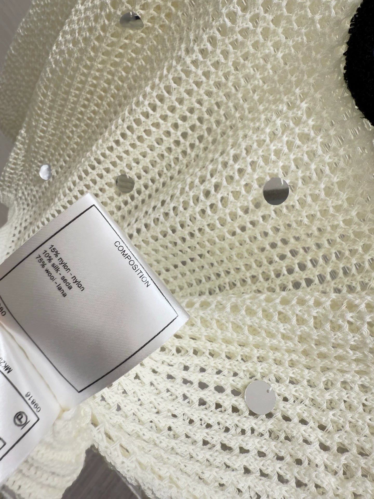 The black double-C logo on the chest is embellished with sequins, and the round neck pullover design is loose fitting, making it versatile with skirts or pants. Full body hollow mesh design, fashionable yet personalized.