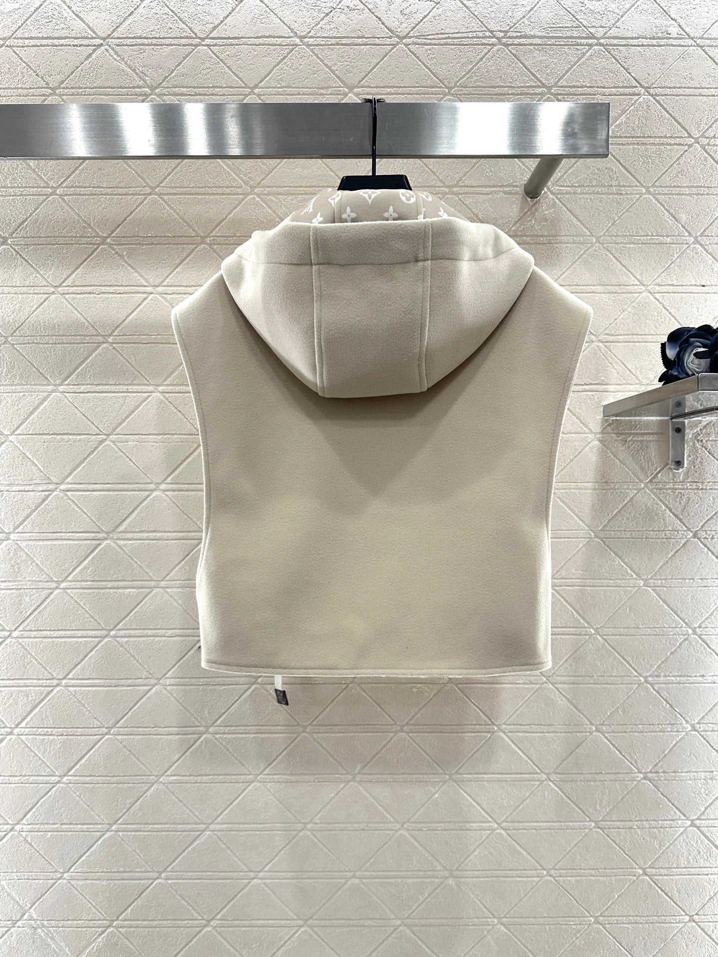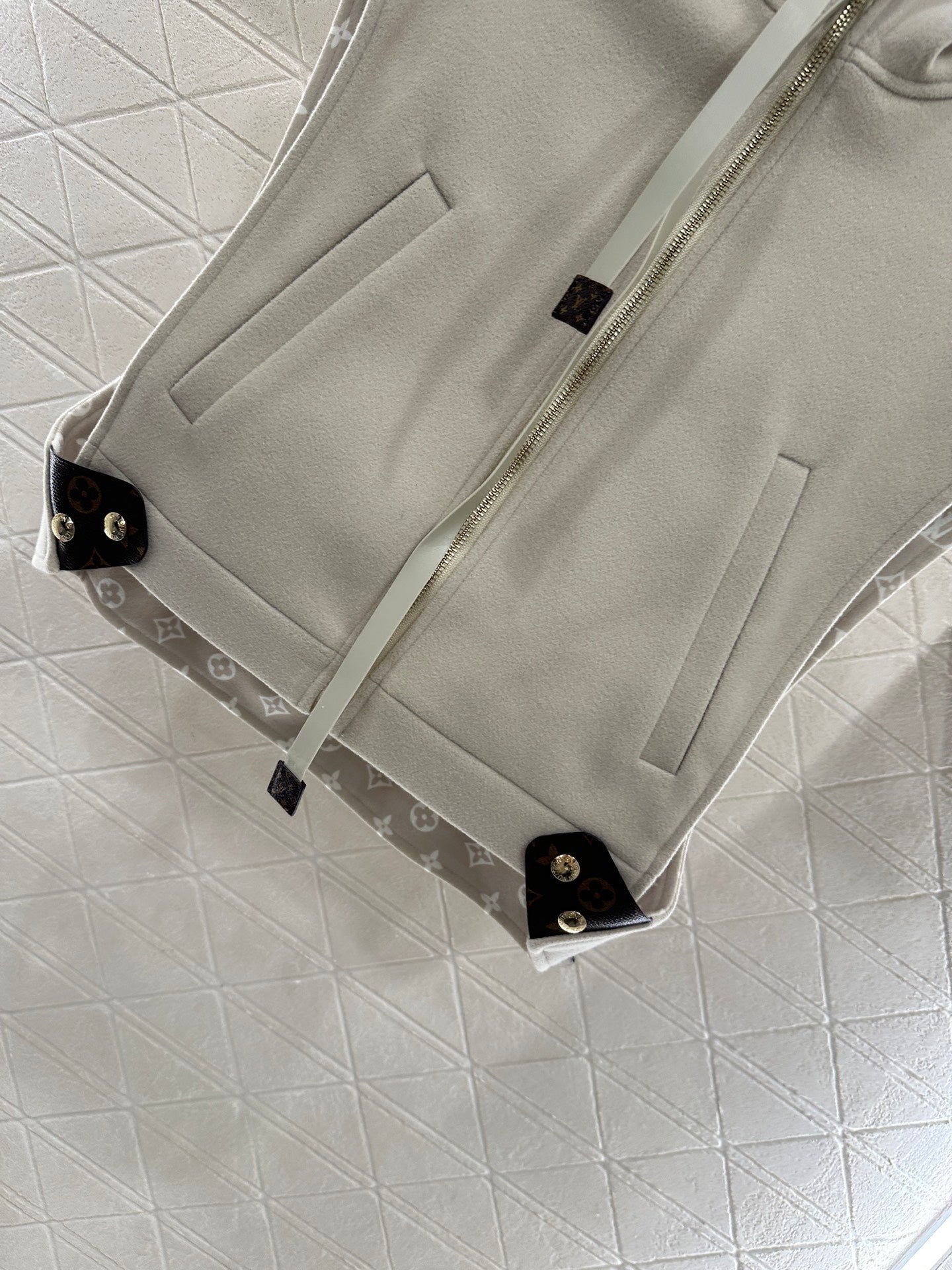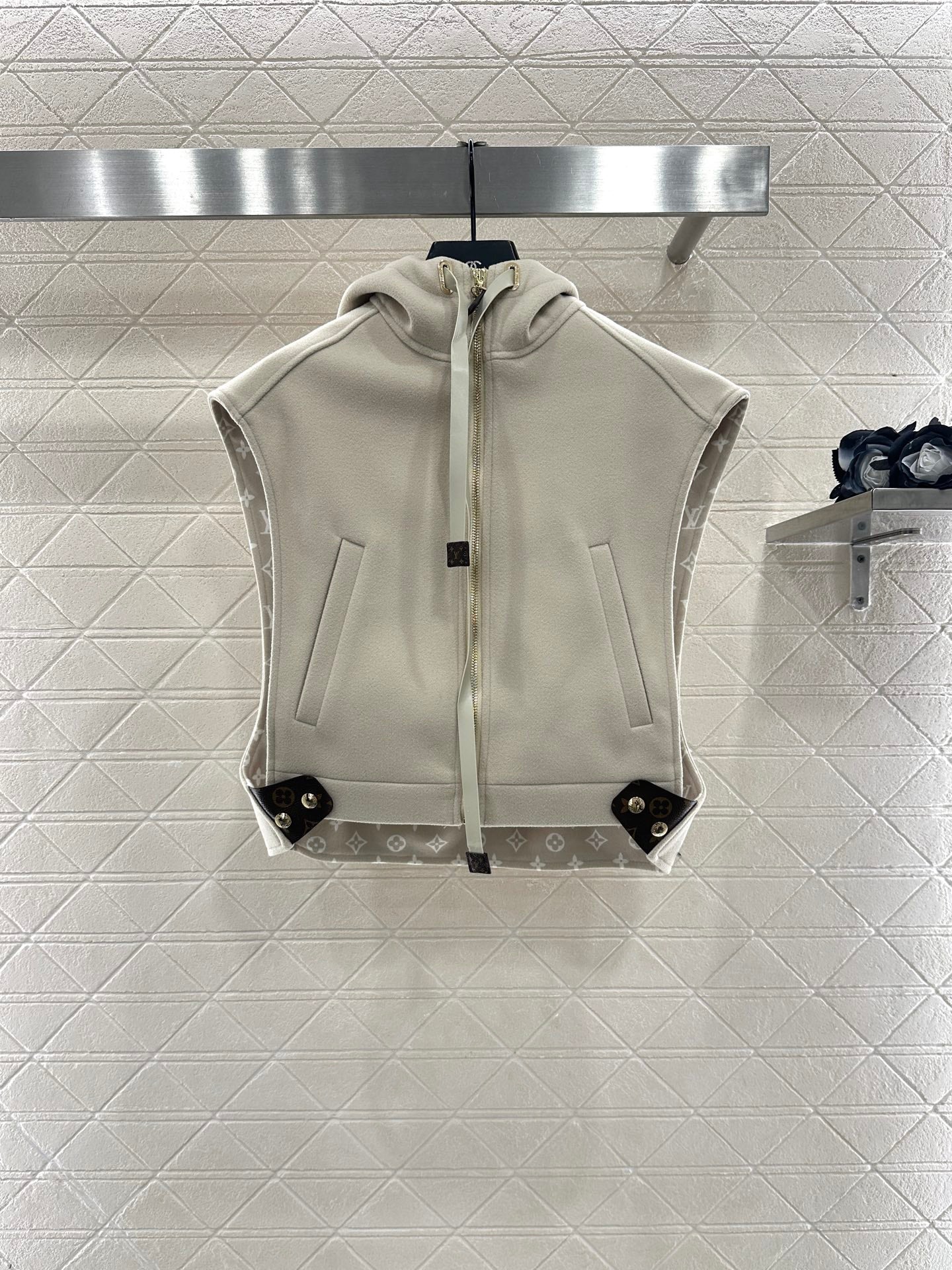 Wool wool material, processed with craftsmanship printing, adds color and fashion, hooded zipper vest style, large body plain color stable and low-key, lined with four leaf clover elements and letter logos, inadvertently revealing and adding detail levels, highlighting the brand's low-key luxury. The adjustable zipper with slit design is fixed with iconic leather buckles on both sides of the waist, and the shoulder style is high-end and fashionable. Whether it is daily travel or leisure time, it can be easily controlled