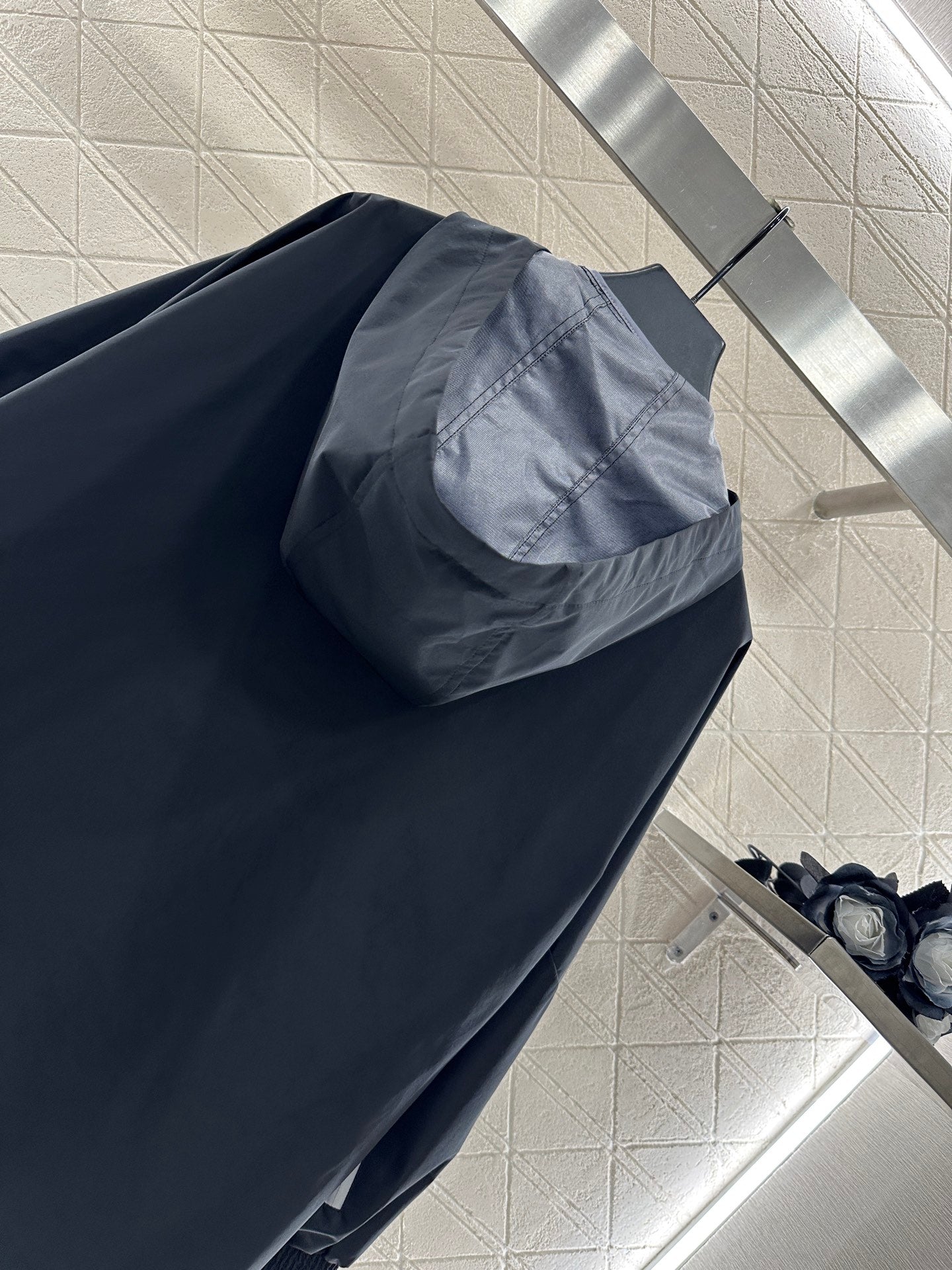 Sturdy nylon material texture, high-end, crisp and stylish hooded zipper jacket with symmetrical distribution, diagonal cutting, pleating lines, relaxed neutral coordination, contrasting color zipper, full of outdoor leisure atmosphere, medium long silhouette, oversized hem presenting natural micro A expansion with drawstring elasticity, easy to adapt to body shape, single-sided letter emblem and lining fully covered with four leaf clover letters echoing the old money style, lighting up details
