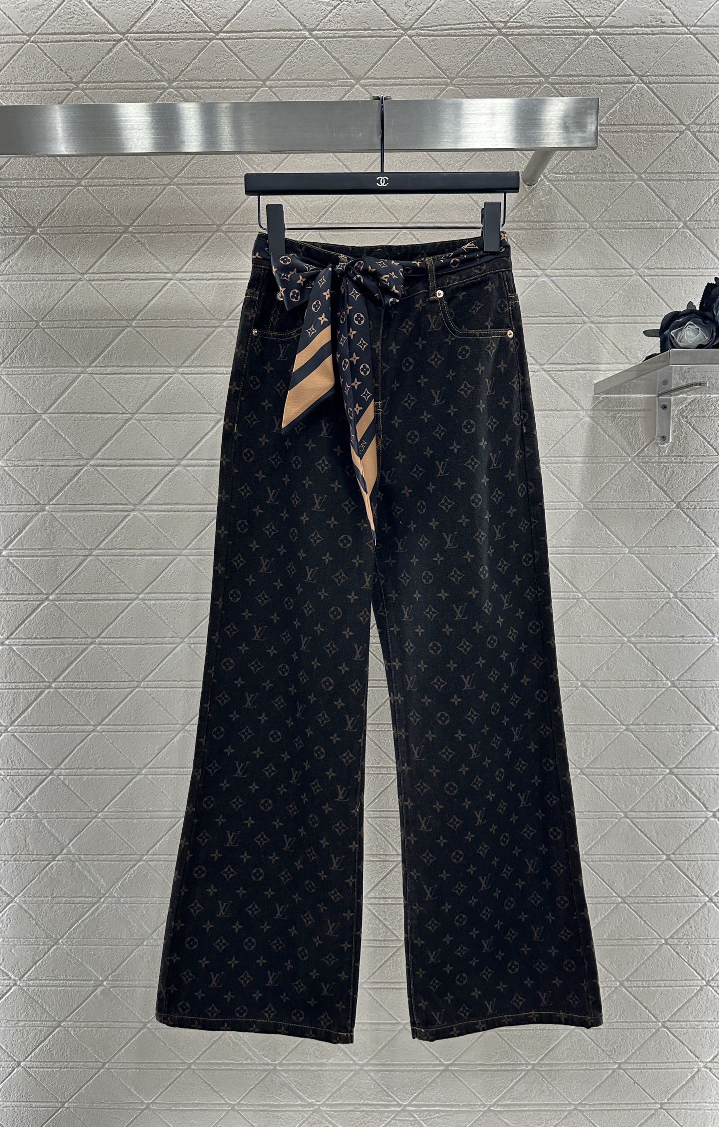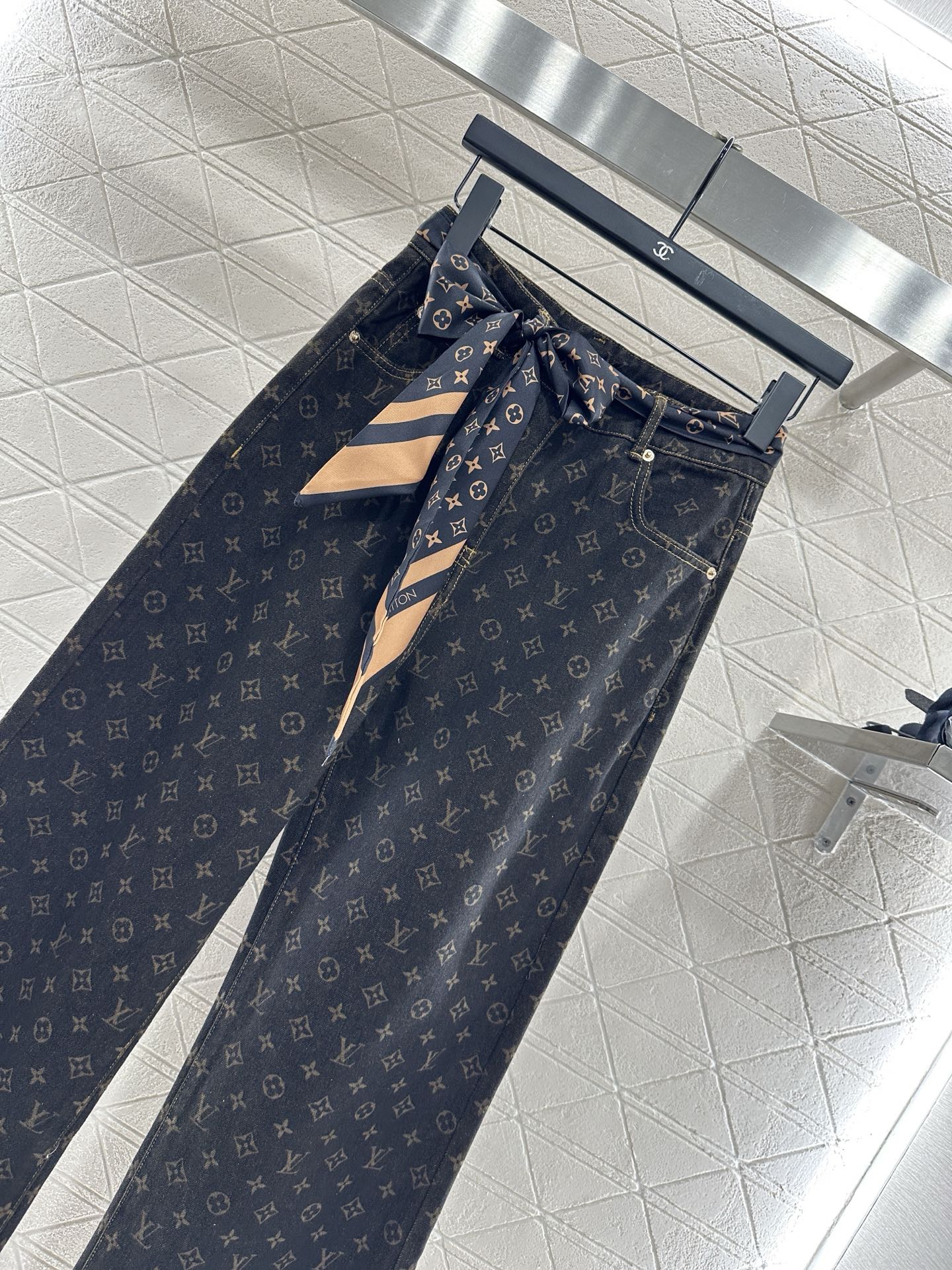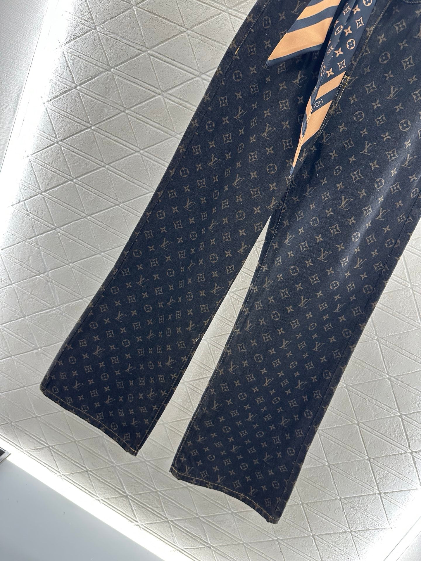 The twill cotton denim fabric has excellent breathability and is soft and skin friendly. The collar jacket and straight leg pants set are fully covered with four leaf clover and letter patterns, giving off a sense of old money. The front shoulder lines of the top are matched with the flip pocket and the style cut, highlighting the upright and neat posture. The waist and crotch ribbons of the same series of straight leg pants are raised, showing playful vitality. The design details echo the whole set of travel, making the outfit more coordinated, high-end, fashionable and stylish