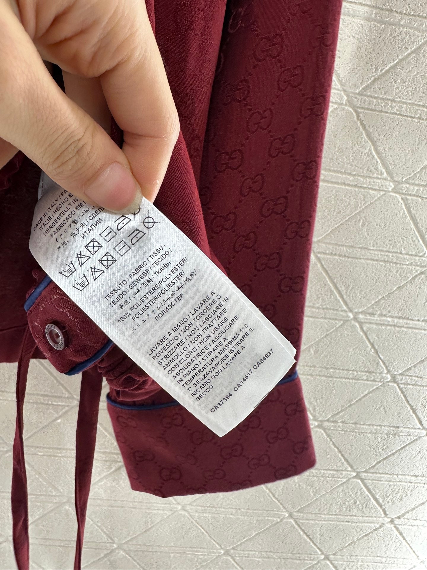 Jacquard material is soft and skin friendly, hanging and flowing throughout the body, presenting a diamond shaped distribution of the double G letter logo pattern, highlighting the brand's high-end style. The evergreen lapel shirt is cut and trimmed with a blue three-dimensional edge decoration. The lower hem is decorated with a drawstring that breaks the norm and provides a richer visual effect. The upper body temperament is relaxed and elegant, matched with a series of drawstring wide leg straight leg pants with strong inclusiveness, slimming and super relaxation. It can be freely matched to present a style full of old money