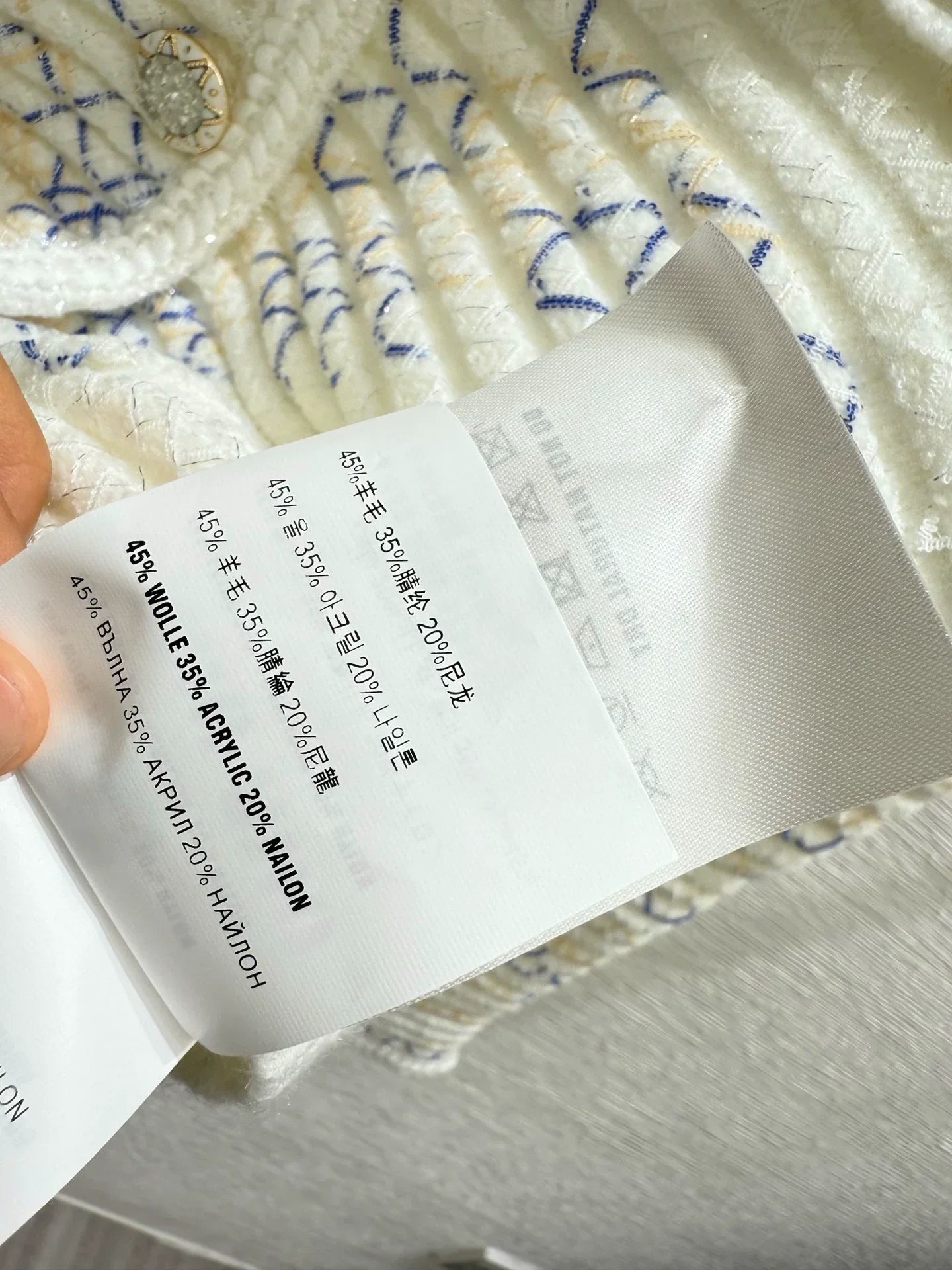 The fabric is made of 45% wool, 35% acrylic, and 20% nylon, with a soft and comfortable touch.