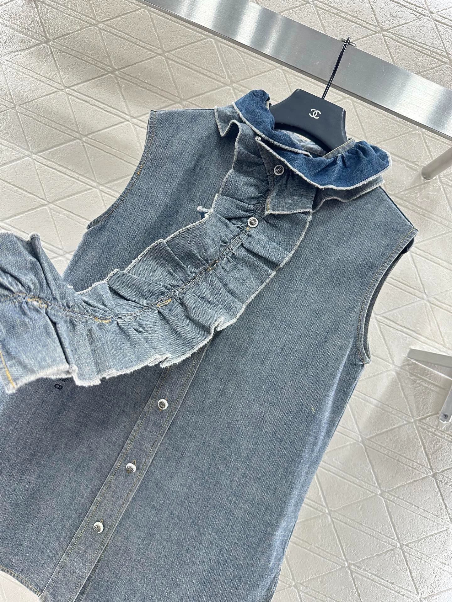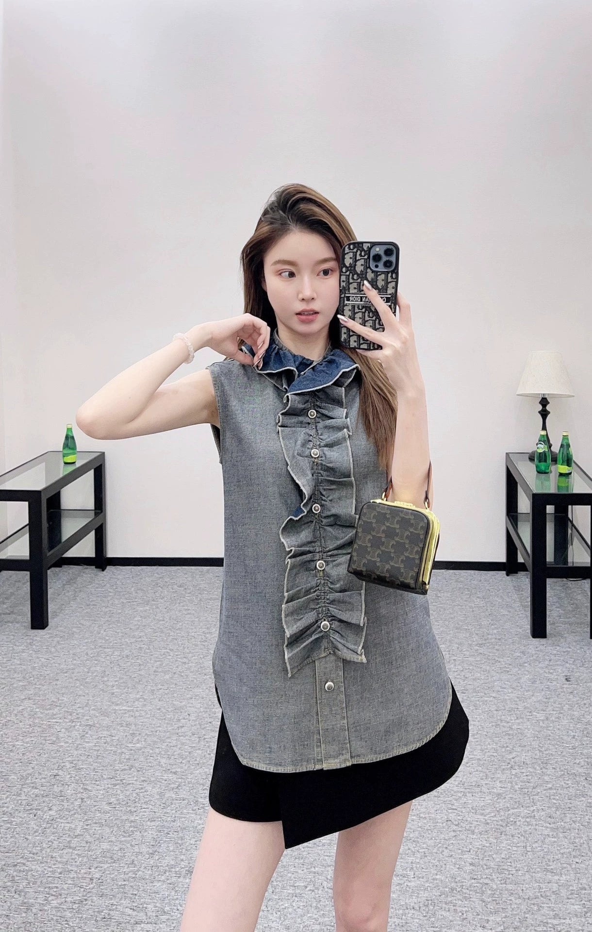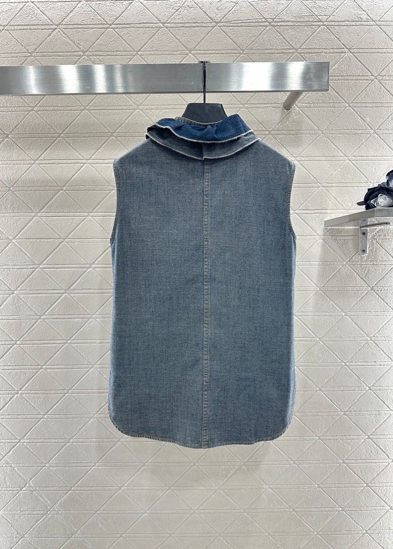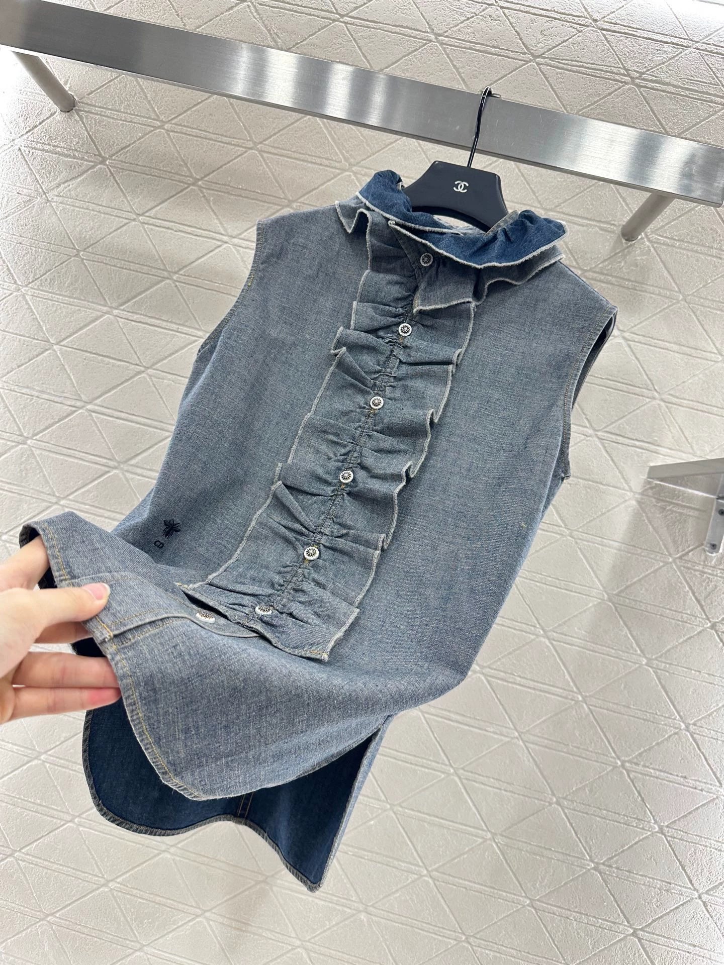 Twill cotton denim material with comfortable texture, flowing and stylish, deep and dark blue staggered collision, more retro button open top vest straight tube ➕ The side slit design is comfortable and easy to create, with minimal proportion restrictions on the body. The collar edge is wrinkled and the fungus lace can be disassembled into a front flap. It is fashionable and versatile, creating a casual and relaxed feeling. The artistic style of the outfit is perfect, adding a casual atmosphere to the waist. The bee CD letter logo enhances the brand's style