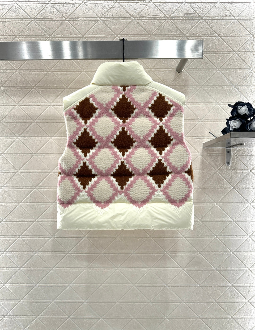 The upper layer of the shoulders and chest is decorated with knitted plush embroidery material, decorated with red and pink diamond grid patterns. The body is spliced with windproof nylon material, which collides with the material and exudes a fashionable and stylish style. The stand up down down zipper vest cut is full of design sense, with embossed badges on the chest, showcasing the brand's style. The rectangular embossed down is filled, the overall silhouette is upright, the loose fit is unique, and the embroidered splicing design is fashionable and stylish. It is the first choice for autumn and winter wear, and can be worn alone or stacked.