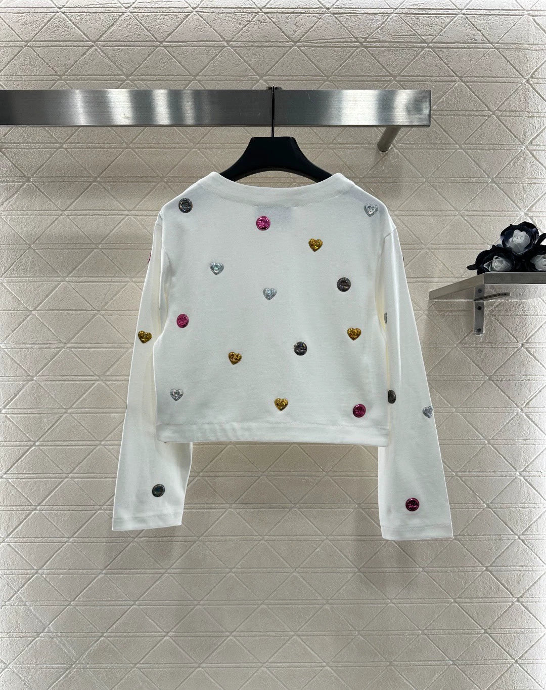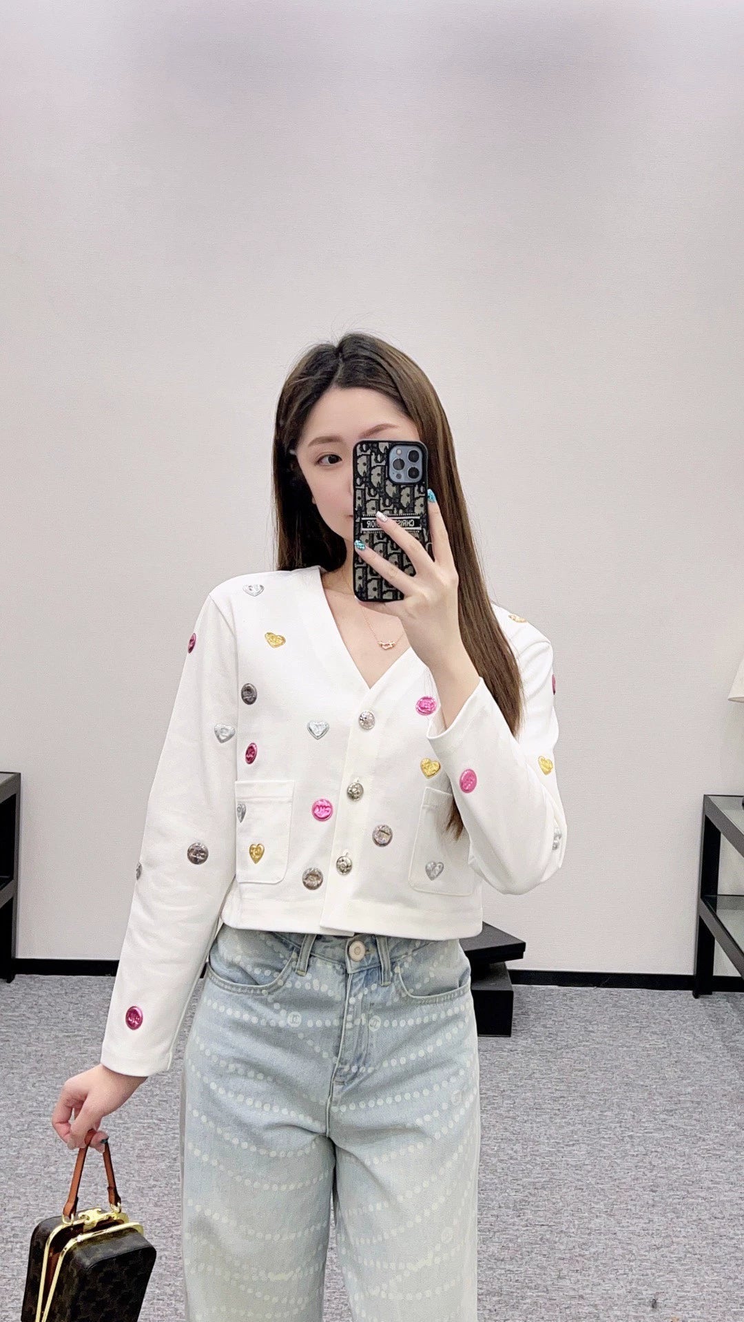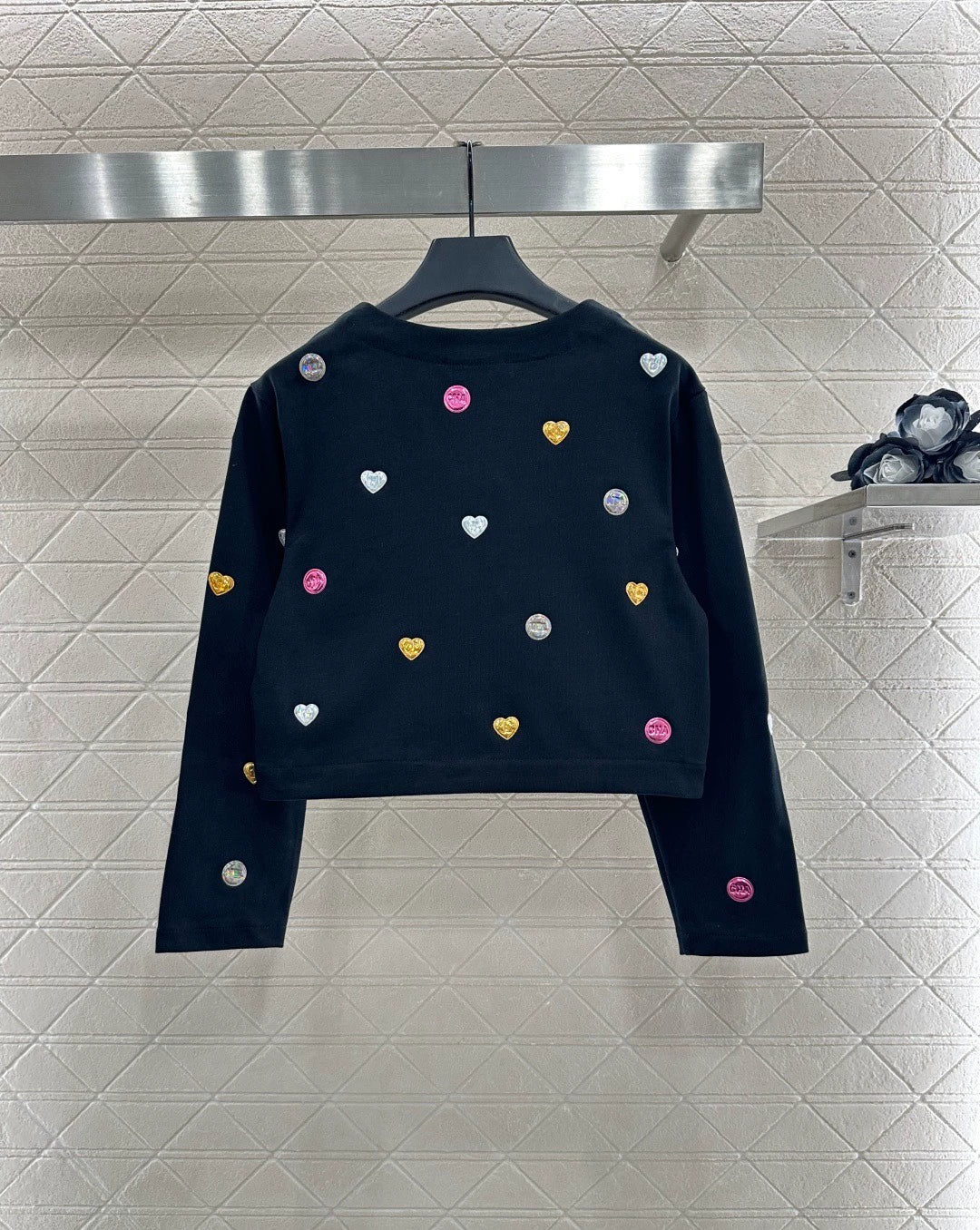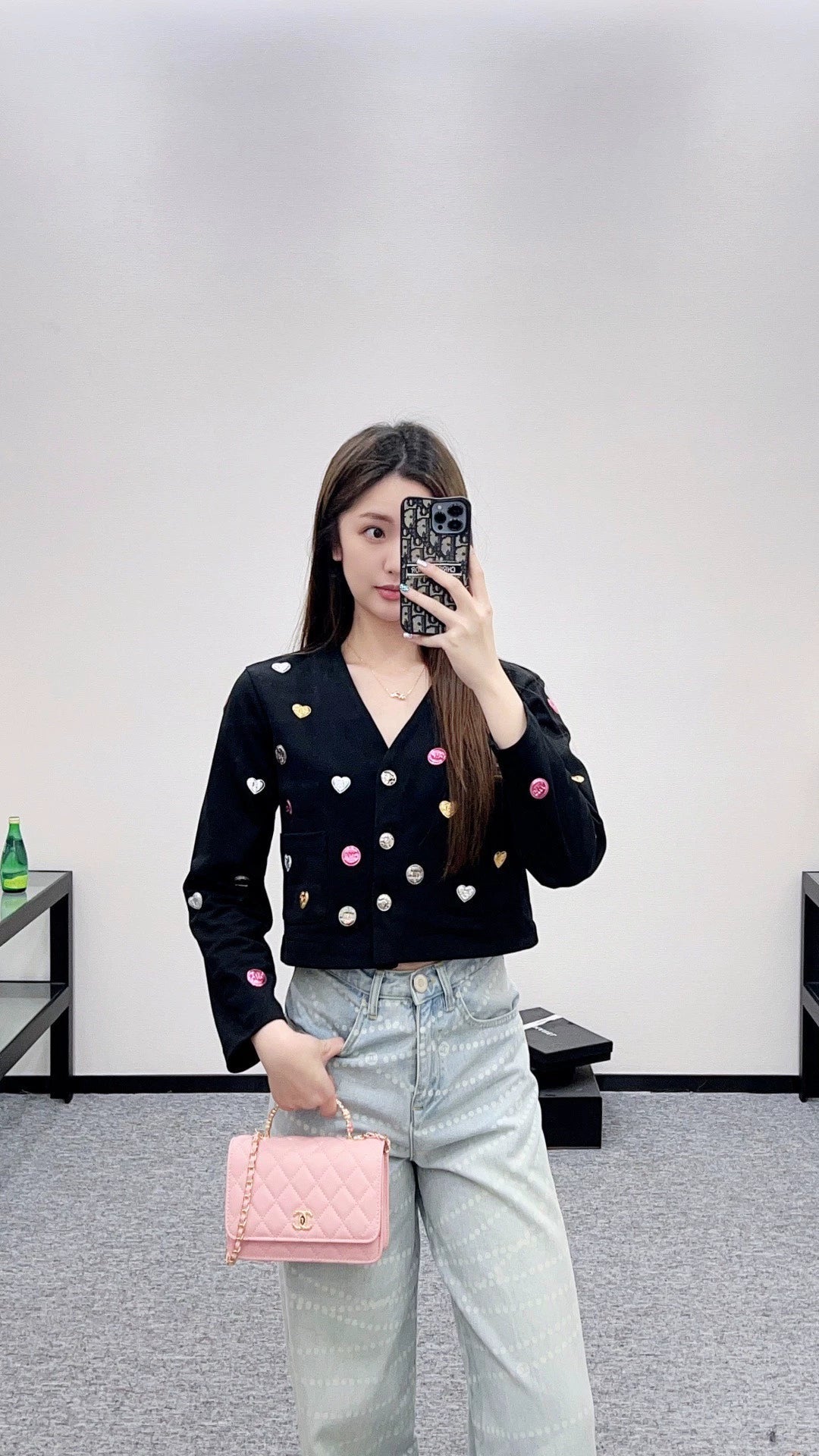 The twill cotton material has a delicate and comfortable texture, making it easy to wear. The V-neck short jacket is cut, embellished with molded twist buttons to modify the shoulder and neck lines, while adding a sense of delicacy. The whole body is decorated with a three-dimensional metal logo printed with a double C logo, combined with jumping colors to add vitality. It shows fashion and breaks the dull atmosphere of autumn and winter. It is stylish and high-end