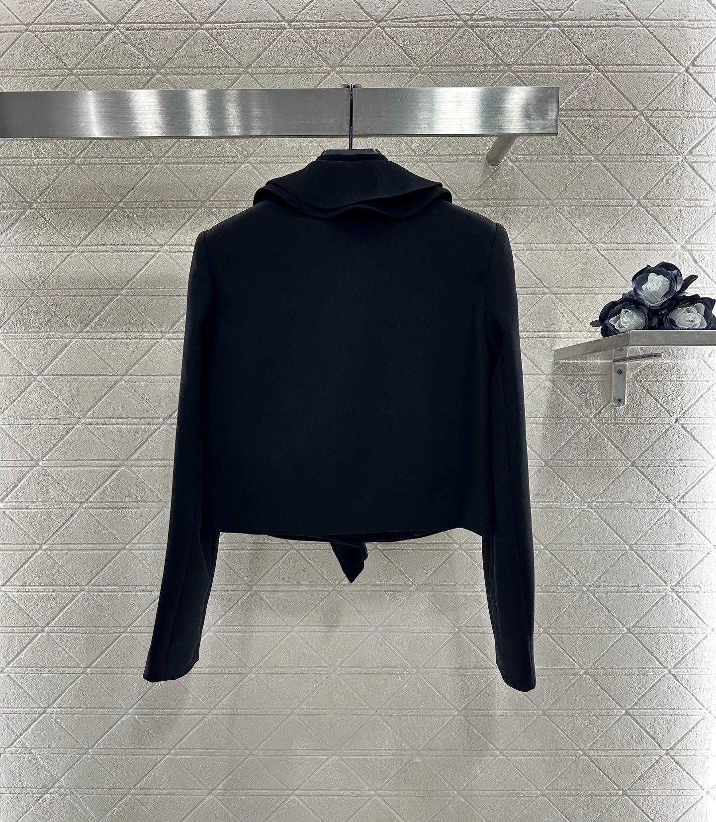 Imported material texture, high-end appearance, full of lace lapel jacket. The collar extends to the front and is embellished with three-dimensional detachable fungus edges to create an elegant and luxurious feeling. The shoulder pad design fits the human body and makes the figure more slender and straight. The whole body is made of pure black with symmetrical pockets and a rhinestone lapel buckle. The details are illuminated, and the straight slit half skirt of the same series echoes the high-end and delicate perception. It is the best choice for attending formal occasions