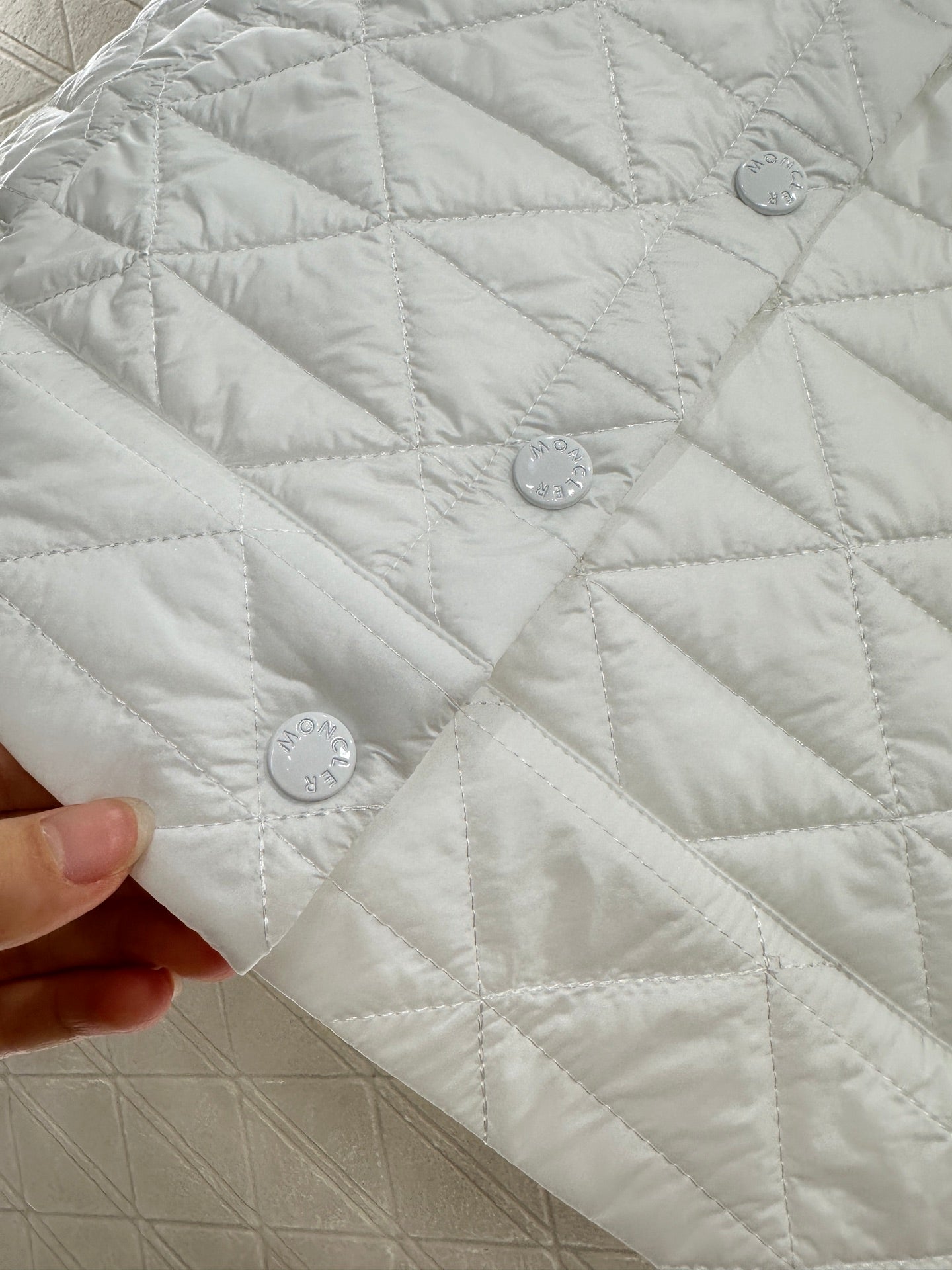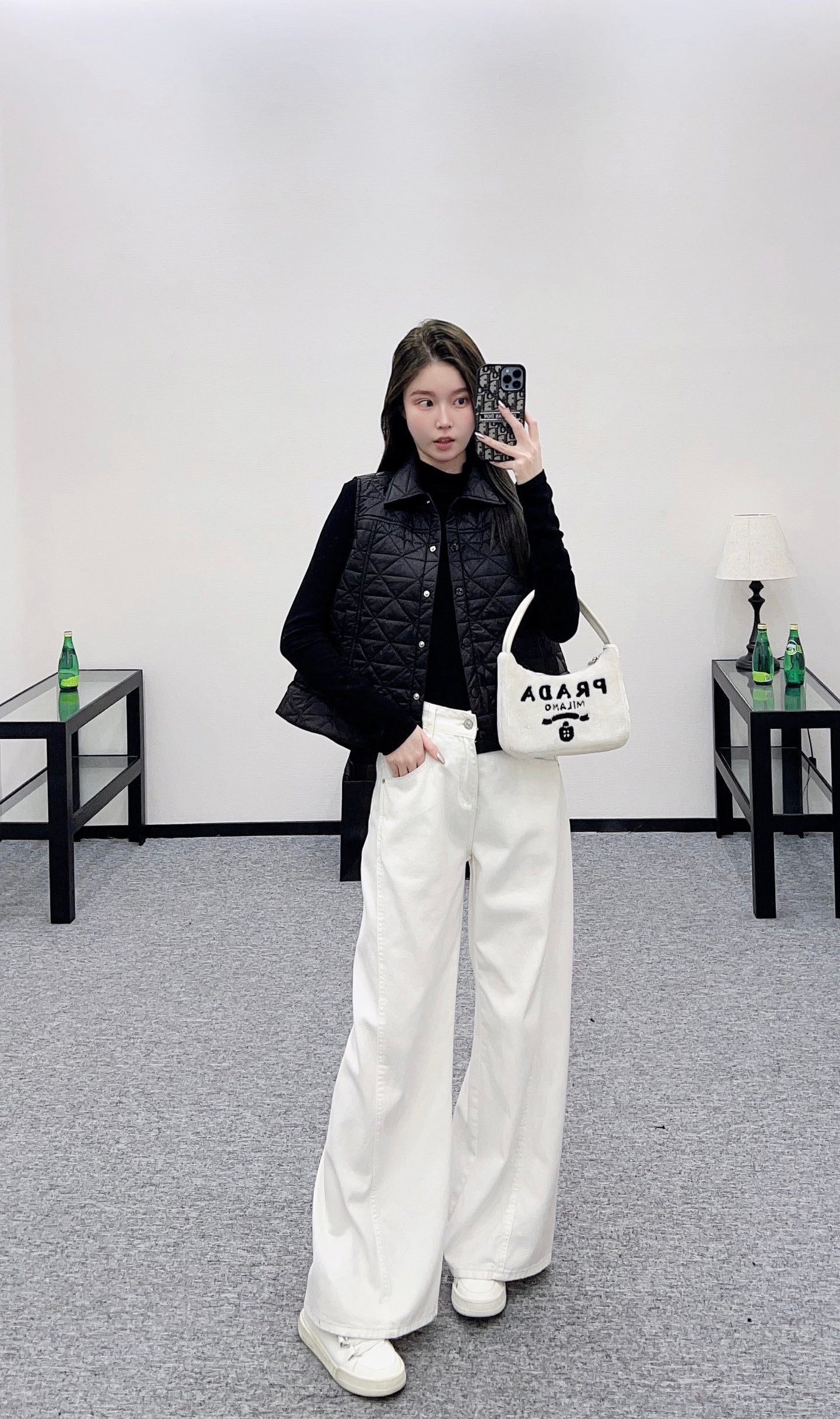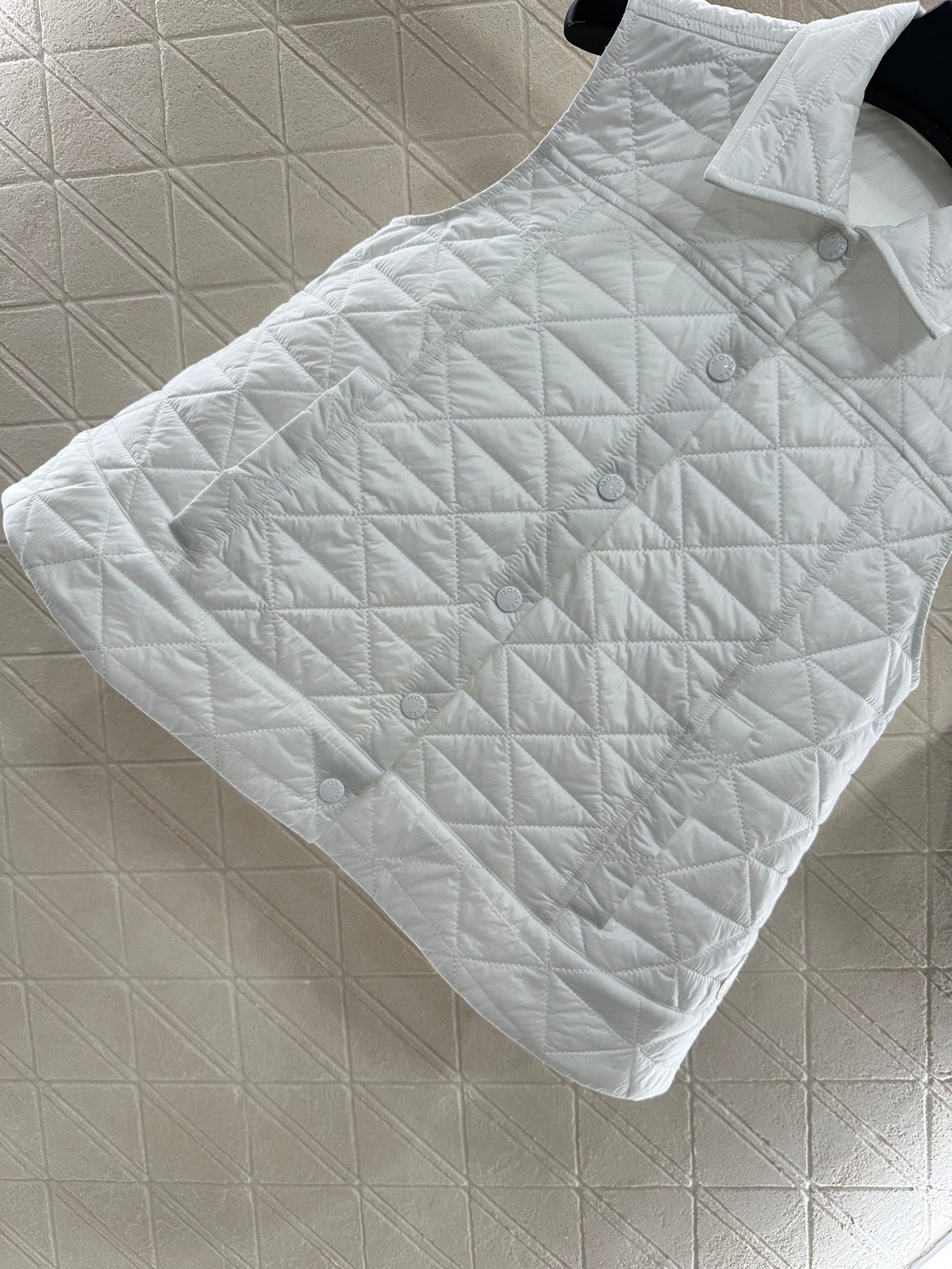 Custom YB windproof and waterproof nylon material with down-filled lining. Lightweight and warm. Thin vest that's stylish without looking bulky. Lapel and snap buttons on the front for warmth and wind protection. Raglan texture. Signature brand seal at the waist hem. Details highlight the brand's philosophy. The hem features an A-line flared design for a stylish look. Perfect for layering in fall and winter.