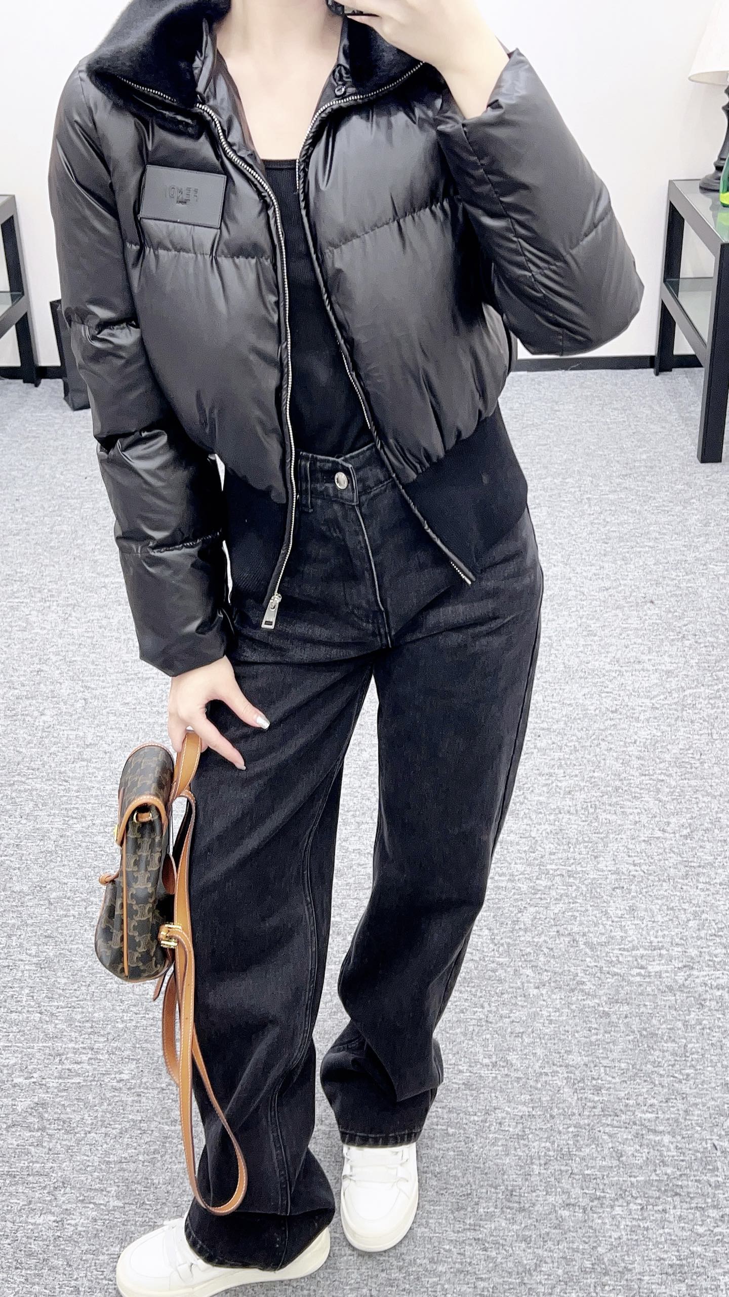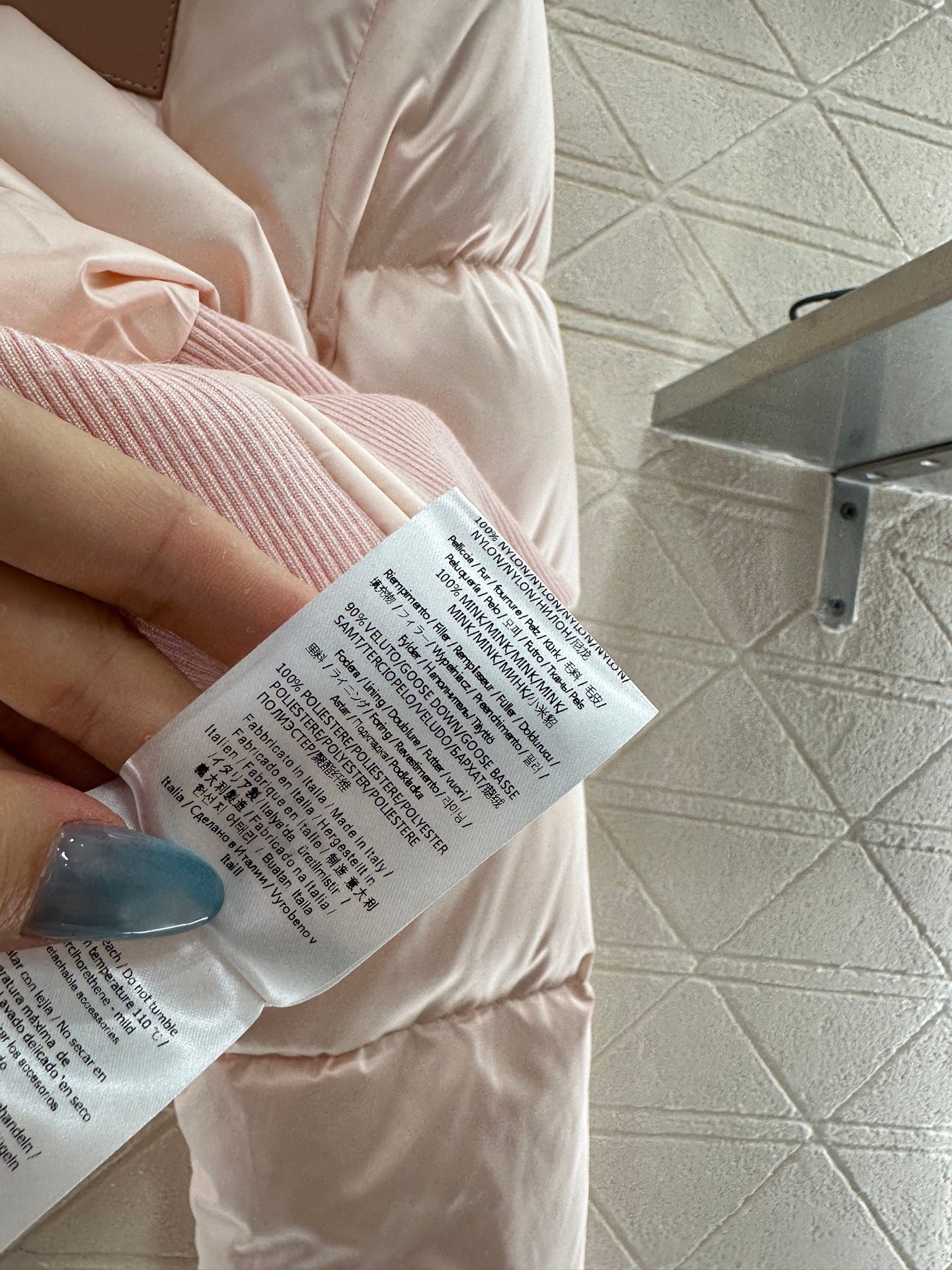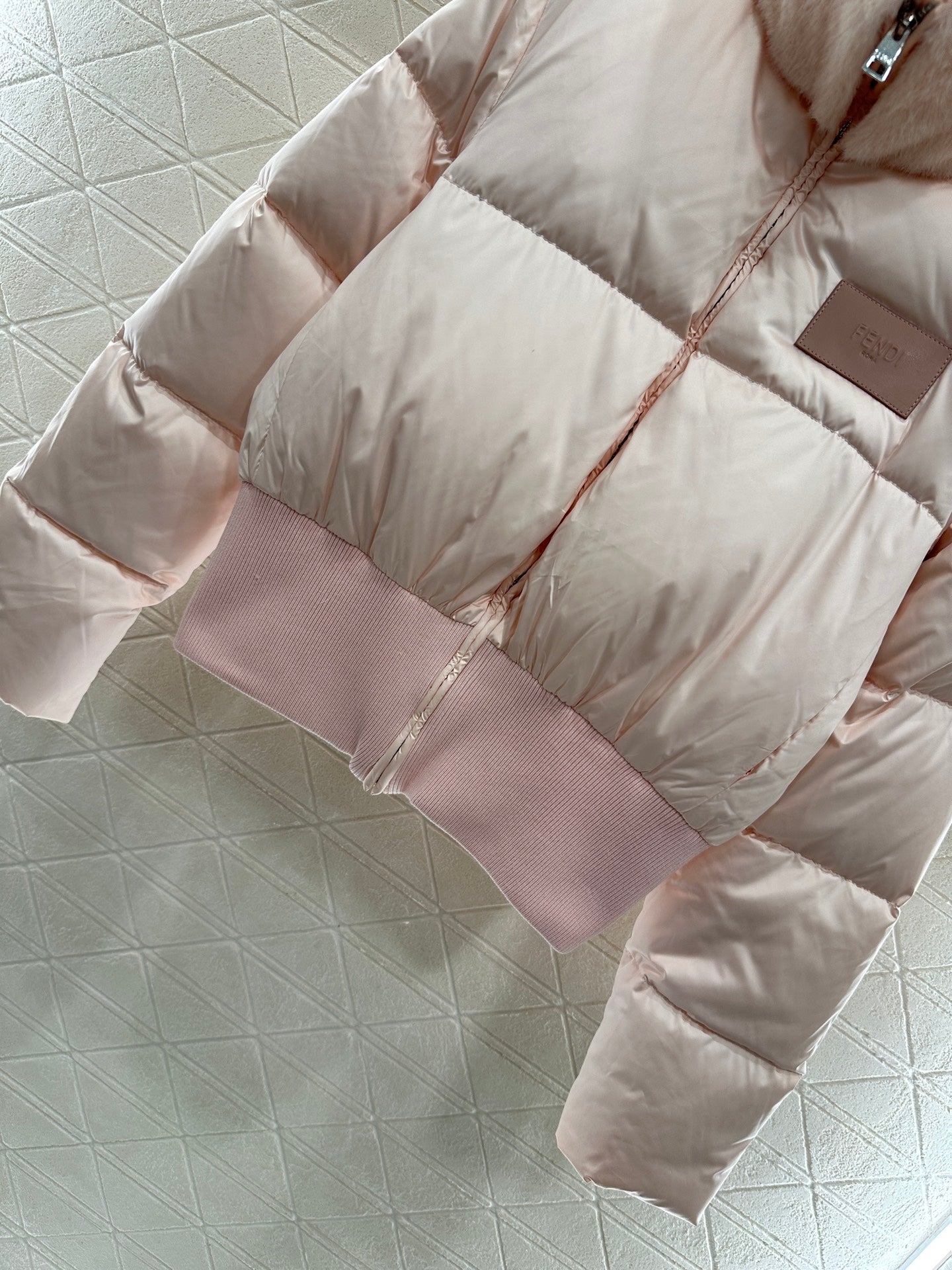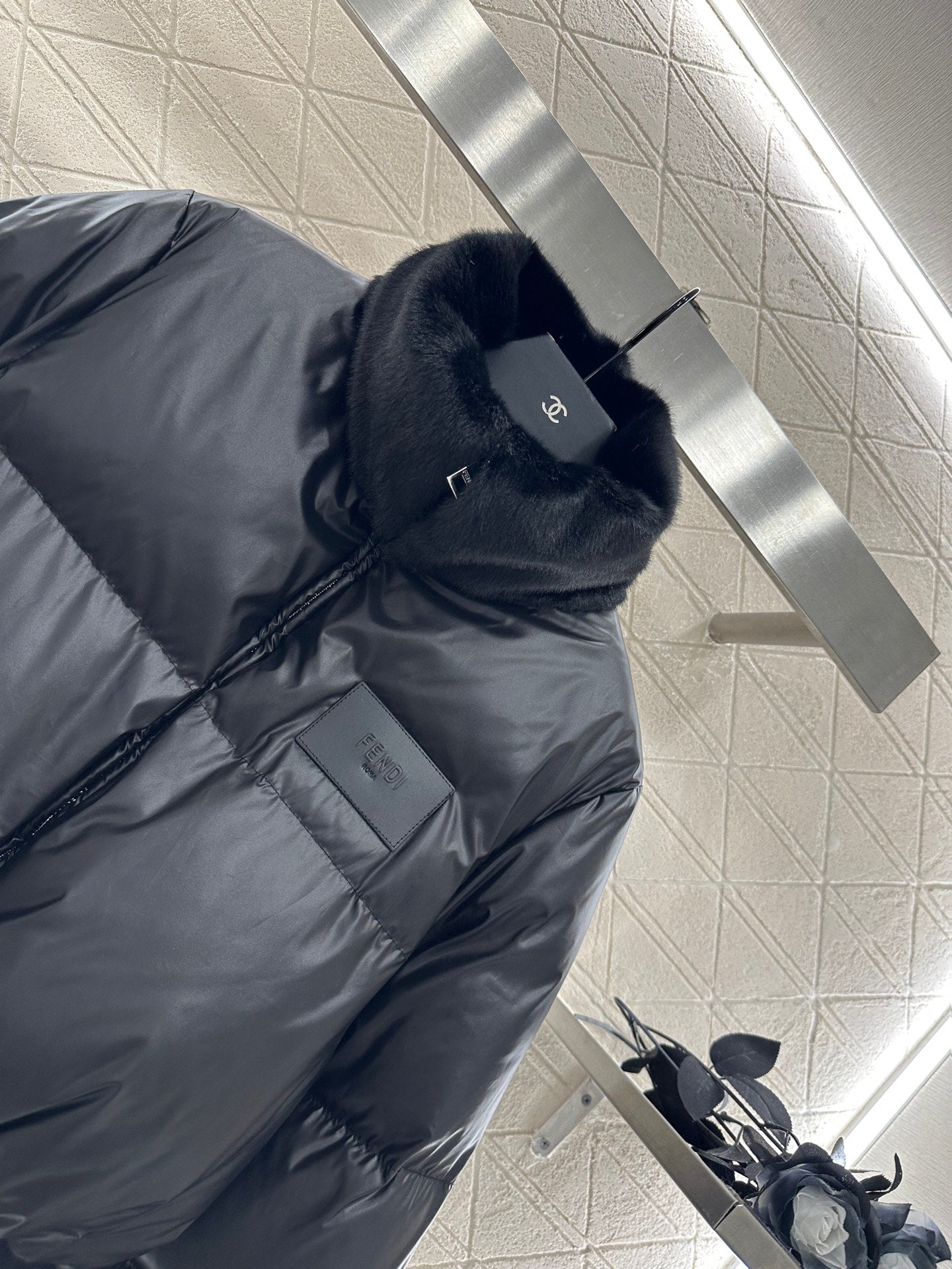 Made of custom YB windproof and waterproof glossy nylon with a white goose down lining, it's lightweight and warm. The stand-up collar features mink fur for warmth and a luxurious finish. The zippered placket, accented with a satin finish, adds a playful touch, complementing the leather chest patch for a stylish look. Elastic threaded hem and cuffs provide added warmth, while the cropped silhouette offers a lighter, more stylish look, eliminating the heavy feel of autumn and winter.