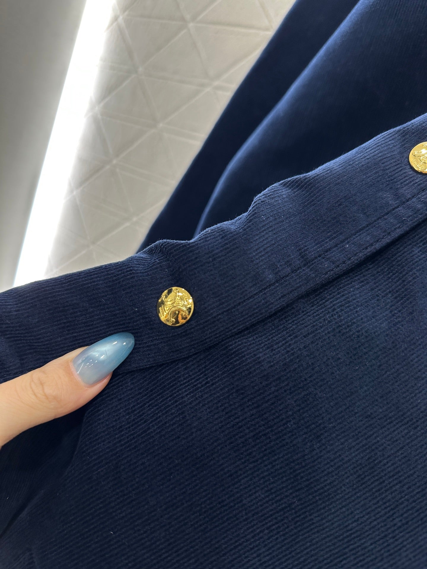 Custom YB imported corduroy + nylon material, crafted with a crisp and stylish design and high-quality texture. The mid-length jacket with snap button opening and hood is made of light gray sweatshirt fabric, creating a collision of styles. The dropped shoulder design creates a relaxed and casual style. The diamond embossed lining and down cotton filling ensure warmth while making the outfit more neat and fashionable. It is a must-have item that combines fashion and practicality. It is suitable for daily layering. With the Arc de Triomphe logo on the chest, it has a charming British elegance.