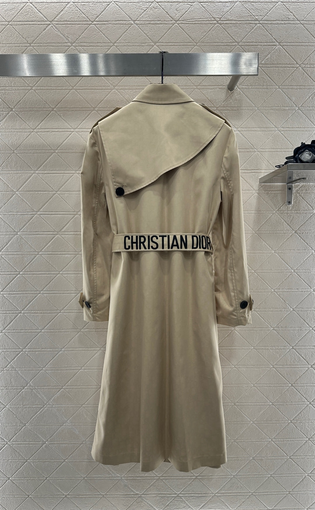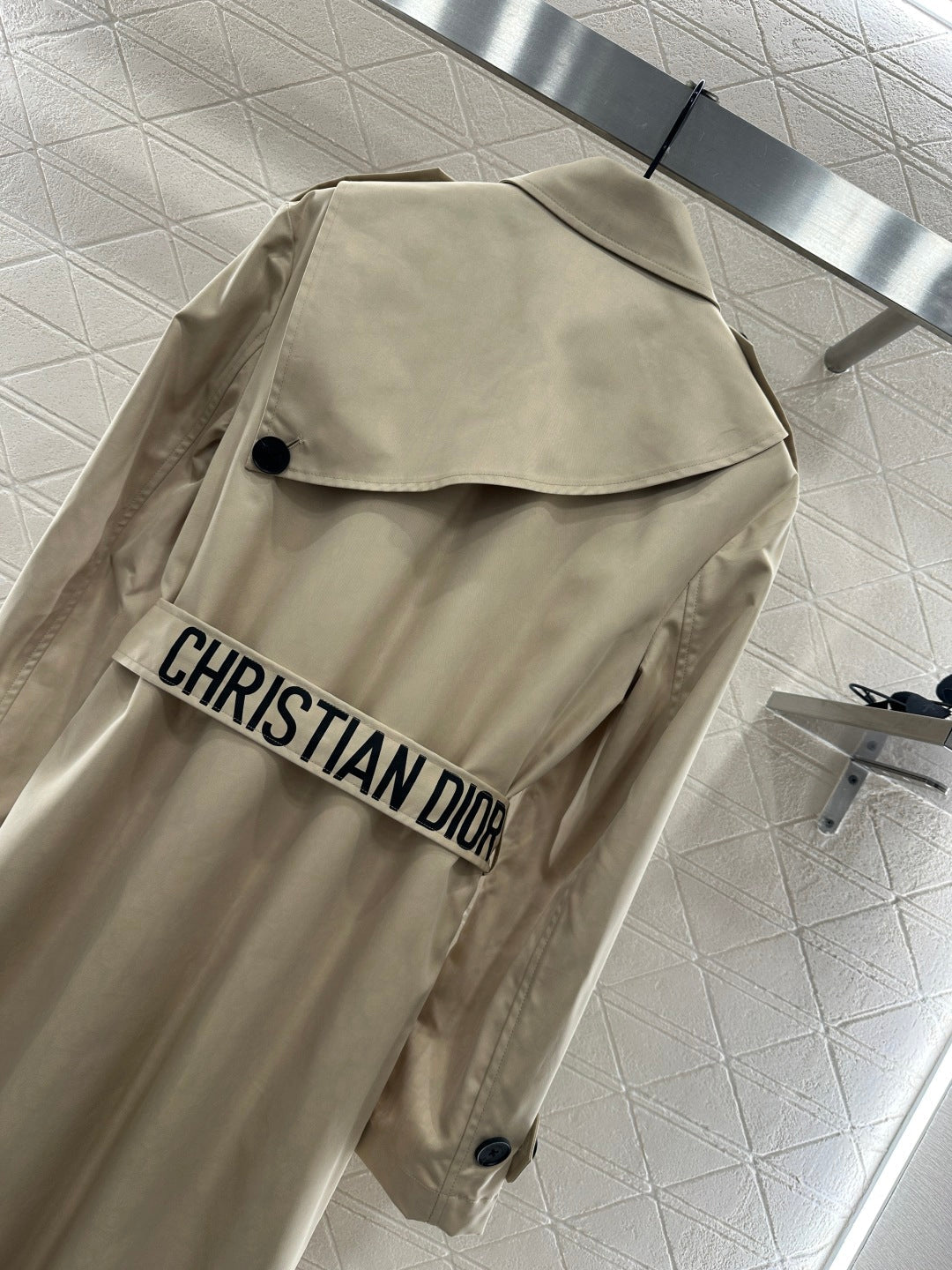 Custom YB imported trench coat material and craftsmanship create a crisp and stylish look with a high-quality texture. The long, waisted trench coat with a lapel has a symmetrical folded shawl design at the neckline. The double row of buttons on the front and the irregular shawl decoration on the back collar echo each other, enhancing the layering of the garment. The belt design outlines the graceful figure. The letter embroidery complements the iconic monogram letter lining. When opened, it shows the brand's tone in a low-key manner, creating an elegant silhouette. This seasonal trench coat is both fashionable and practical. The wearer has a charming British elegance. Customized fabrics and accessories