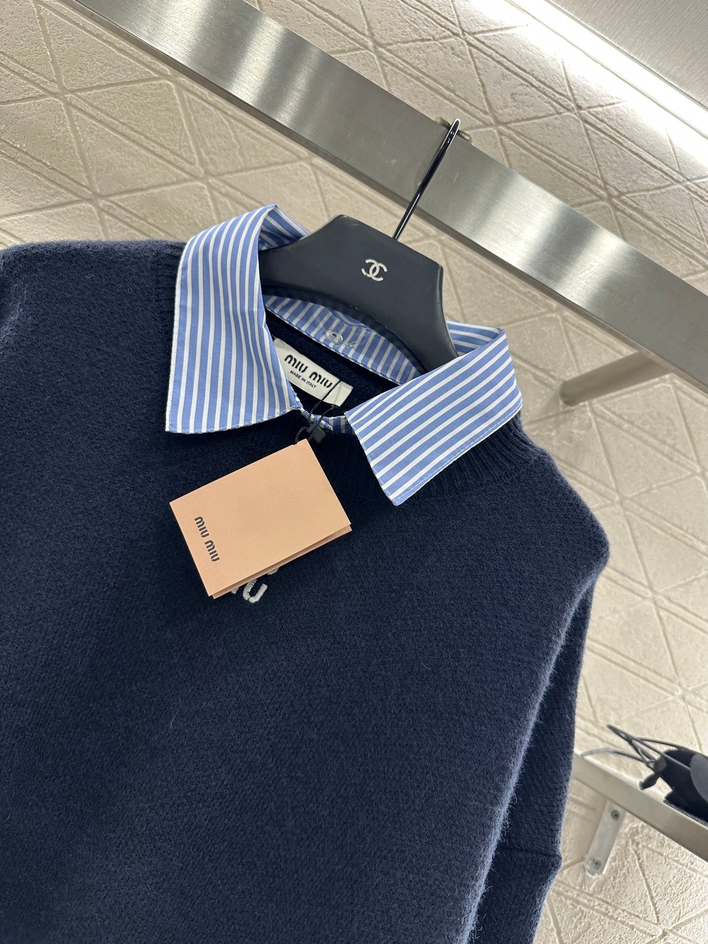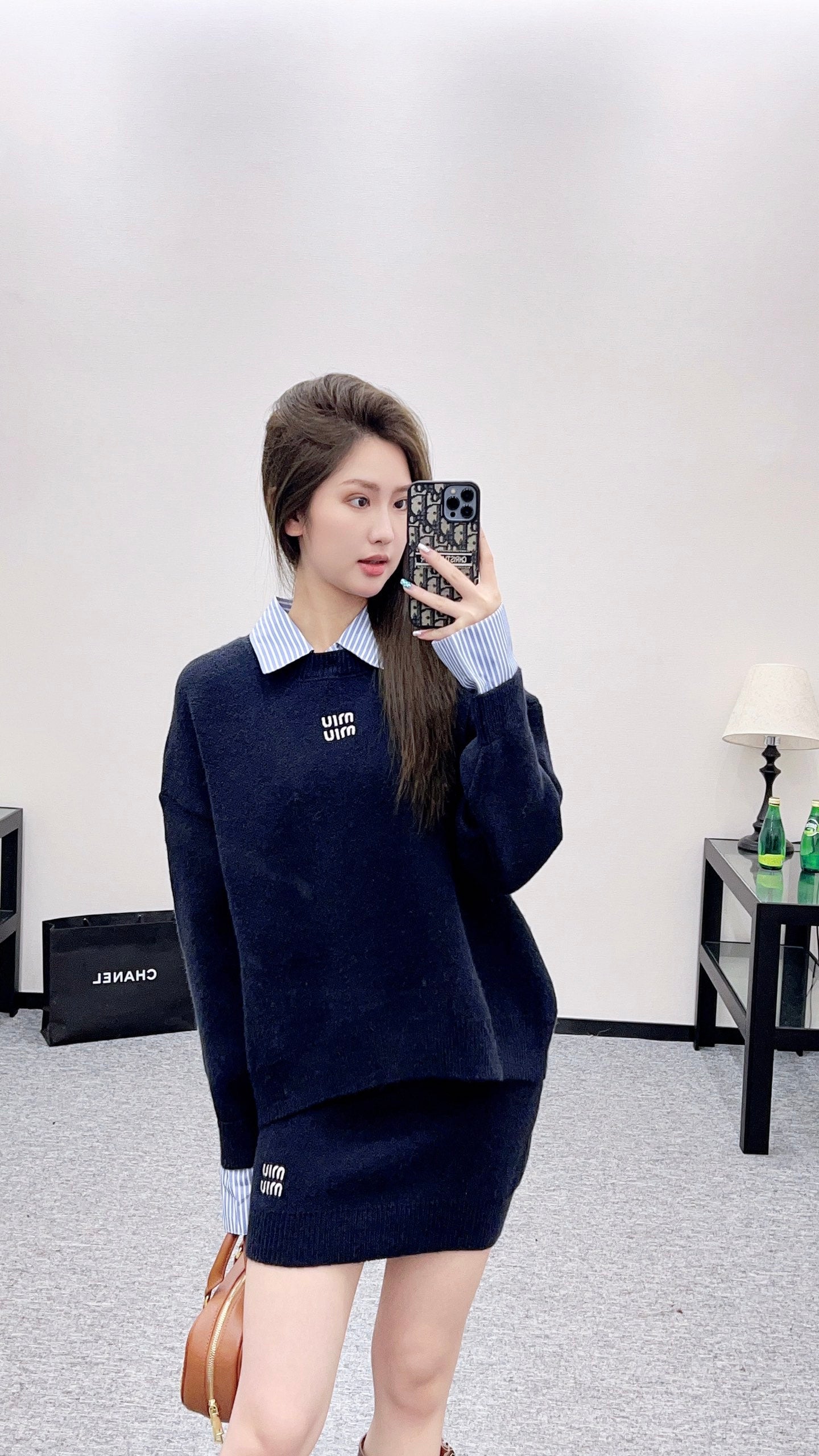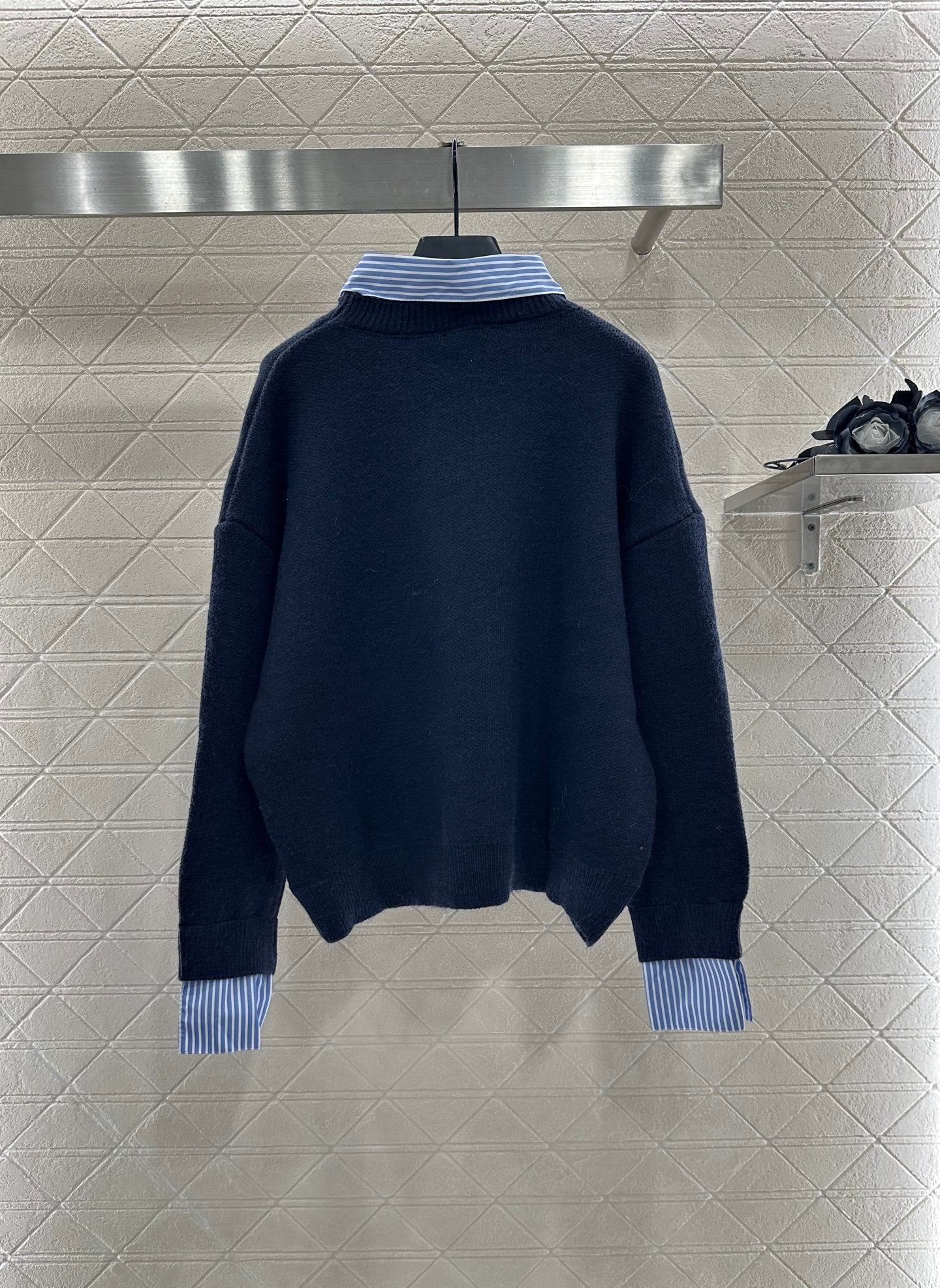 Customized YB wool material + cotton shirt fabric, stretchy and comfortable, full of texture. The lapel pullover top is cut, and the upper body presents a casual and lazy style. The torso is made of knitted material, and the collar and cuffs are spliced with white and blue striped shirts, forming a double collision of color and fabric, creating a false two-piece layered effect, adding a high and casual feeling to the outfit. It is fashionable to wear alone or as an inner layer, and the letter logo on the chest highlights the brand style. Wear it with the straight-tube hip-wrapped knitted skirt from the same series, the style is fashionable and age-reducing