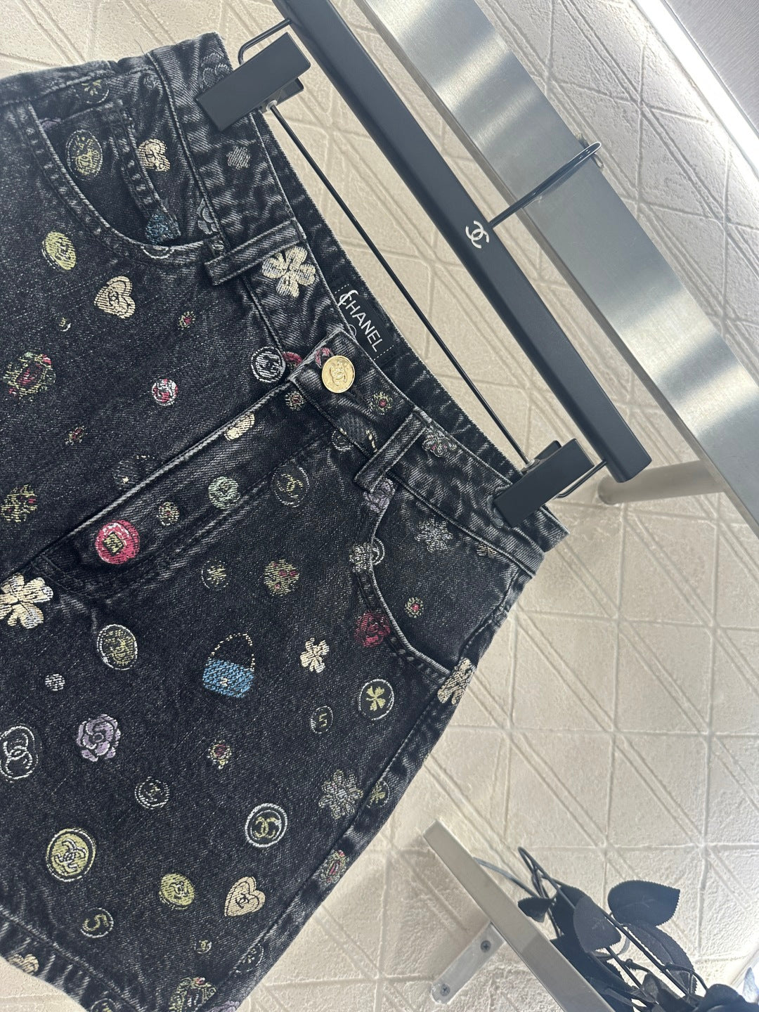 Custom YB twill cotton denim material, multiple washes, presenting a crisp texture. Straight-leg wide-leg shorts cut, symmetrical pockets with a basic silhouette that is durable and advanced. The entire body is laser-paved with irregular camellia + fifth element double C pattern. The colorful interweaving and jumping echoes the gold buckle, highlighting the brand style. The complex visual effect creates a romantic and aesthetic style full of personality and creativity. The trouser legs are accommodating to the body. The brand's high-end design sense is full. It looks colorful and fashionable with any combination. Suitable for all seasons.