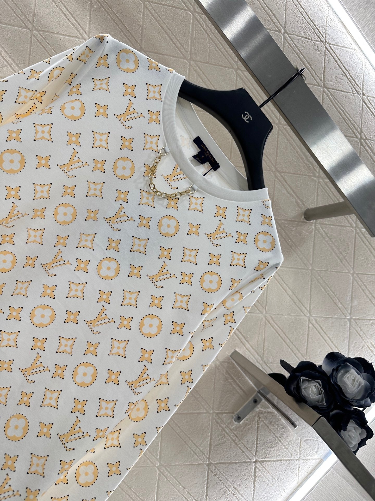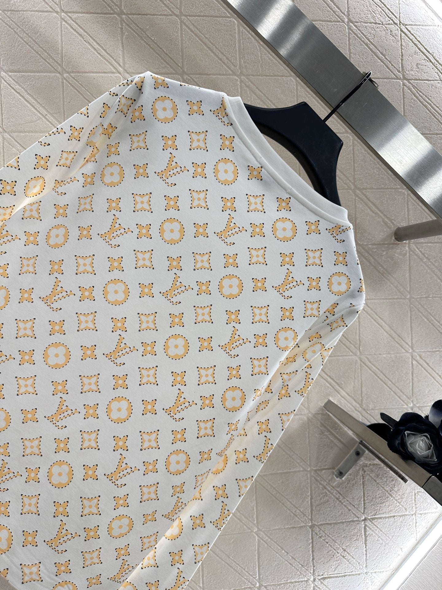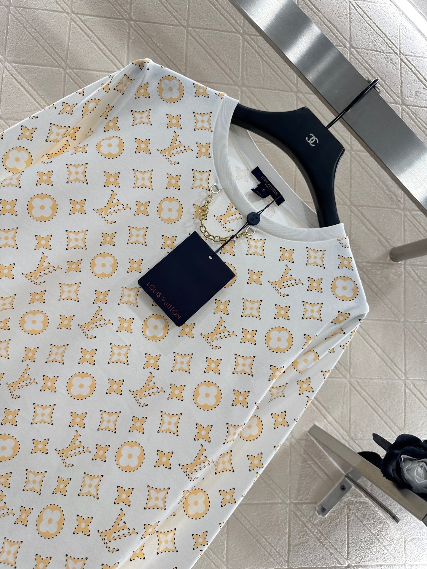 The twill cotton material is breathable and comfortable, with a strong texture. The regular long sleeved top is cut to highlight the brand style. It is made of heavy-duty pure cotton with slight elasticity, presenting a slimming visual effect. The collar is marked with metal letters and chains ➕ The same color thread edging design highlights the large body printed with four leaf clover letter patterns, combined with the breakpoint hook edge effect, adding a youthful atmosphere and making it fashionable when worn alone