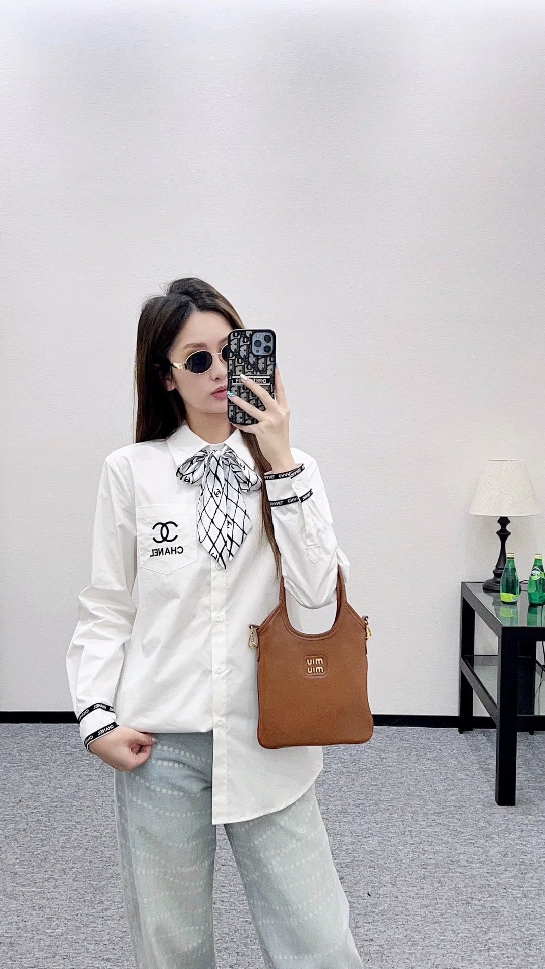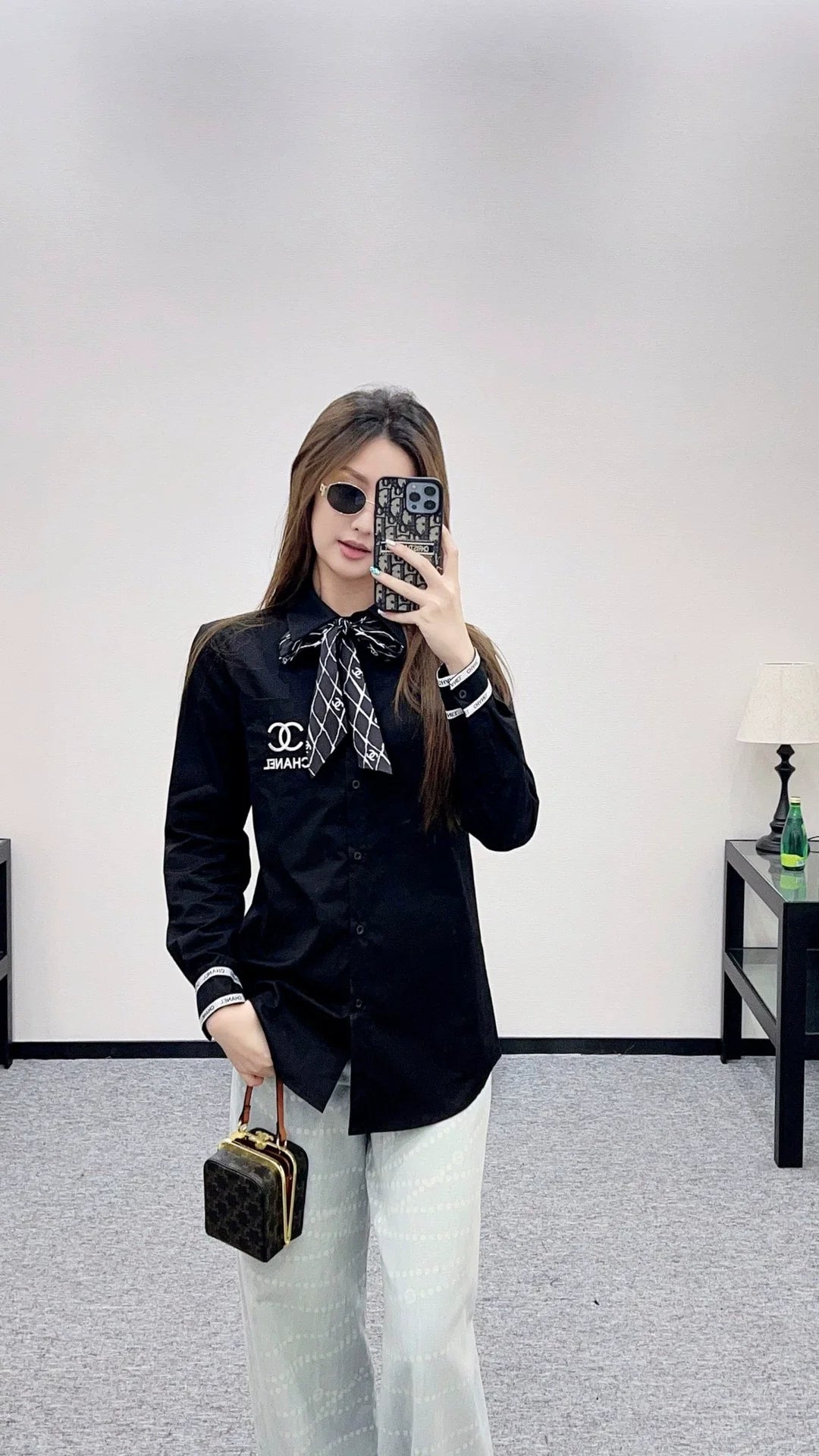 The twill cotton material has a comfortable and delicate texture, full of breathability. The lapel shirt has a clean cut, slim fit, and a solid color tone that is versatile and durable. The collar is covered with diamond grid elements, and the double C logo printed silk scarf can be loose or tied. The gameplay is more fashionable and matches the chest pocket ➕ The double bar striped logo on the cuffs exudes a fashionable and sophisticated style, showcasing a high-end aesthetic