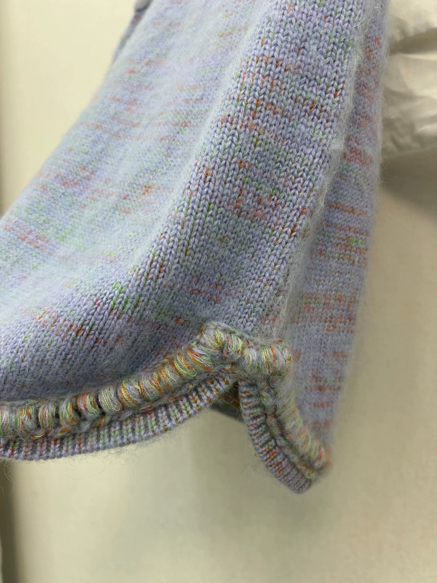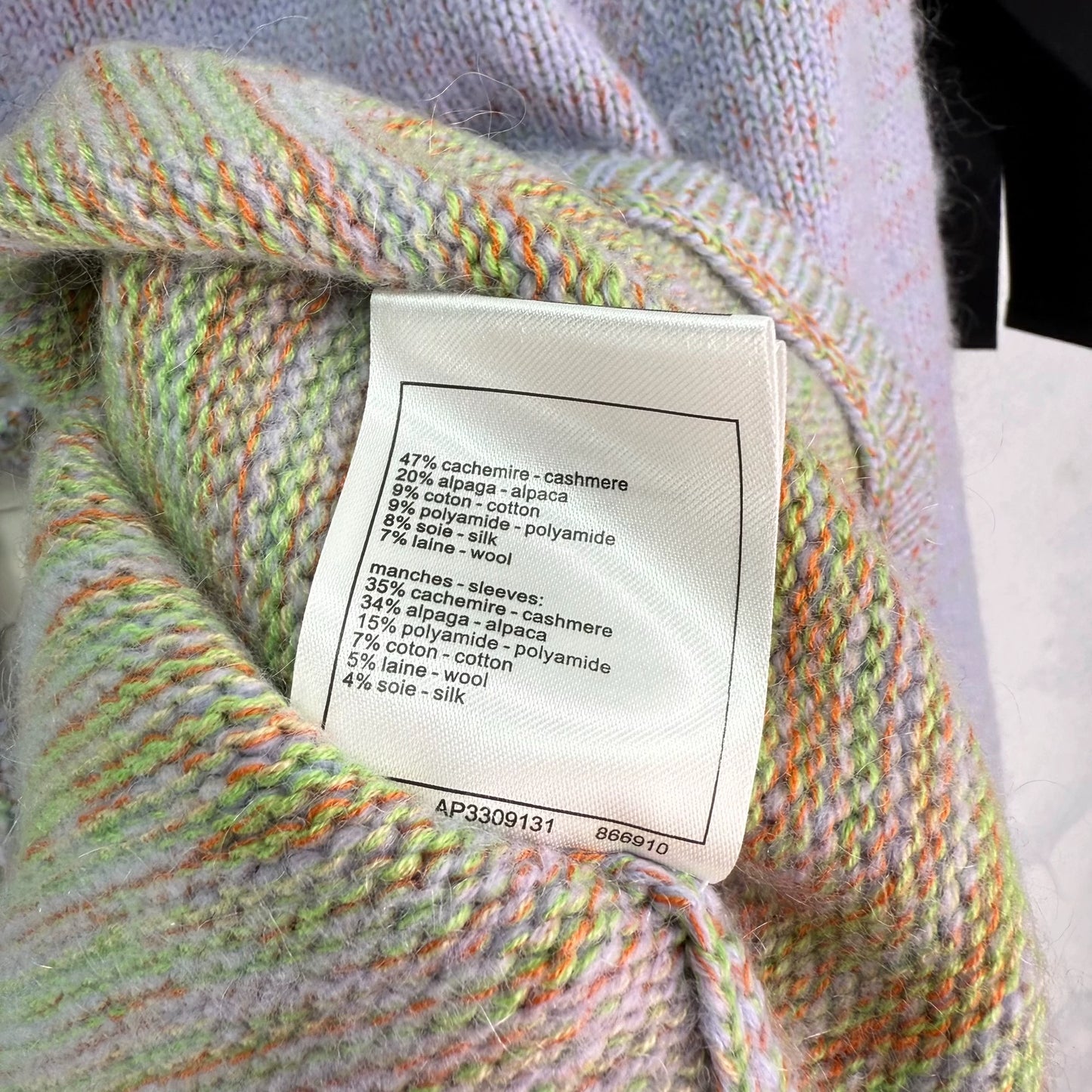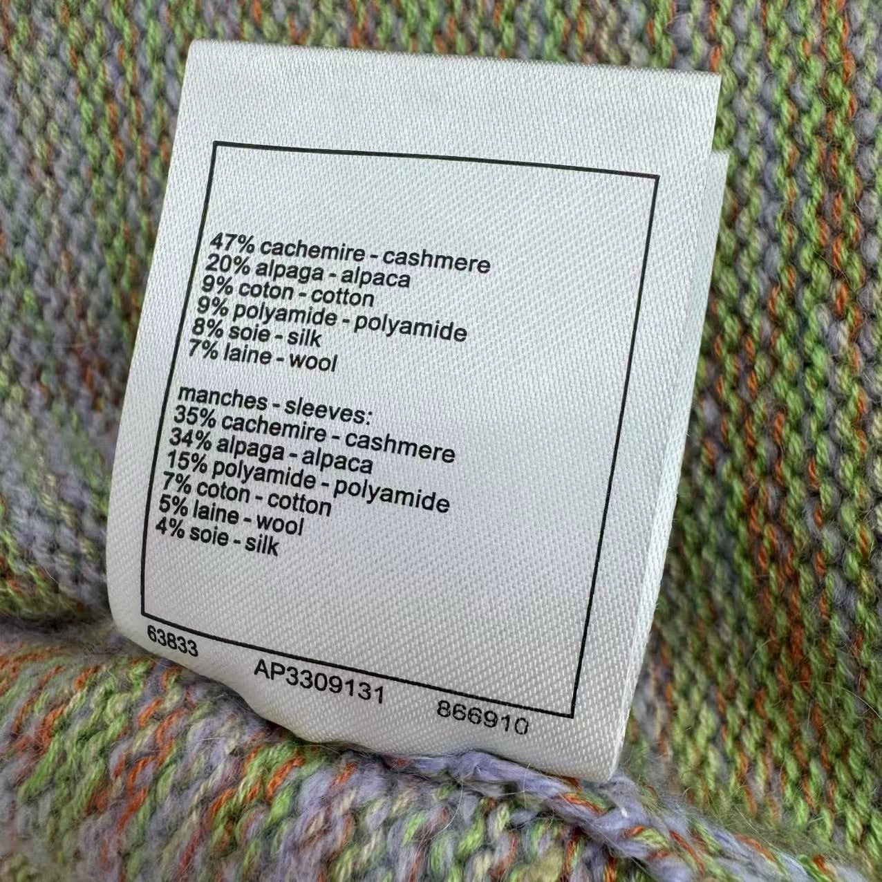 The fabric is made of 47% cashmere, 20% alpaca wool, 9% cotton, 9% nylon, 8% silk, and 7% wool, with a soft and comfortable touch. Exquisite woven lace decoration and rhinestone double C-buckle design, showcasing elegance. Suitable for wearing in spring and autumn seasons, long sleeved design