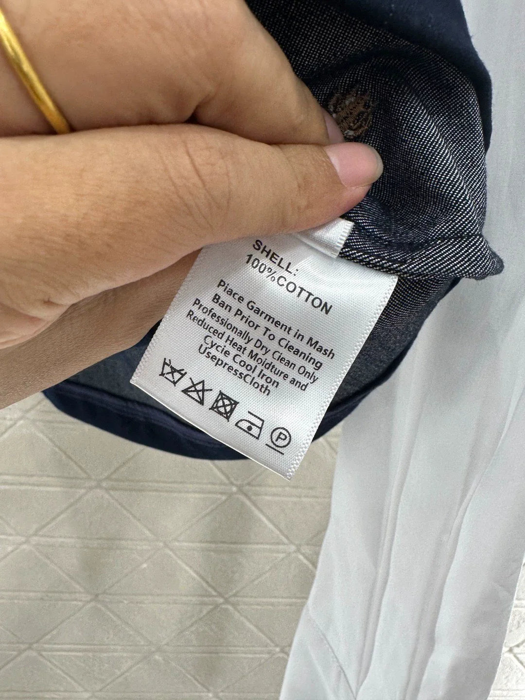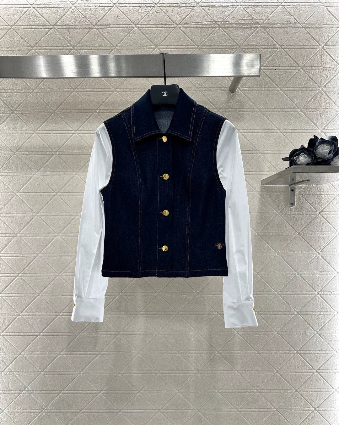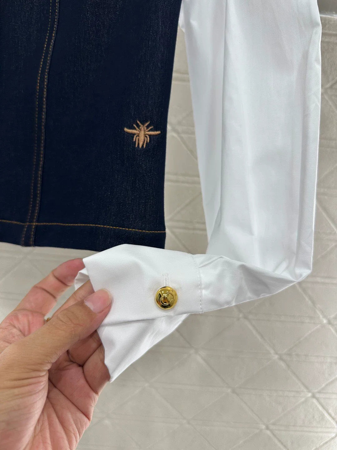 The twill cotton denim material is washed multiple times to present a crisp texture. The collar and shoulder denim shirt are cut with two sleeves, and the pure white shirt fabric collides with the body, forming a basic contour line that is durable. The bee embroidery logo at the waist highlights the brand's complex visual effects, creating a fashionable style full of personality and creativity. The wide leg straight leg pants in the same series are decorated with a belt, and the brand's high-end design is fully satisfied
