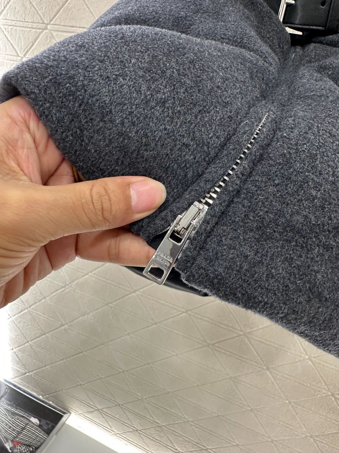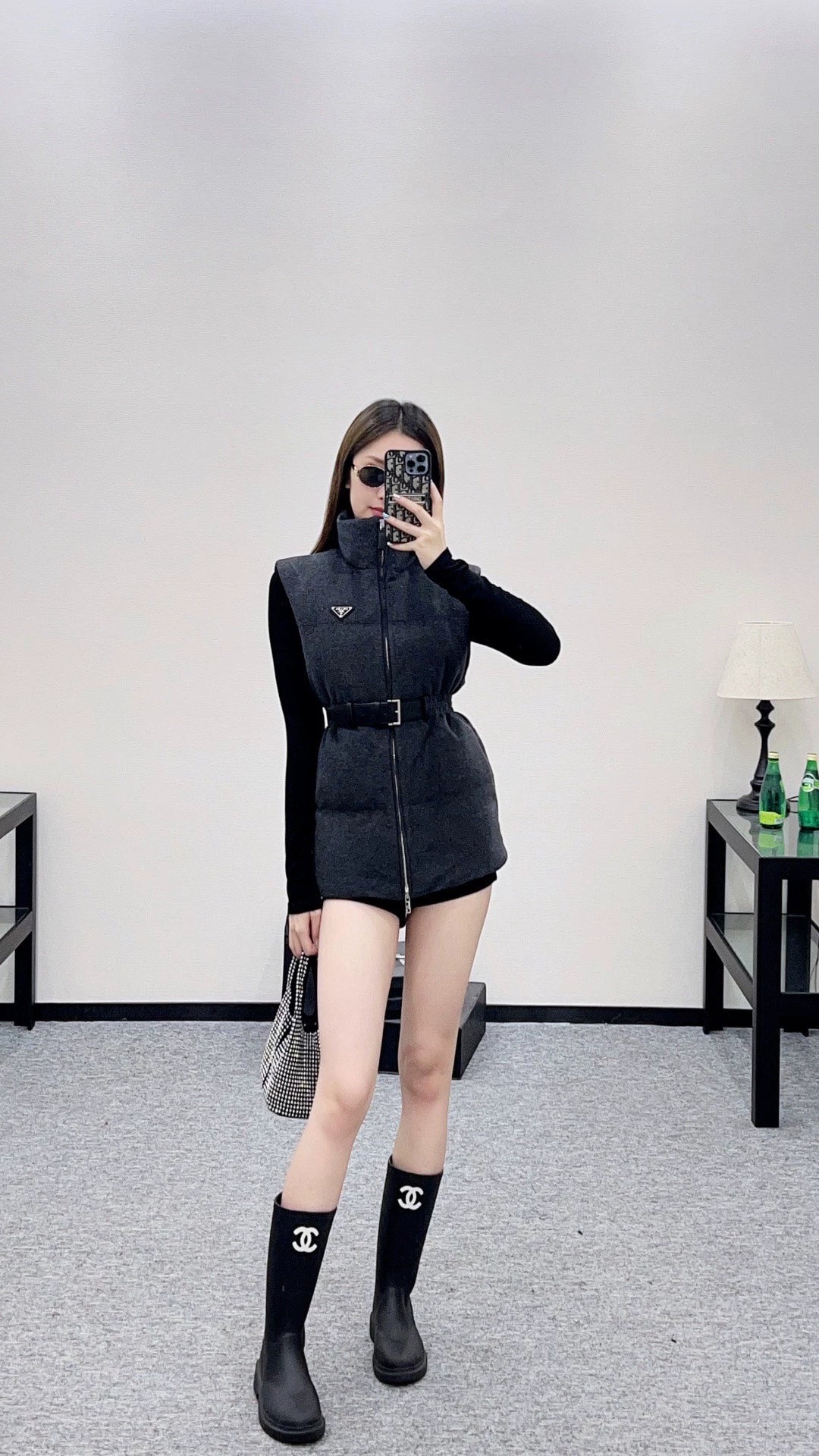 The whole piece is lightweight and warm, with a stand up collar and a lapel. It is a slim fit vest that is warm and not bulky. It has stronger wearability and is more classic. The rectangular grid texture is matched with the classic triangular letter logo, presenting a high-end style and taste. The waist is wrapped around the elastic splicing belt design, which is different from the large version. It combines warmth and fashion, getting rid of the traditional down and bulky