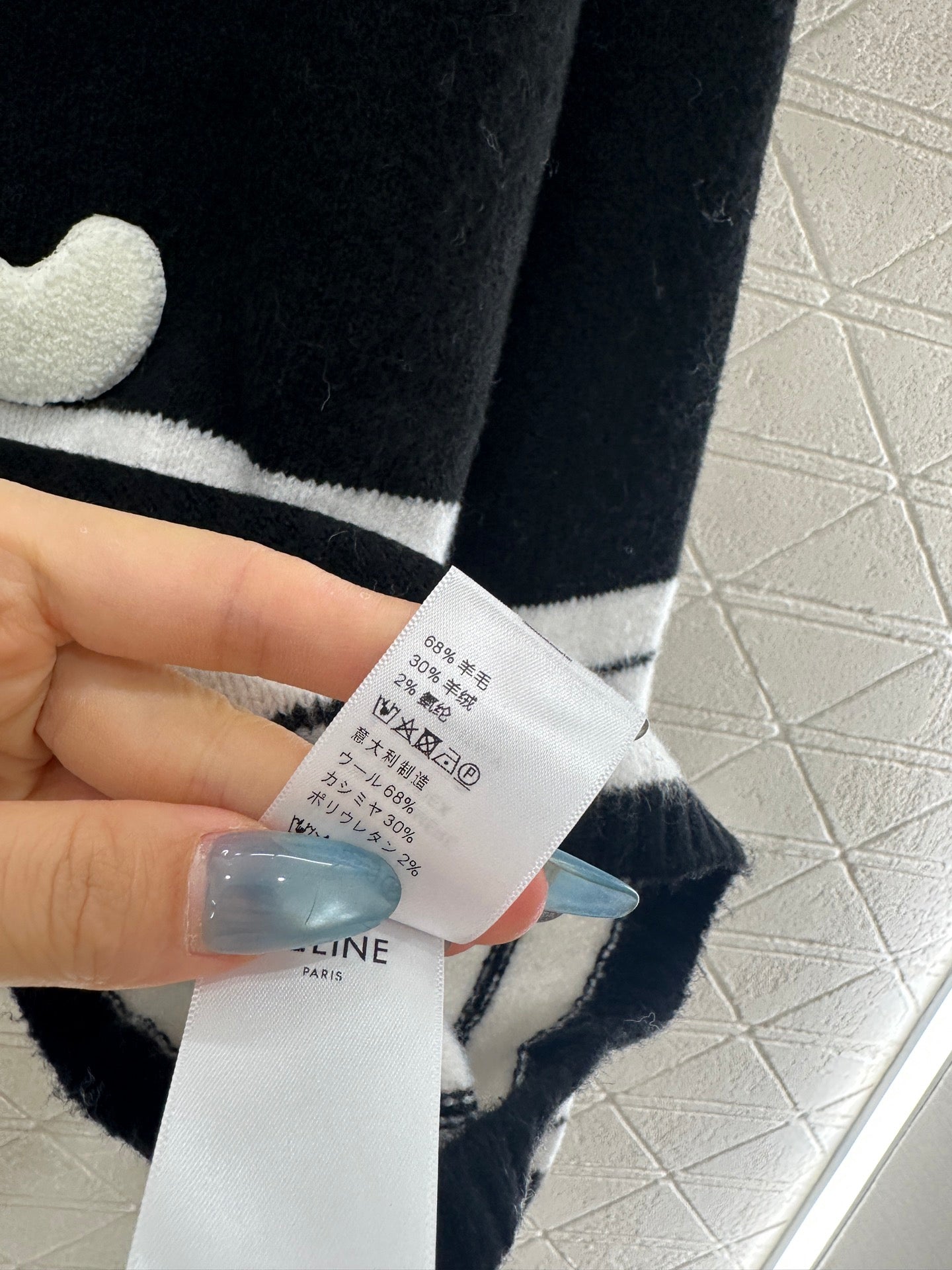 Woolen yarn weaving, comfortable and soft, full of elasticity, V-neck knitted cardigan cutting, finished clothing using advanced threading technology, vertically arranged stripes throughout the body ➕ Irregular black and white contrasting yarn patterns are fully covered, and the front chest is decorated with double C flocking, with delicate and rich layers, adding style to simple outfits. Loose silhouette oversized shoulder design, highlighting the body shape, wearing a slim and stylish look, a versatile item for all seasons.